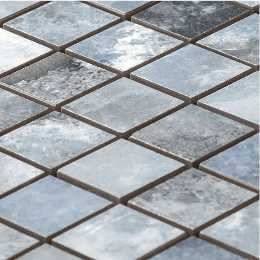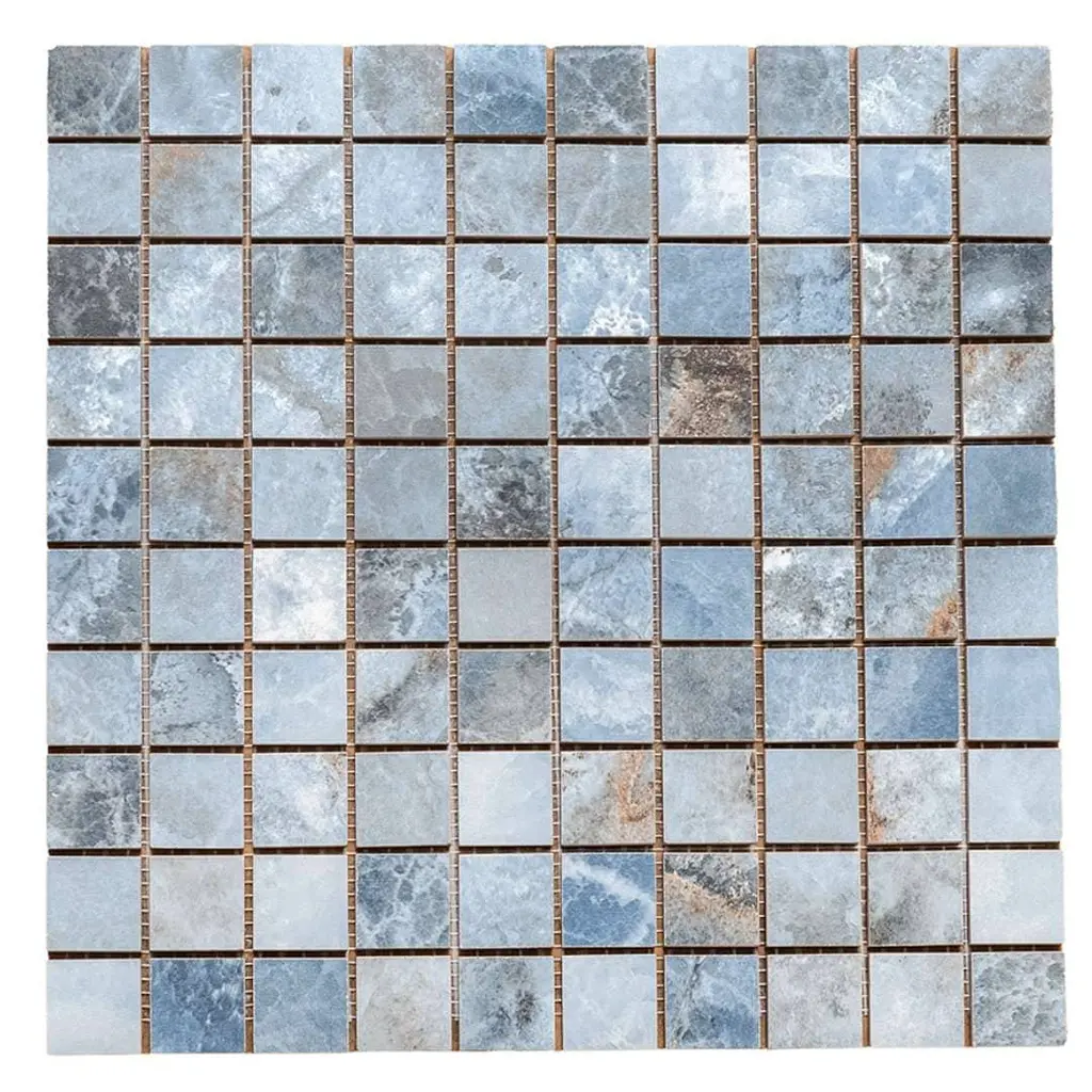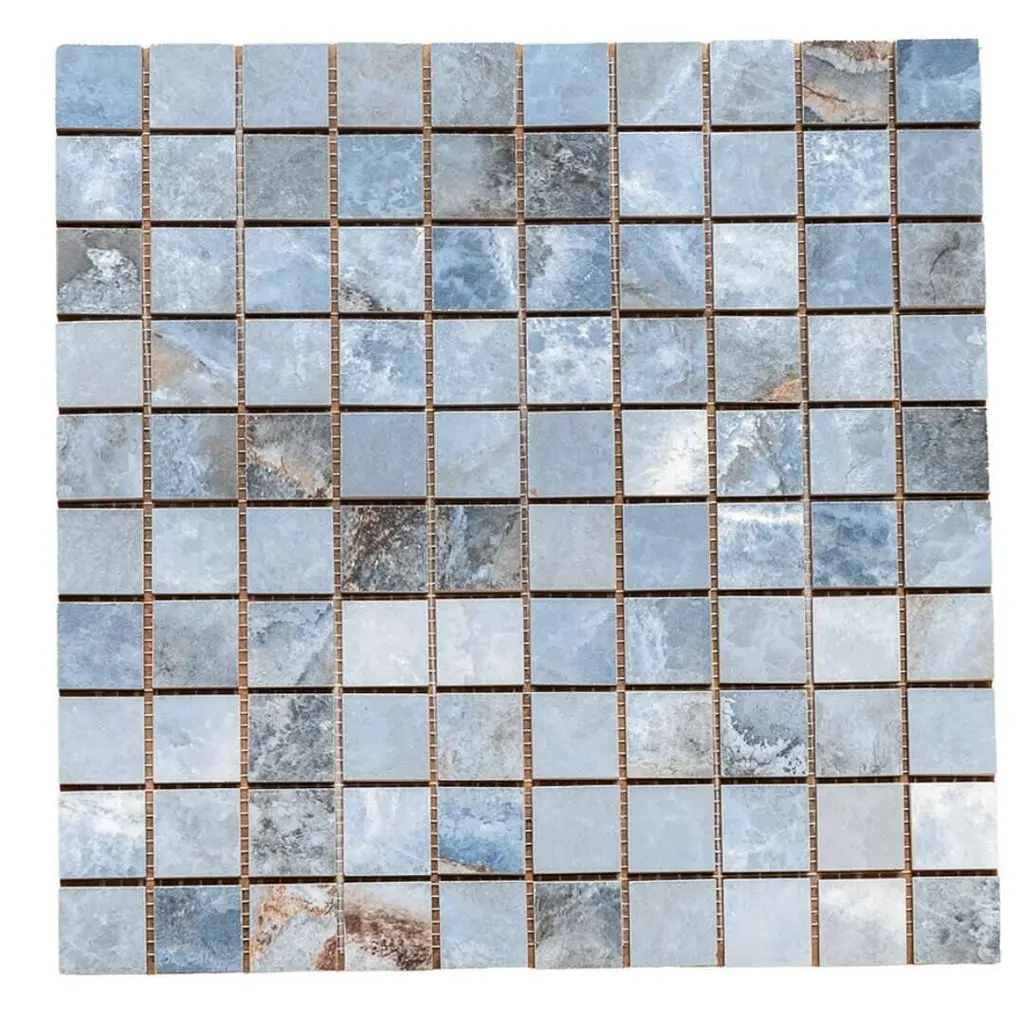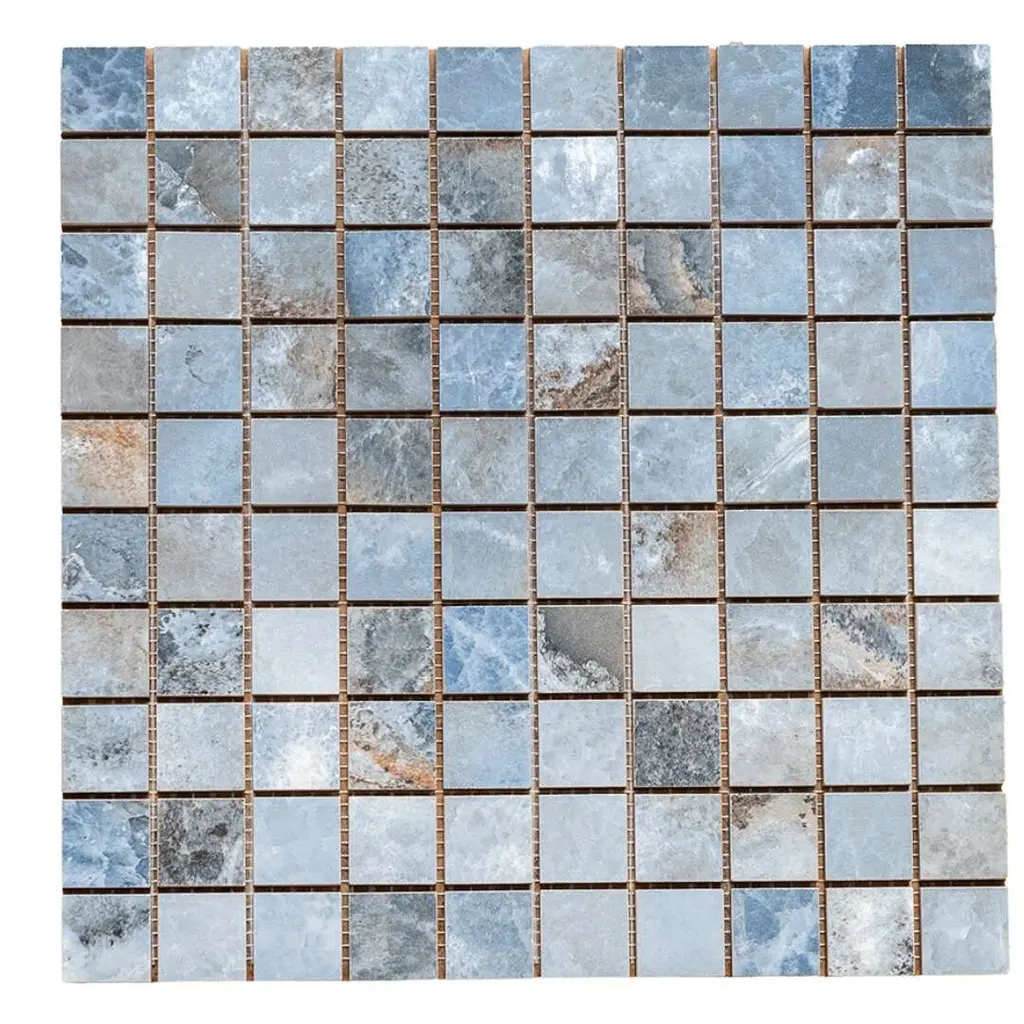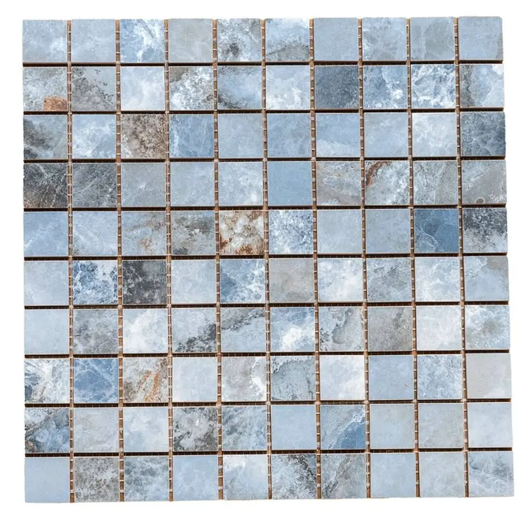 Express your creativity and individuality with the visual appeal of our Banff collection. A testament to the beauty water-colored onyx can bring to your space, this collection is a harmonious blend of artful craftsmanship and natural wonder. Inspired by the mesmerizing luminosity of onyx, each tile showcases alternating layers of color, reminiscent of the rich banded patterns found in the stone's fluid veins. Available in three distinct jewel-toned colors--blue, jade, and white—these tiles serve as a perfect transitional tile for any design aesthetic. The result is a sophisticated, dynamic look that adds depth and character to any space. FEATURES: Crafted in Italy Authentic onyx-inspired design Offered in three jewel-toned colors: jade, white, and blue Designed for interior walls and floors Available in smooth matte or shiny polished finish Each mosaic sheet covers 0.97 square foot (approx.) Porcelain, mesh backed, grid, mosaic, square, matte, rectified, floor and wall tile Impervious and waterproof; Not suitable for outdoor use but are resistant to most elements Matte finish with a V4 substantial variation Ideal for backsplashes, bathrooms, showers, kitchens, floors, walls Approved for residential and commercial installations Easy to install 12 inches x 12 inches decorative grid porcelain mosaic tile PEI Rating: 5 - Heavy duty traffic DIMENSIONS: Mosaic sheet: 12 inches L x 12 inches W Individual tile size: 1 inch L x 1 inch W Surface area per carton: 0.97 square feet Sample tile size: 4 inches L x 4 inches W