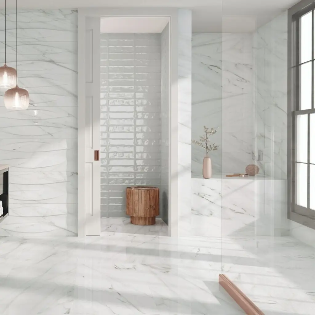 The tile is an elegant range of high quality, large format porcelains that reproduce HD images of beautiful marble slabs sourced from all over the world. It is a polished, rectified porcelain. The rectified edge treatment is ideal for larger tiles calling for thinner grout lines and a more seamless look. FEATURES:DIMENSIONS:
