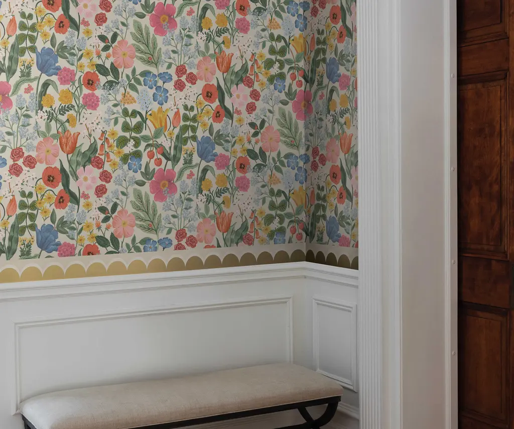 8" x 10" sample of our Blossom wallpaper. Blossom is a rich garden full of bold blooms bursting with color. Tulips sunflowers, cherries, moths and ladybugs are layered together to create a lush botanical print. This wallpaper is gravure printed and comes in 27 inch rolls with a 24 inch repeat.