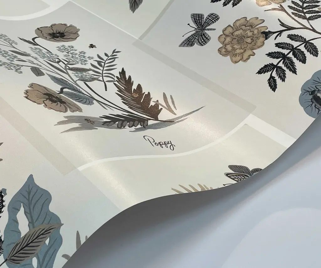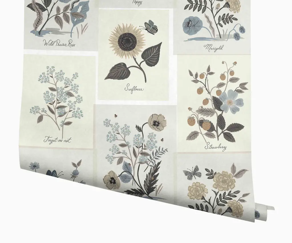 8 × 10" sample of our Botanical Prints wallpaper. Designed to create a pinboard effect, our Botanical Prints wallpaper is an instant inspiration board, perfect for an accent wall or solarium. The illustrated florals were inspired by lithographs found in vintage floral guides. This wallpaper is gravure printed and comes in 27 inch rolls with a 24 inch repeat. Please note that wallpaper samples are cut at random, and pattern placement of the sample you receive will not match the photo featured here.