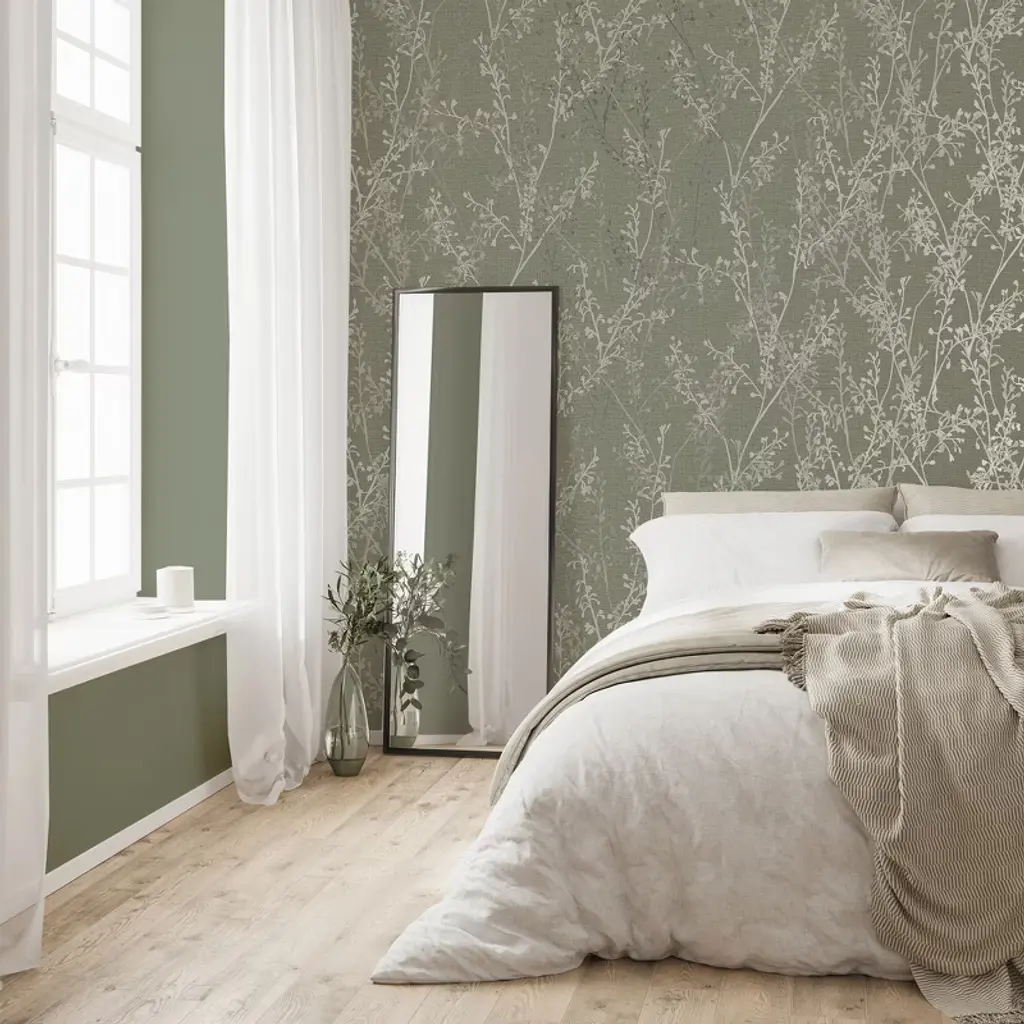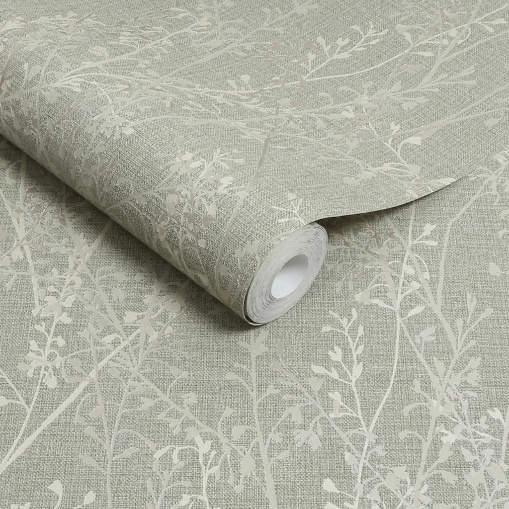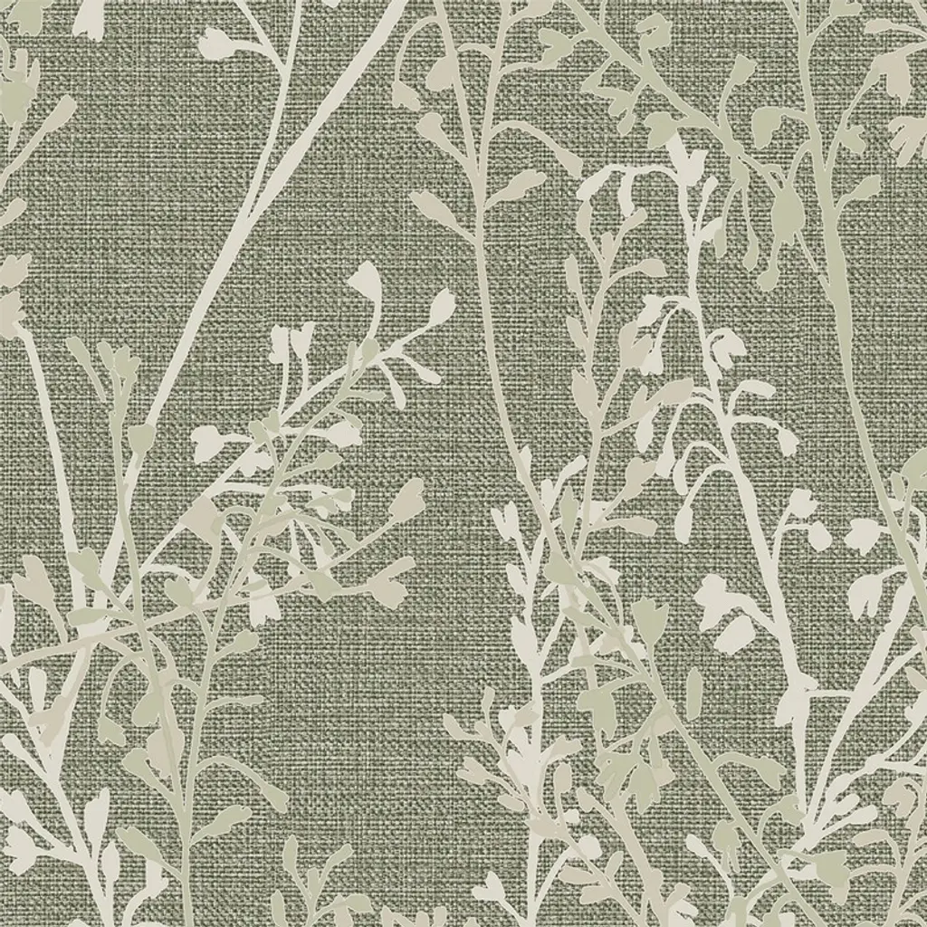A full roll of this product is 20.5 inches wide and 396 inches long. A full roll can cover up to 56 square feet depending on the design match and pattern repeat. A sample of this product is 8 inches by 11 inches. A beautiful design featuring overlaid branches in shades of matte and metallic create a beautiful serene feel in soft sage green and gold combination atop a woven texture with shimmering undertones