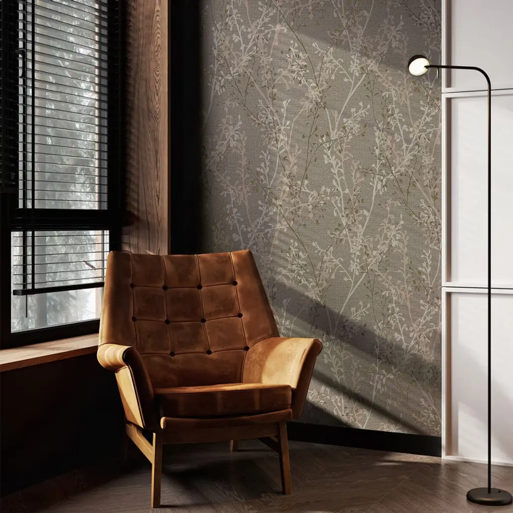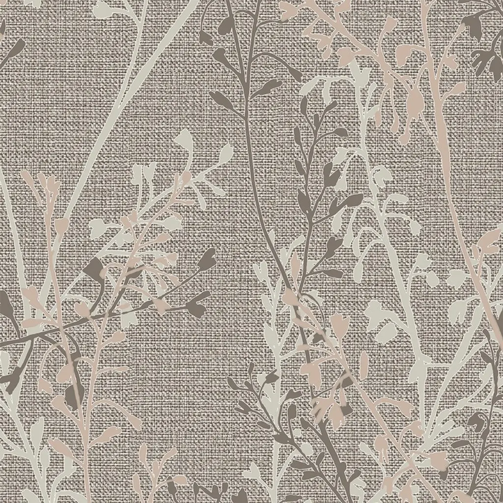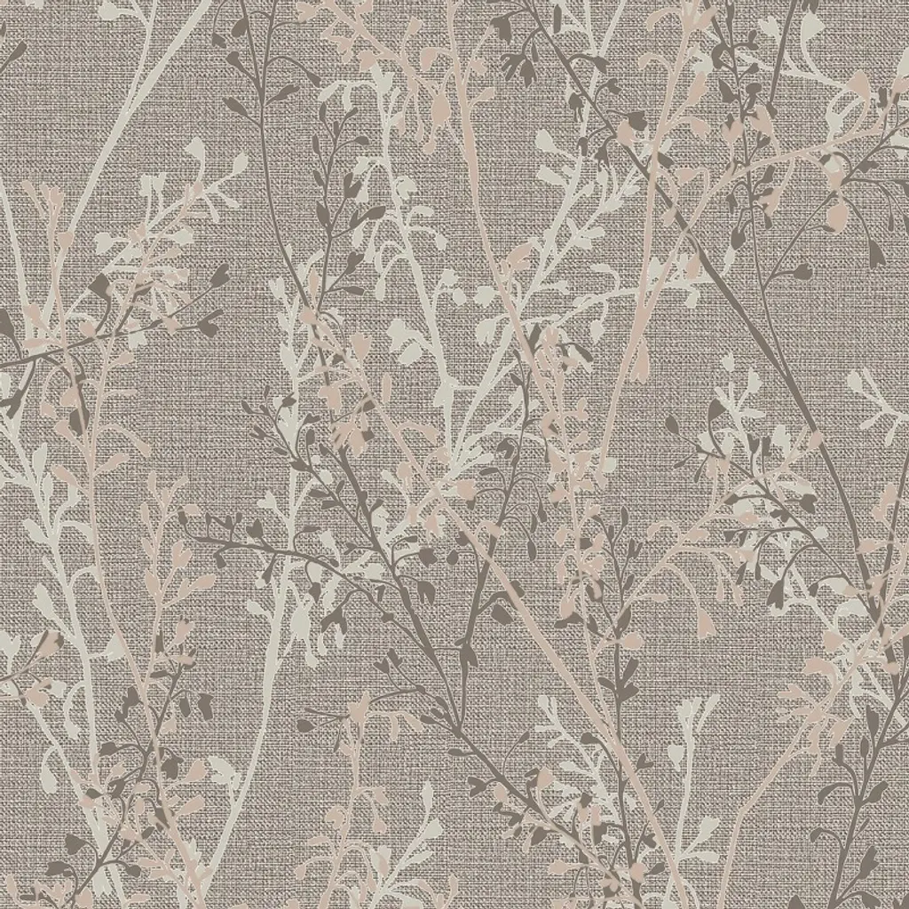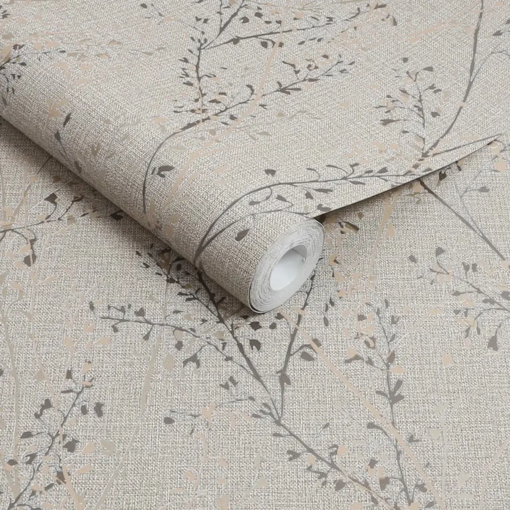 A full roll of this product is 20.5 inches wide and 396 inches long. A full roll can cover up to 56 square feet depending on the design match and pattern repeat. A sample of this product is 8 inches by 11 inches. A beautiful design featuring overlaid branches in shades of matte and metallic create a beautiful serene feel with a warm neutral and gold combination atop a woven texture with shimmering undertones