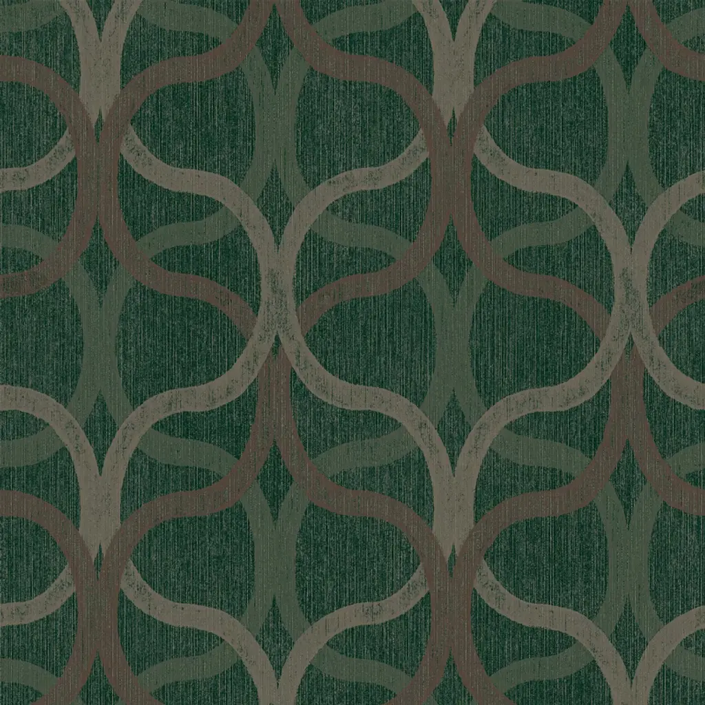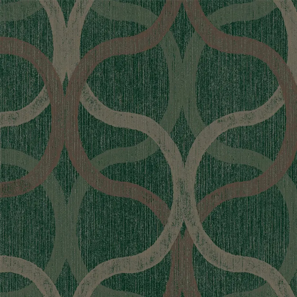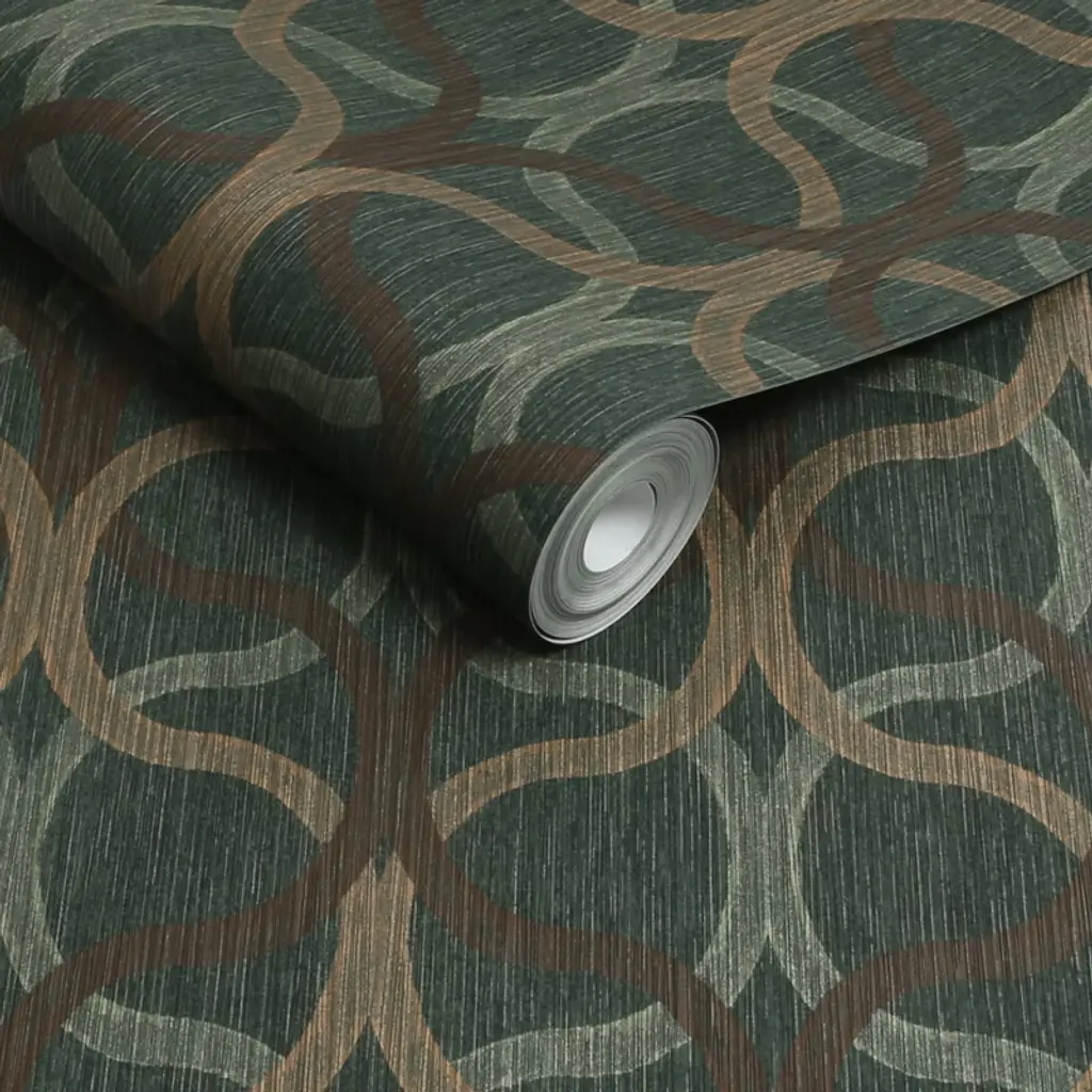 A full roll of this product is 20.5 inches wide and 396 inches long. A full roll can cover up to 56 square feet depending on the design match and pattern repeat. A sample of this product is 8 inches by 11 inches. A beautiful interwoven geometric effect design with metallic highlights and a distressed, surface printed effect with a deep textured heavy vinyl finish in a regal deep green and rose gold combination
