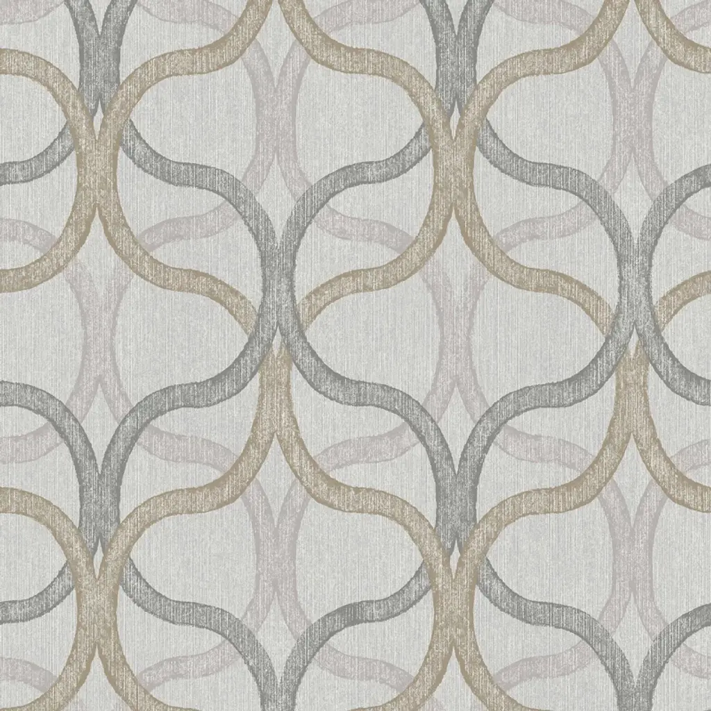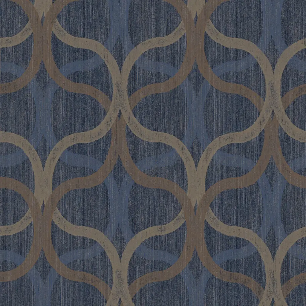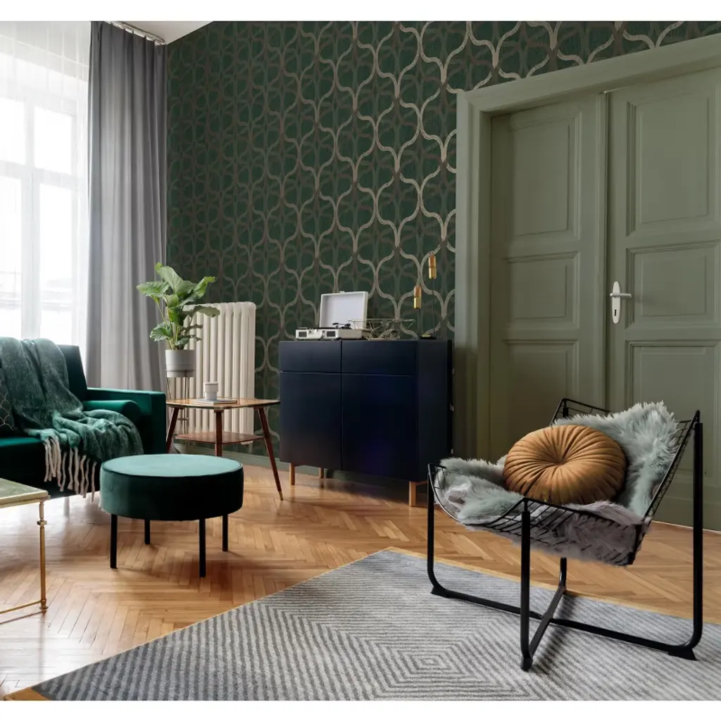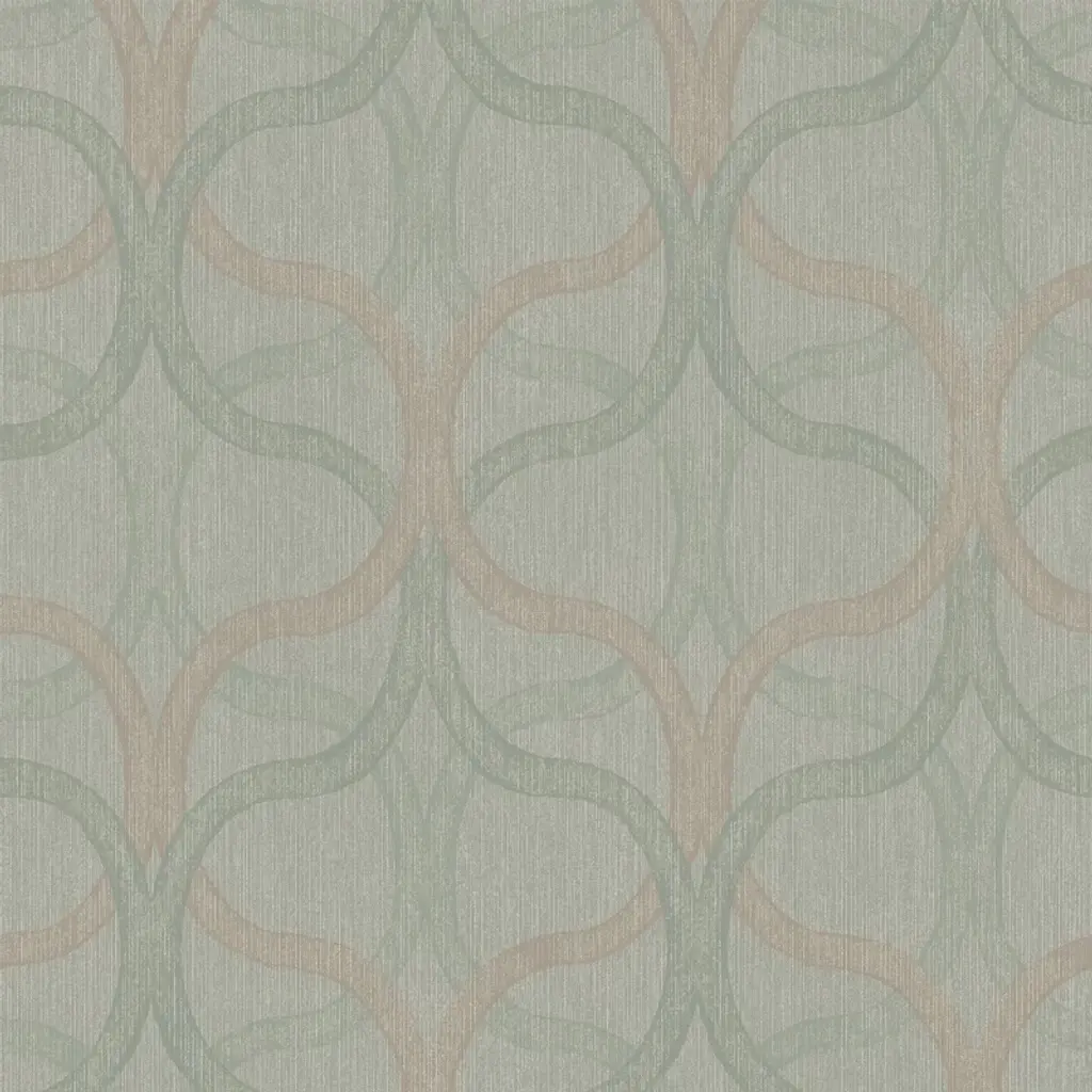 A full roll of this product is 20.5 inches wide and 396 inches long. A full roll can cover up to 56 square feet depending on the design match and pattern repeat. A sample of this product is 8 inches by 11 inches. A beautiful interwoven geometric effect design with metallic highlights and a distressed, surface printed effect with a deep textured heavy vinyl finish in a regal deep green and rose gold combination