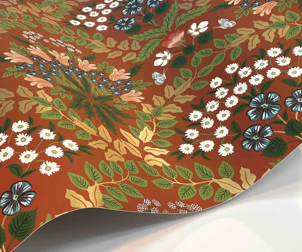 8 × 10" sample of our Bramble wallpaper. Inspired by organic, abstract floral motifs of Art Nouveau textile designs, Bramble is a detailed print that incorporates iconic Rifle Paper Co. floral elements into a mirrored design. This wallpaper is screen printed and comes in 27 inch rolls with a 25.25 inch repeat. Please note that wallpaper samples are cut at random, and pattern placement of the sample you receive will not match the photo featured here.