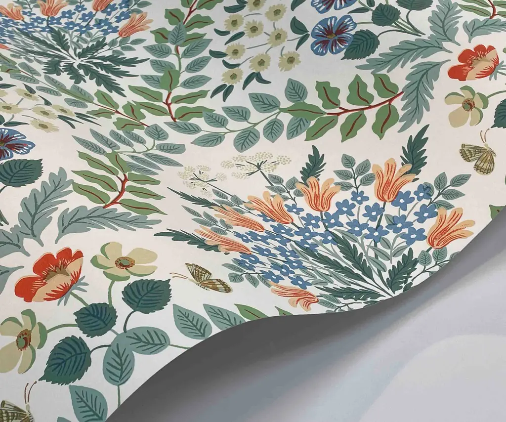 8 × 10" sample of our Bramble wallpaper. Inspired by organic, abstract floral motifs of Art Nouveau textile designs, Bramble is a detailed print that incorporates iconic Rifle Paper Co. floral elements into a mirrored design. This wallpaper is screen printed and comes in 27 inch rolls with a 25.25 inch repeat. Please note that wallpaper samples are cut at random, and pattern placement of the sample you receive will not match the photo featured here.
