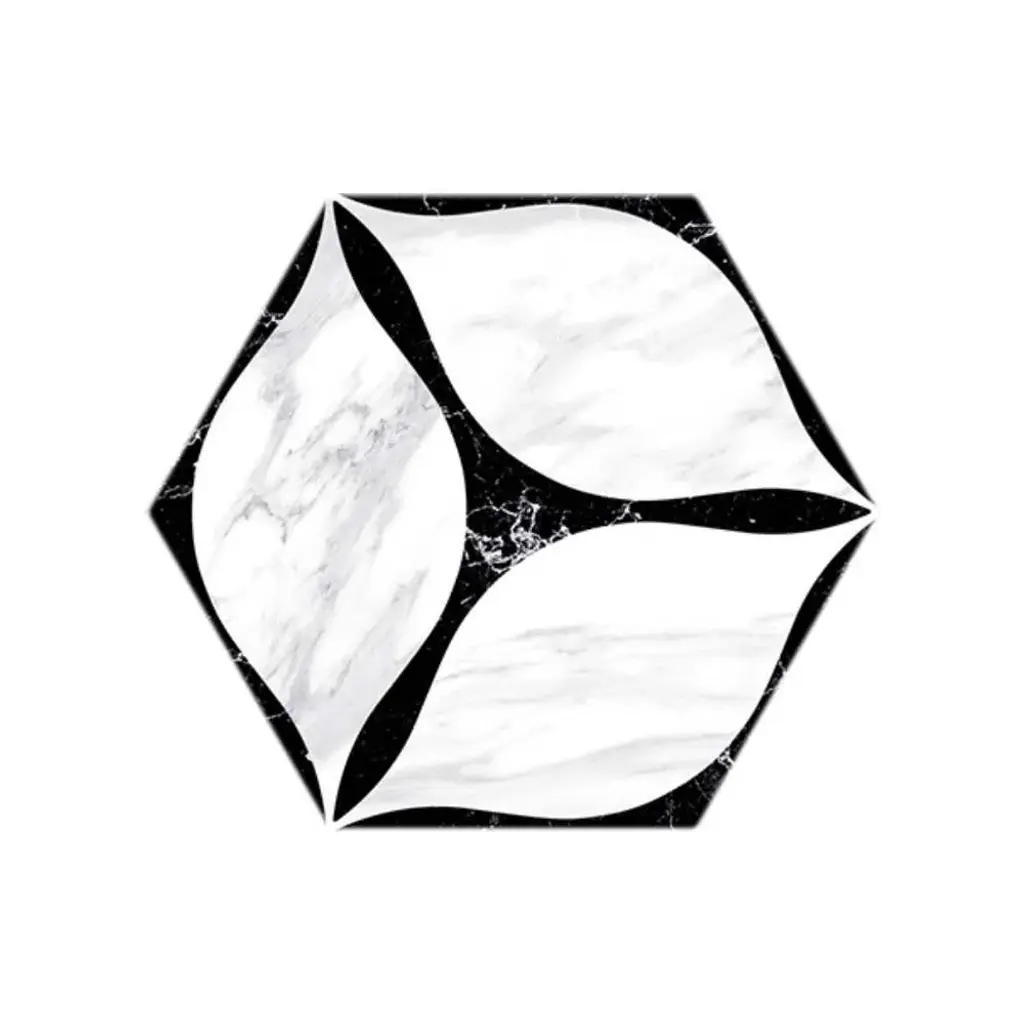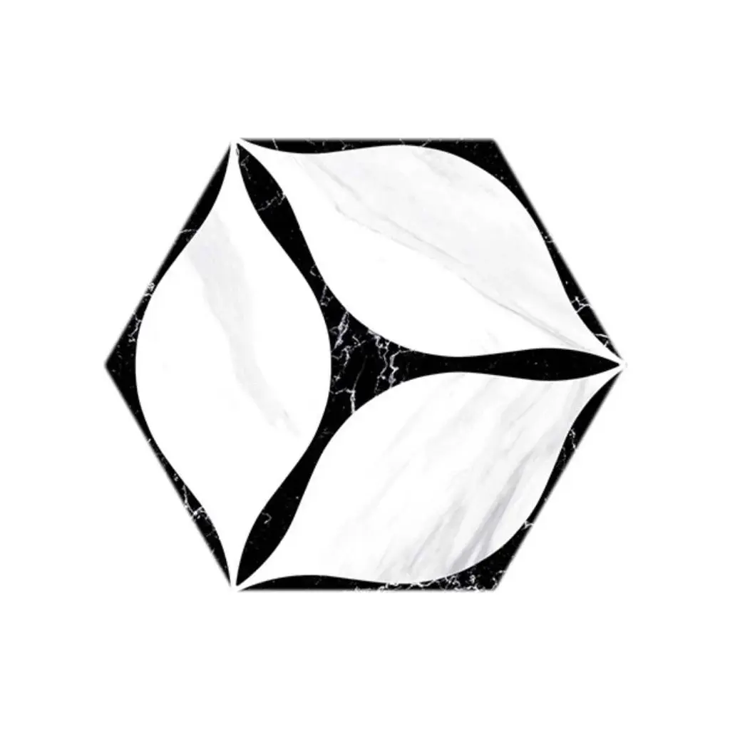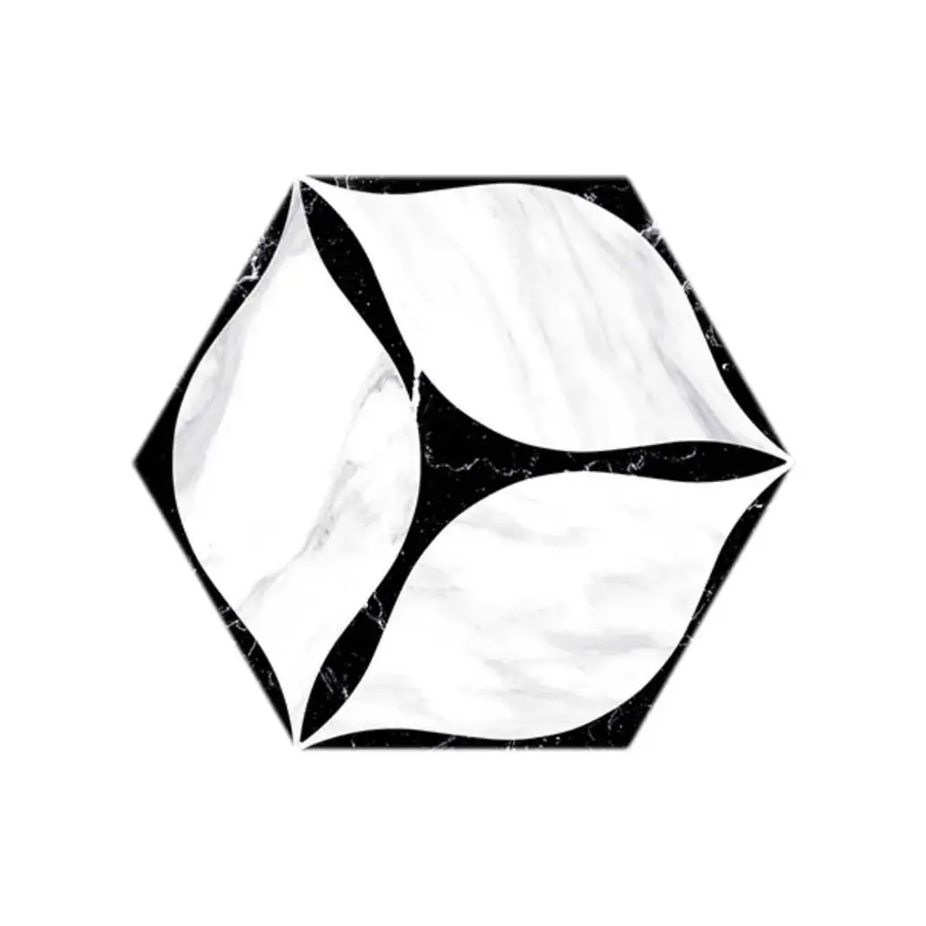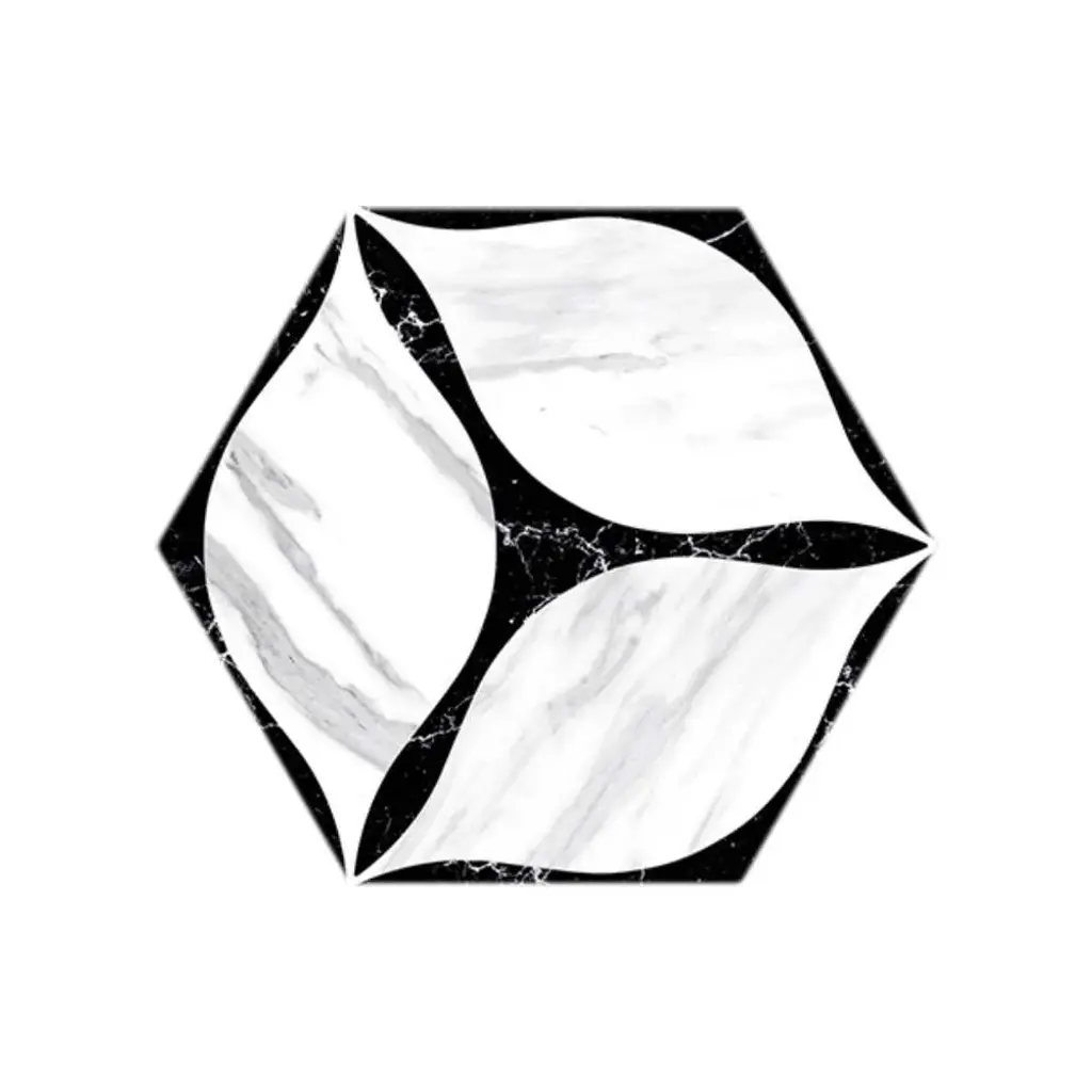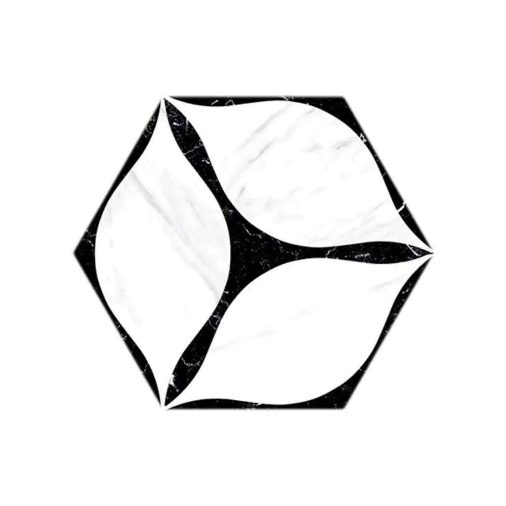 The Tile Life Capricho 8" x 9" Black Porcelain Floor and Wall Tile reinterprets the classic hexagon form with a curved outline and a unique linear pattern. When placed in a set, this tile presents a striking floral design, adding visual interest to any space. Capricho's stark contrast between its marbled background and bold black lines creates an artfully playful tile perfect for any midcentury modern home renovation.FEATURES