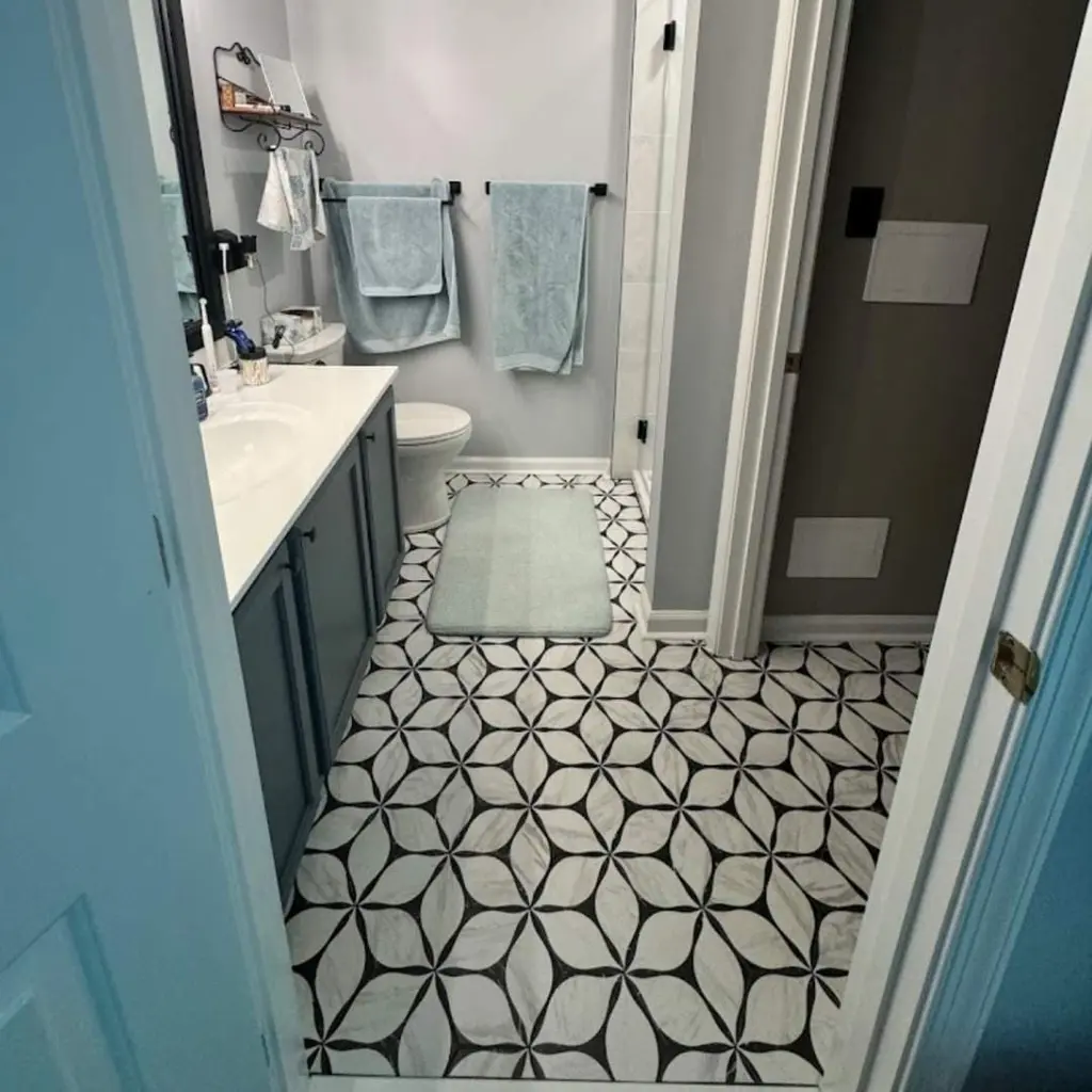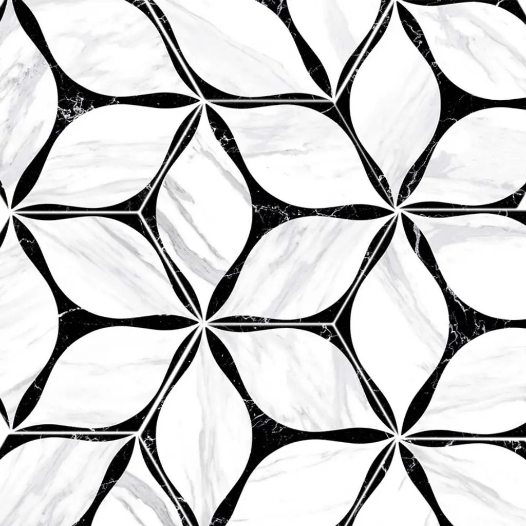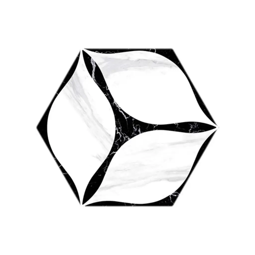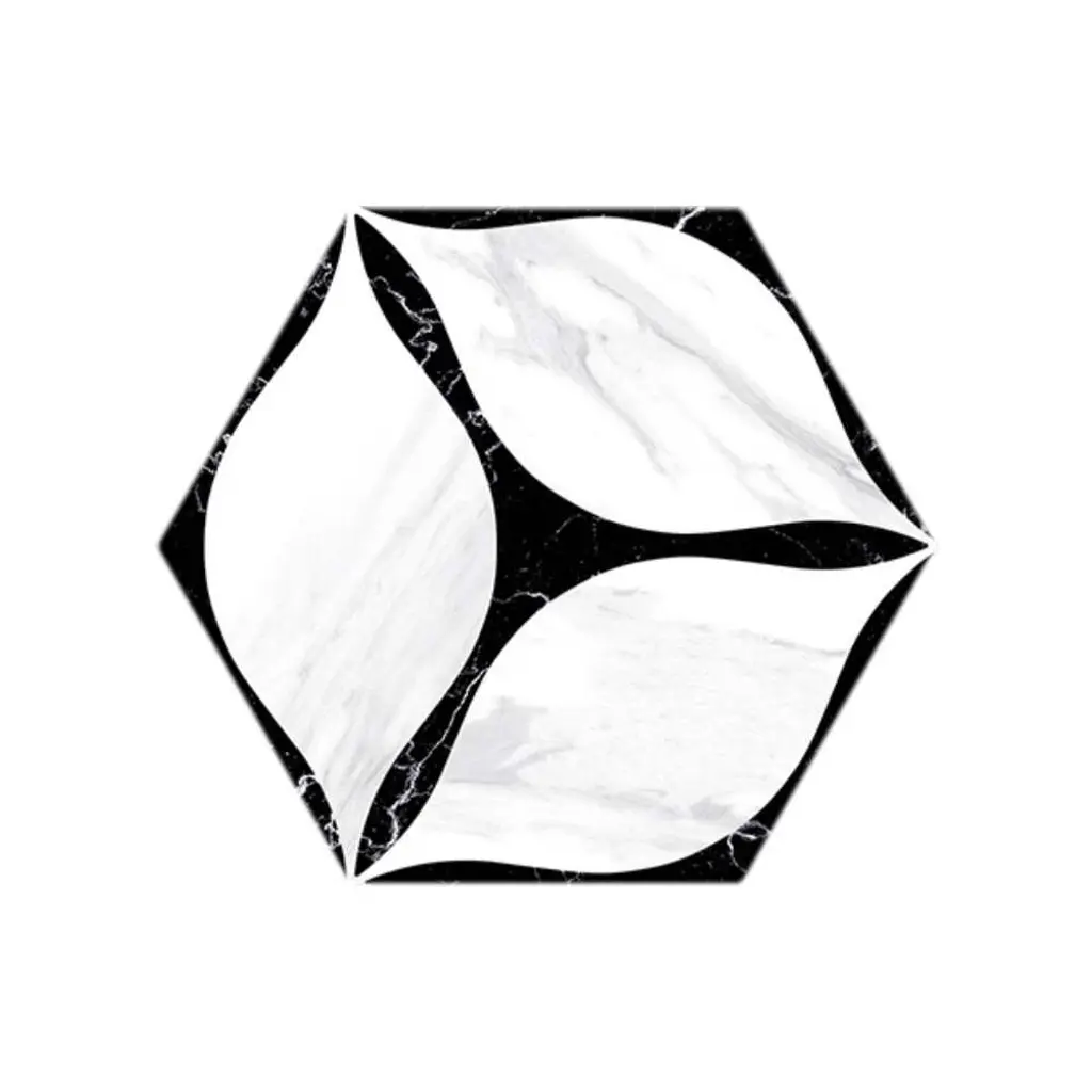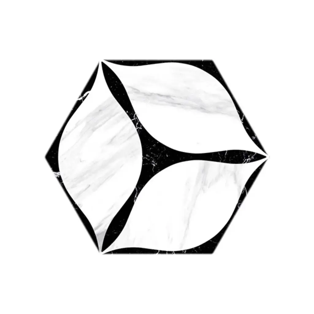 The Tile Life Capricho 8" x 9" Black Porcelain Floor and Wall Tile reinterprets the classic hexagon form with a curved outline and a unique linear pattern. When placed in a set, this tile presents a striking floral design, adding visual interest to any space. Capricho's stark contrast between its marbled background and bold black lines creates an artfully playful tile perfect for any midcentury modern home renovation.FEATURES