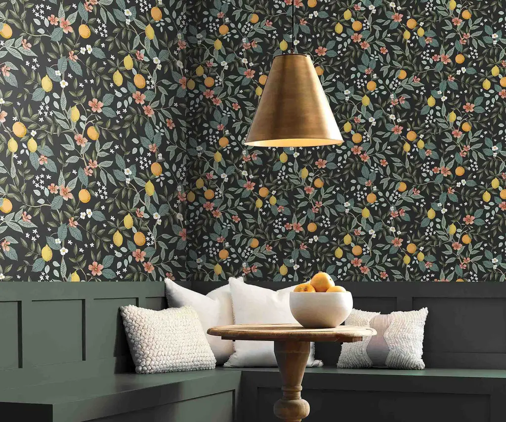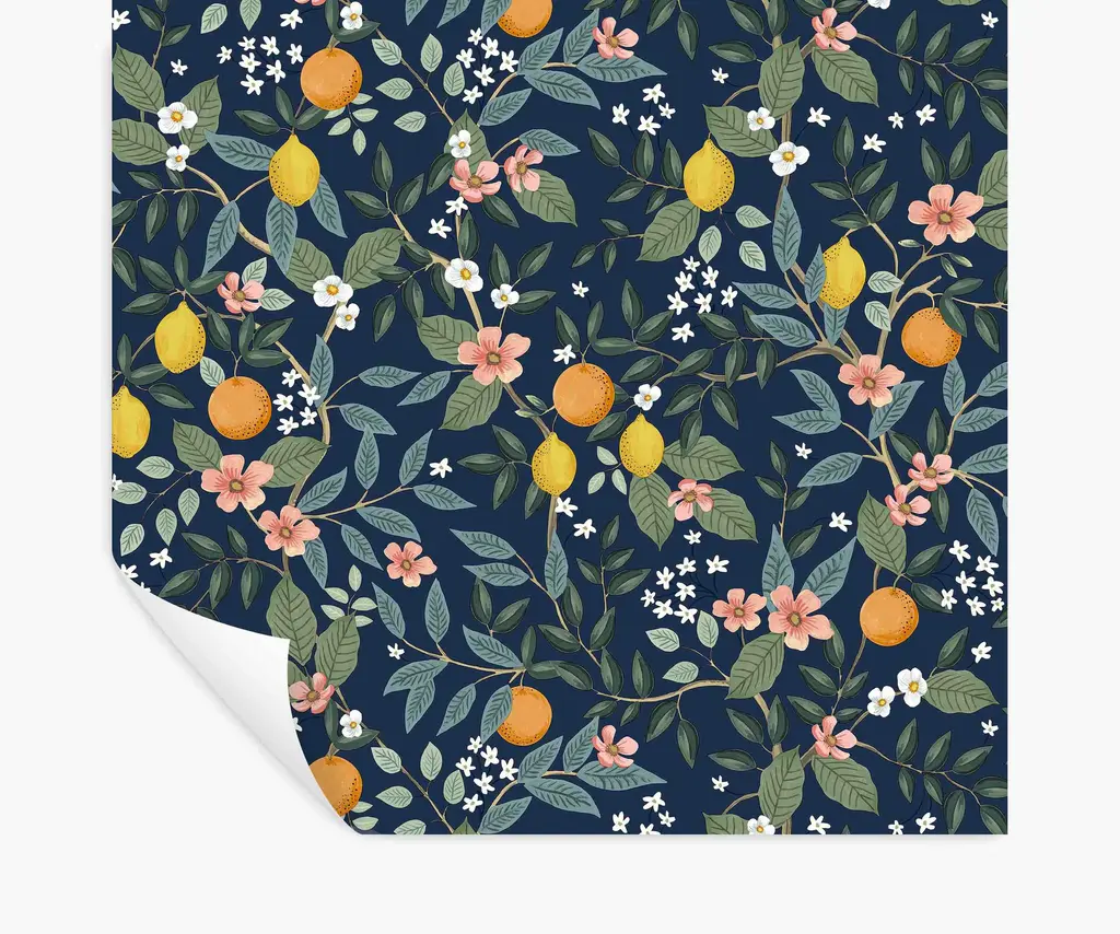 8 × 10" sample of our Citrus Grove peel & stick wallpaper. The branches of Citrus Grove are laden with ripe lemons and oranges, and punctuated by tiny blooms. Please note that wallpaper samples are cut at random, and pattern placement of the sample you receive will not match the photo featured here.