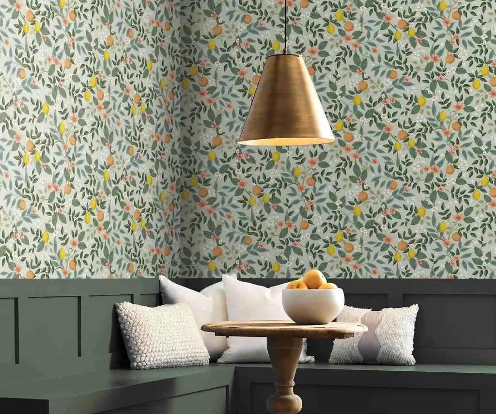 8 × 10" sample of our Citrus Grove peel & stick wallpaper. The branches of Citrus Grove are laden with ripe lemons and oranges, and punctuated by tiny blooms. Please note that wallpaper samples are cut at random, and pattern placement of the sample you receive will not match the photo featured here.