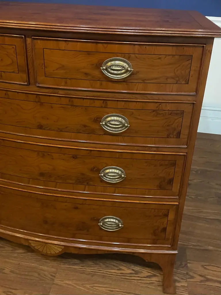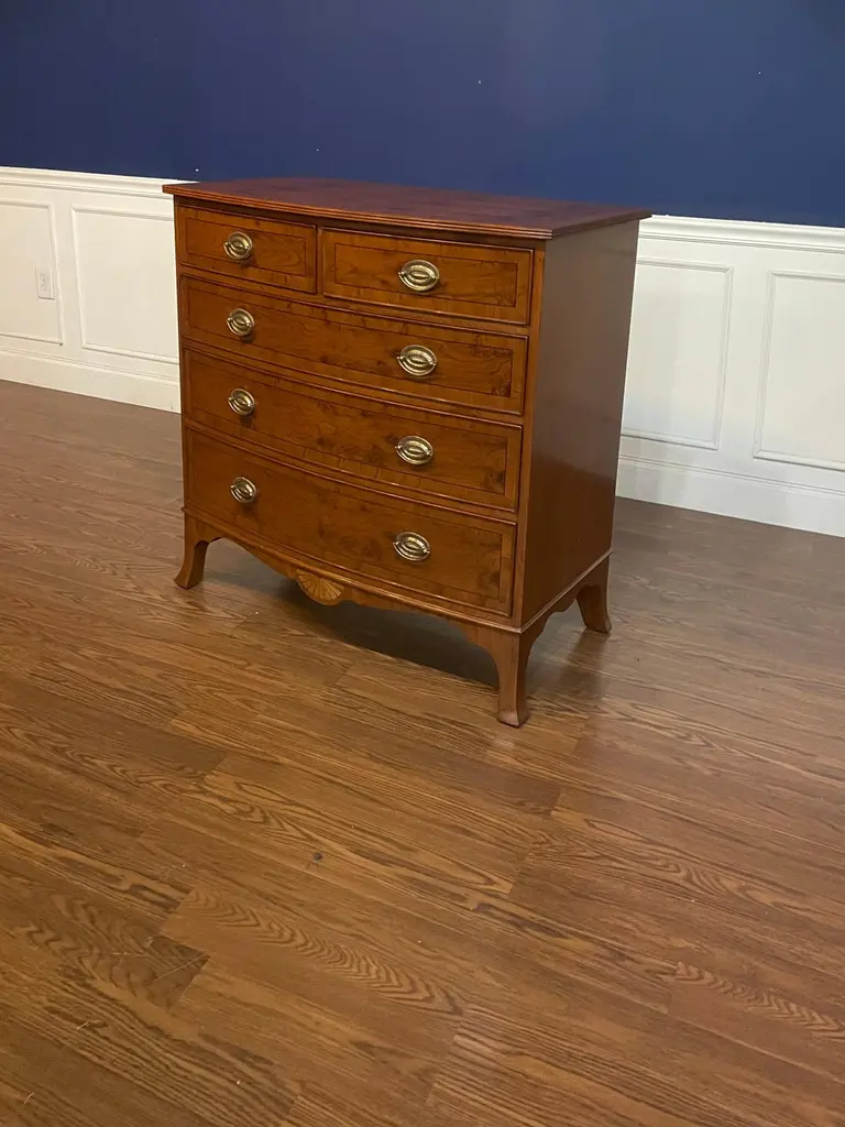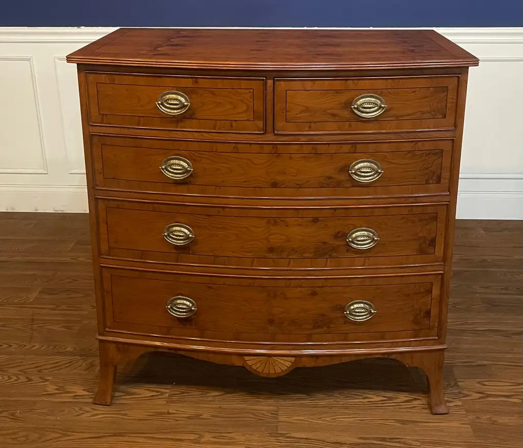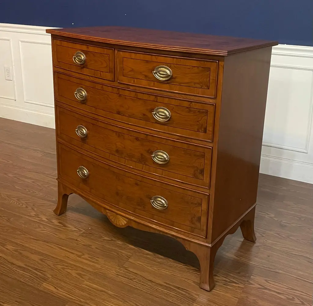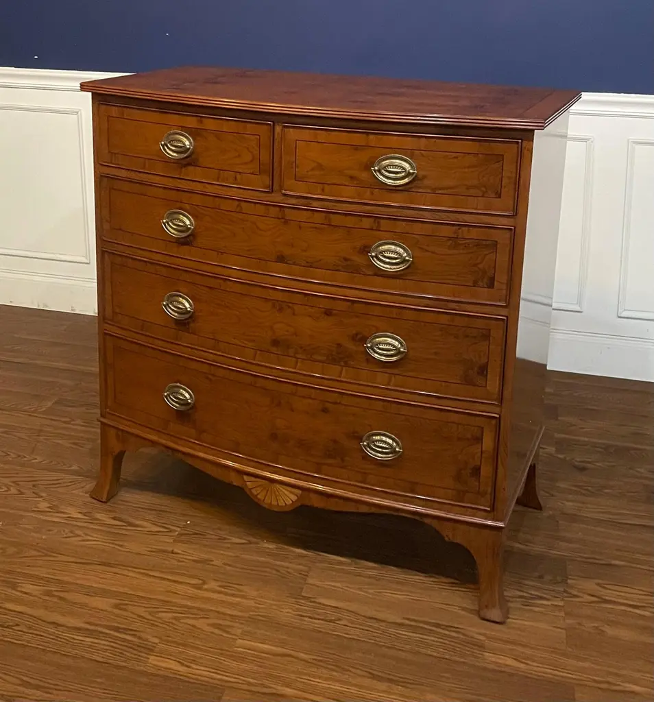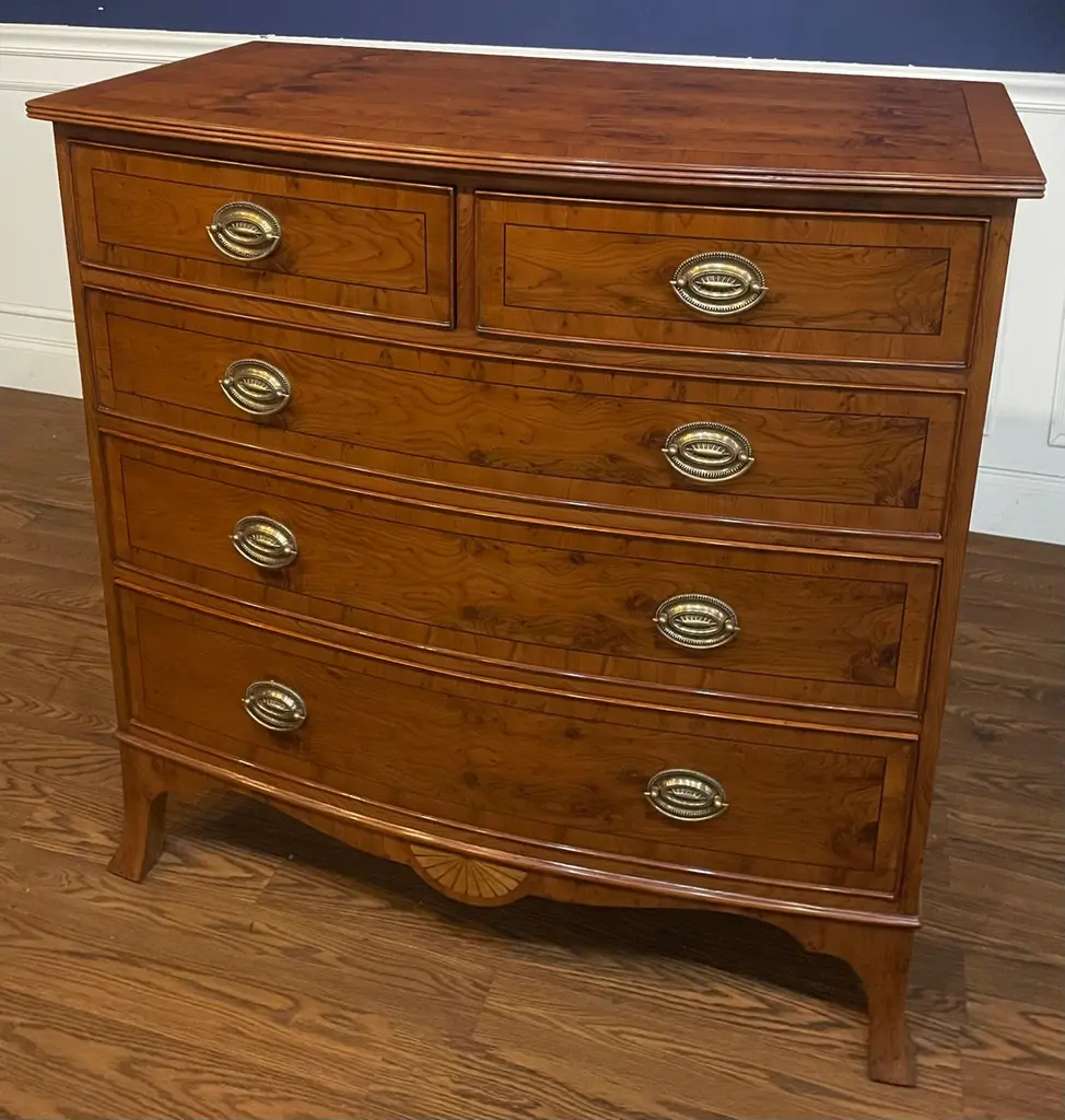 This is a classic Yew wood inlaid bow front chest by Leighton Hall. Its design was inspired by Adams style chests from the early 1800s. It features five drawers, solid brass hardware and faux key holes. The drawer fronts and top have Yew wood with inlays. The drawers are dovetailed and oak lined. It has a hand steel wool rubbed satin finish. Suggested retail price of this chest is $6,188.Dimensions: W=39”; D=21”; H=39.385”Options: Optional wood: Mahogany, Yew wood (as shown), Walnut, Other Optional hardware Optional finishesNotes: Options my affect pricing Due to some raw materials shortages, some options are not currently available.