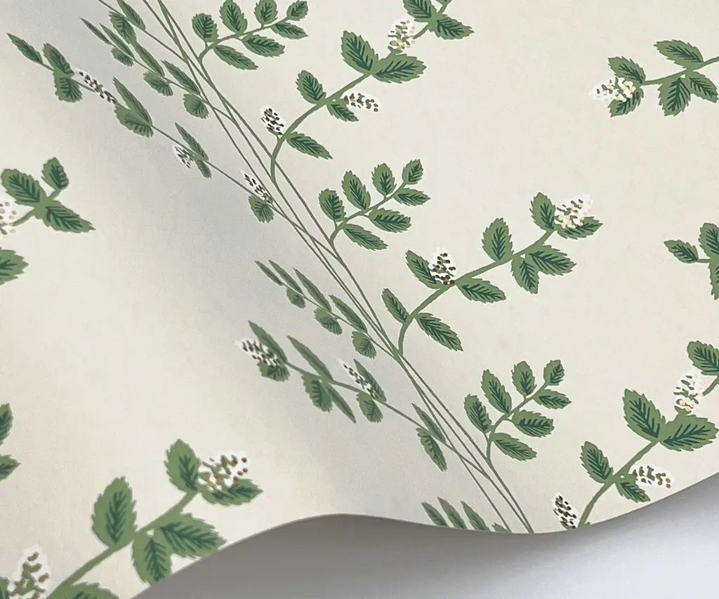 8" x 10" sample of our Climbing Vines wallpaper. Climbing Vines is a design of delicate leaves growing in a botanical take on a vertical stripe, dotted with little white flowers. This wallpaper is screen printed and comes in 27 inch rolls with a 24.25 inch repeat.