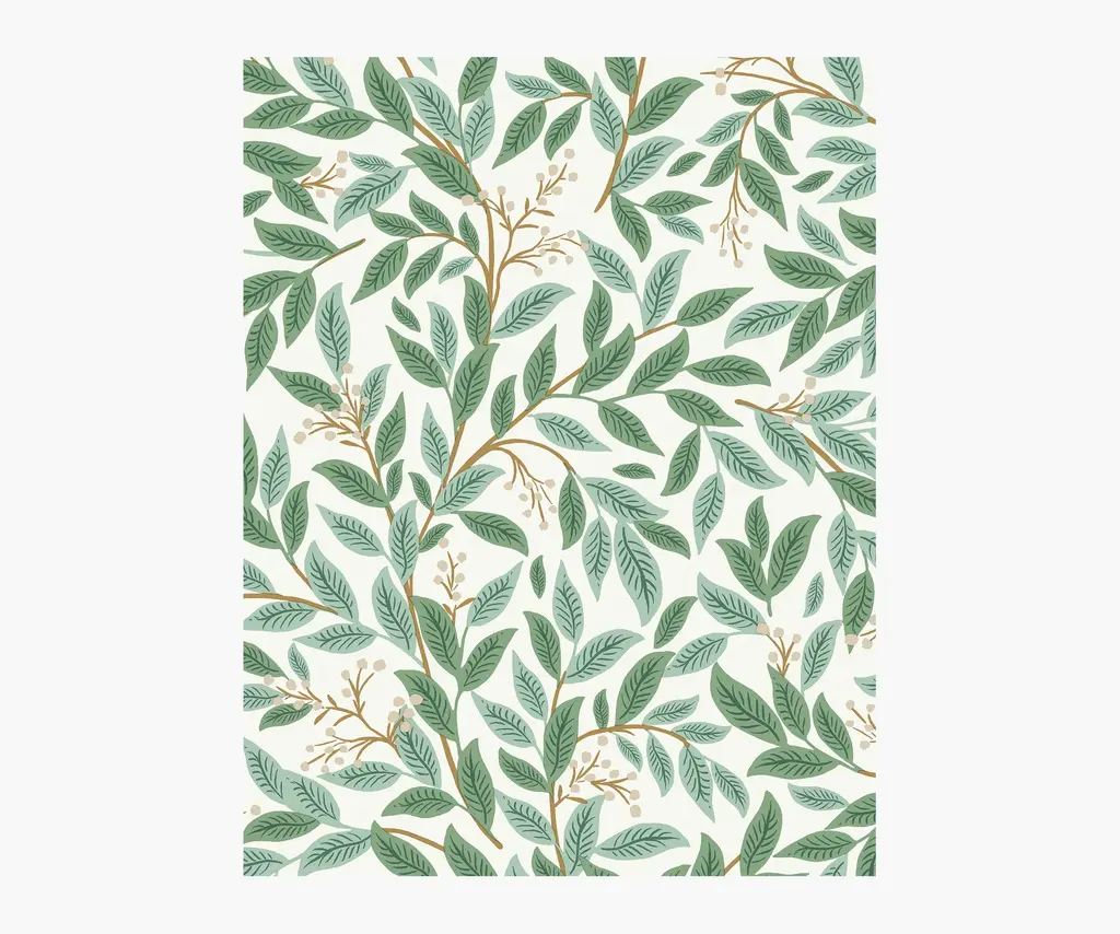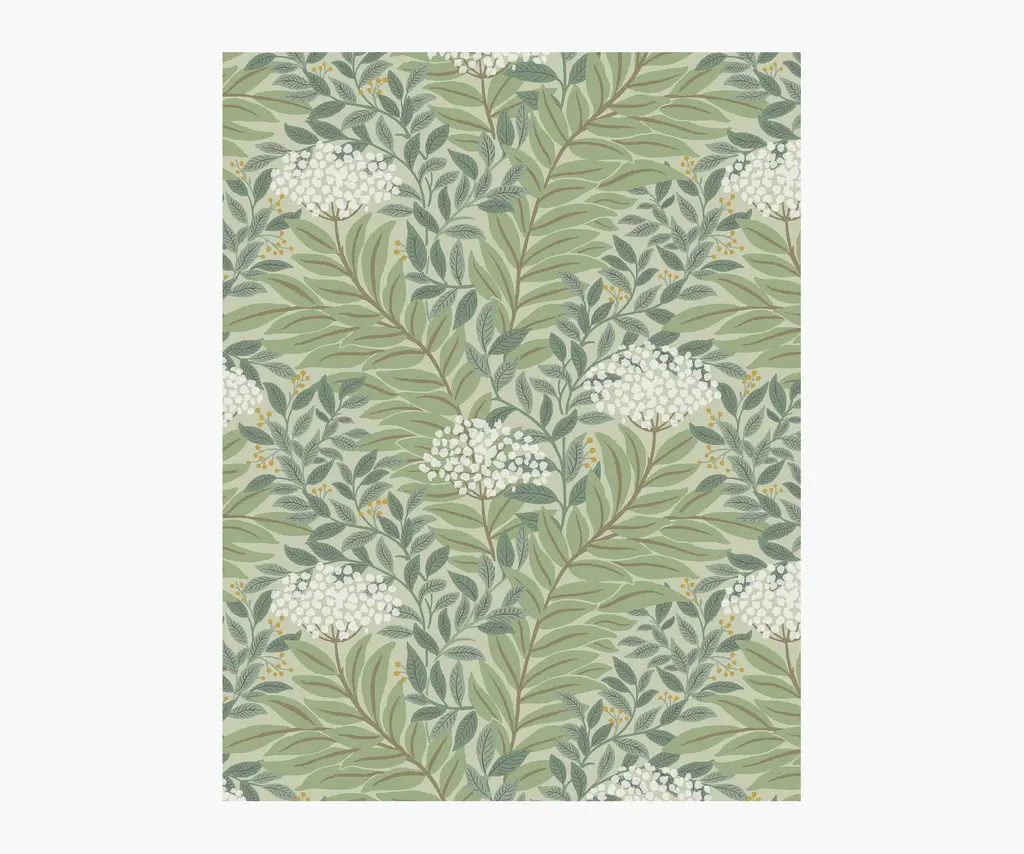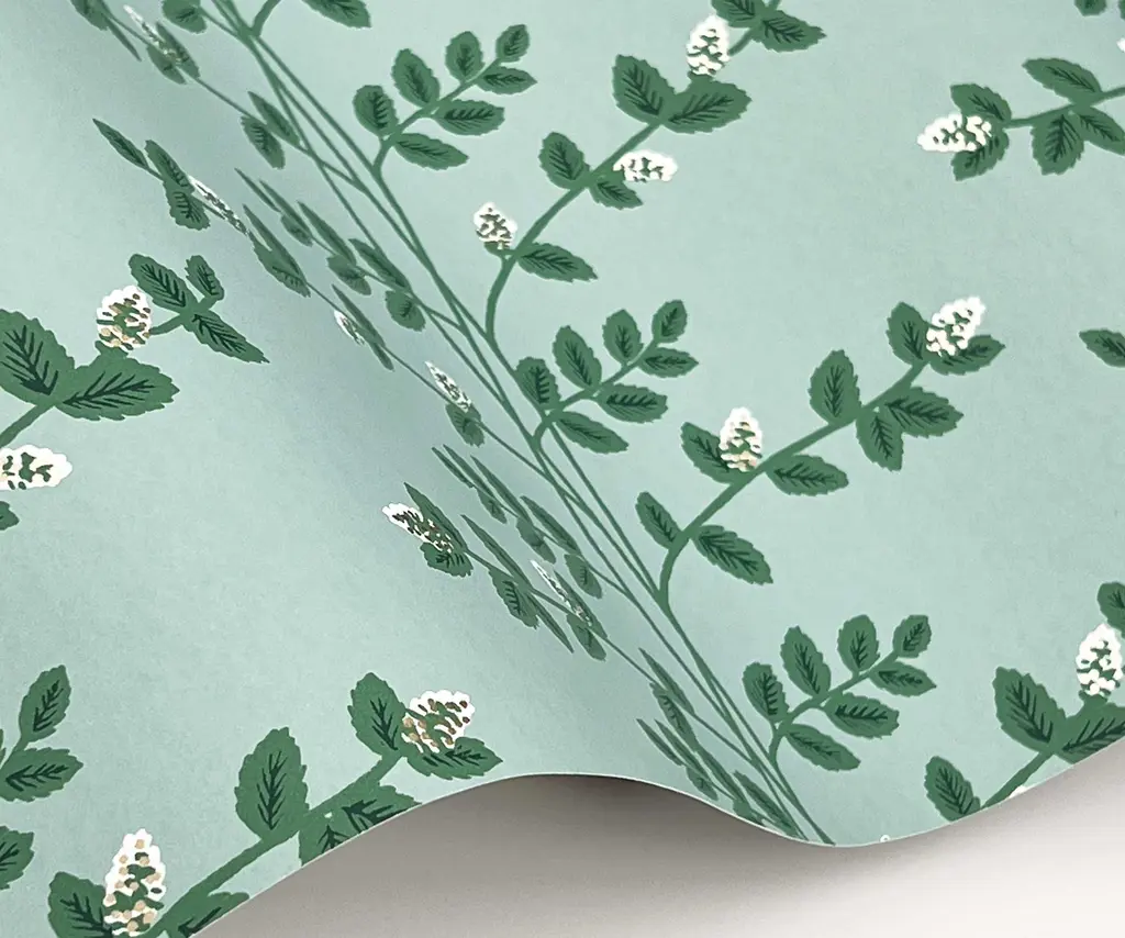 8" x 10" sample of our Climbing Vines wallpaper. Climbing Vines is a design of delicate leaves growing in a botanical take on a vertical stripe, dotted with little white flowers. This wallpaper is screen printed and comes in 27 inch rolls with a 24.25 inch repeat.