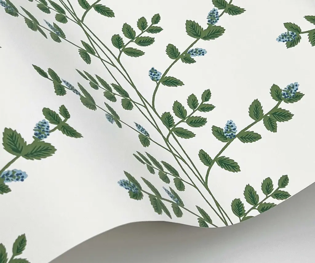 8" x 10" sample of our Climbing Vines wallpaper. Climbing Vines is a design of delicate leaves growing in a botanical take on a vertical stripe, dotted with little white flowers. This wallpaper is screen printed and comes in 27 inch rolls with a 24.25 inch repeat.