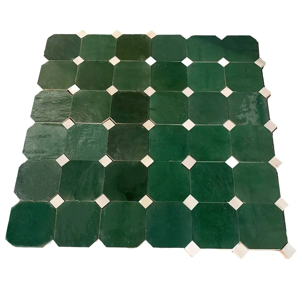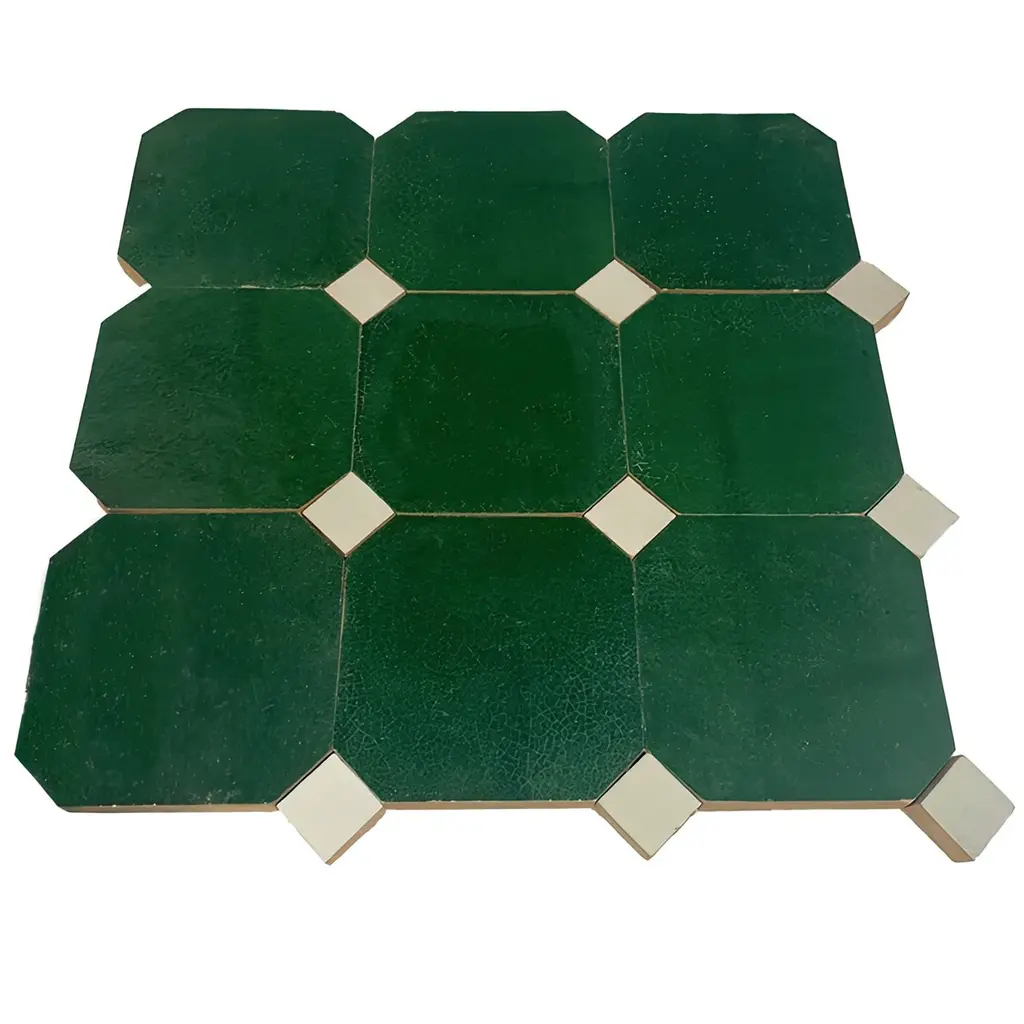Our new contemporary zellige patterns feature handcrafted tiles that are water jet cut and glued by hand to a mesh backing — making installation a breeze. These tiles are made with our standard 4" x 4" zellige tile cut into octagons and accented with small white diamonds. This stunning pattern has been used for hundreds of years and will never be out of style.SAMPLE IS ONLY A 4X4-IN PIECE. Brand: Moroccan Mosaic and Tile House Type/style: Floor and Wall Tile Materials: mesh backing zellige tile Dimensions: 12 inches long x 12 inches wide x 0.5 inches thick (each) Square footage per tile/ box: 1 tile=1 square foot, 8 tiles per box (8 sq. ft. per box) Installation: Professional installation is recommended. Pack/case of: 8 tiles per box Handmade, durable, Indoors/ Outdoor, high quality materials, environmentally responsible and resource efficient, low maintenance **Please note: That each tile is hand made individually and minor variations in color, or surface texture are natural characteristics of all our Handmade tile and it's also part of the Charm.Story Behind the Art: "It's more than tile, it's art." That simple statement is what sets the craftsmanship of Moroccan Mosaic apart from the rest. Based in the small city of Sale, Moroccan Mosaic is a family business going back 4 generations. When Simo, the current head of the business graduated from university in New York, he had little interest in the family business. But on a return trip home, he saw that the business was not doing well and set about reviving it. One important change he made was introducing black, grey, and white designs to appeal to American and European customers. It worked. When he started, they employed 2 workers and now they have nearly 80 on staff. The workshop itself is fairly simple, and the techniques used to create the tiles are steeped in tradition. Some modern equipment is available, though the workers prefer to use the more rustic tools. The creative process is time intensive and done by hand, as Simo insists on no corners be cut or production be rushed. Environmentally responsible and resource efficient, no chemicals are used at any step. For example, colors used come from nature literally. Green comes from mint leaves, orange from orange peel, and black from charcoal. The tiles themselves are a simple mixture of cement, sand, and granite powder. Moroccan Mosaic hires only local workers, teaching them a valued skill as well as paying them fair wages. Simo's goals for his business are to share the tradition of gorgeous Moroccan tile, grow the business, and employ more and more workers. What is Worldstock? The handcrafted touch of artisan skill will create variations in color, size and design. Color differences may occur between the actual product and your computer screen. If buying two of the same item, slight differences will occur from piece to piece. Imported Please note: Orders over 180-pounds or in 7 or more boxes will be shipped via Freight carrier and our Oversized Item Delivery/policy will apply. Please click here for more information.