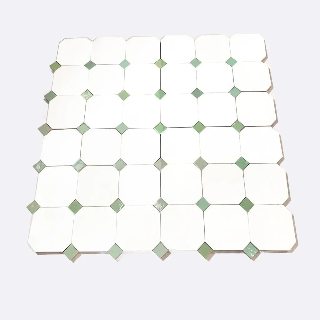 Our new contemporary Zellige patterns feature handcrafted tiles that are water jet cut and glued by hand to a mesh backing making installation a breeze. These tiles are made with our standard 4" x 4" Zellige tile cut into octagons and accented with small blue diamonds. This stunning pattern has been used for hundreds of years and will never be out of style.Story Behind the Art: "It's more than tile, it's art." That simple statement is what sets the craftsmanship of Moroccan Mosaic apart from the rest. Based in the small city of Sale, Moroccan Mosaic is a family business going back 4 generations. When Simo, the current head of the business graduated from university in New York, he had little interest in the family business. But on a return trip home, he saw that the business was not doing well and set about reviving it. One important change he made was introducing black, grey, and white designs to appeal to American and European customers. It worked. When he started, they employed 2 workers and now they have nearly 80 on staff. The workshop itself is fairly simple, and the techniques used to create the tiles are steeped in tradition. Some modern equipment is available, though the workers prefer to use the more rustic tools. The creative process is time intensive and done by hand, as Simo insists on no corners be cut or production be rushed. Environmentally responsible and resource efficient, no chemicals are used at any step. For example, colors used come from nature literally. Green comes from mint leaves, orange from orange peel, and black from charcoal. The tiles themselves are a simple mixture of cement, sand, and granite powder. Moroccan Mosaic hires only local workers, teaching them a valued skill as well as paying them fair wages. Simo's goals for his business are to share the tradition of gorgeous Moroccan tile, grow the business, and employ more and more workers.
