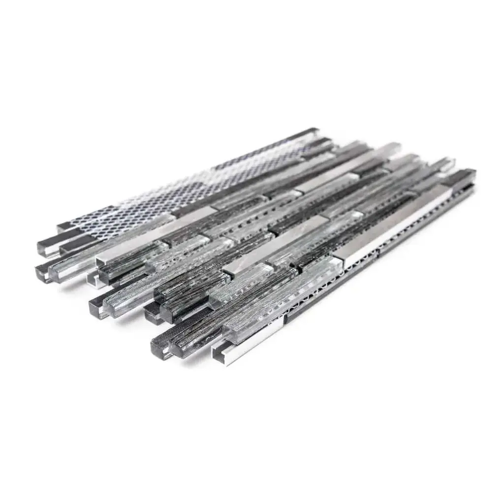 The Tile Life Cosmos Sleek 1 inches x 3 inches Glass Mosaic Wall Tile has the smooth, clean finish of glass but still adds visual texture with the reflective metallic pattern. Add some shine and uniqueness with the Cosmos glass tile series. The Cosmos collection is available in various formats, including a 3 inches x 6 inches subway, a hexagon mosaic, and a sleek brick mosaic. This glass mosaic tile is perfect for any home designer looking to spark intrigue in their home through unique tiling. The Cosmos 1" x 3" sleek glass mosaic wall tiles are approved for both residential and commercial indoor installations, including backsplashes, bathrooms, kitchens, and walls. Available in Black, Brown, Bronze, Diamond, and Silver, they offer a stylish and versatile option for any space. FEATURES:DIMENSIONS: