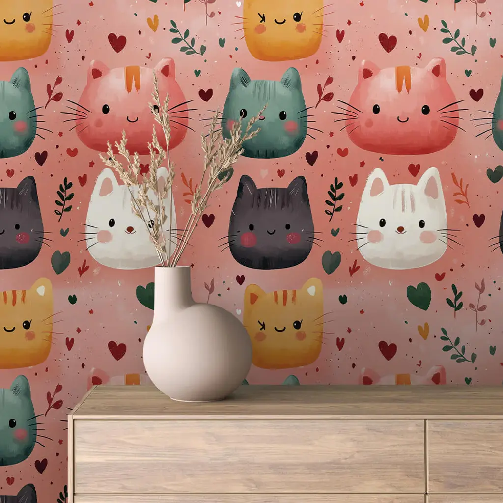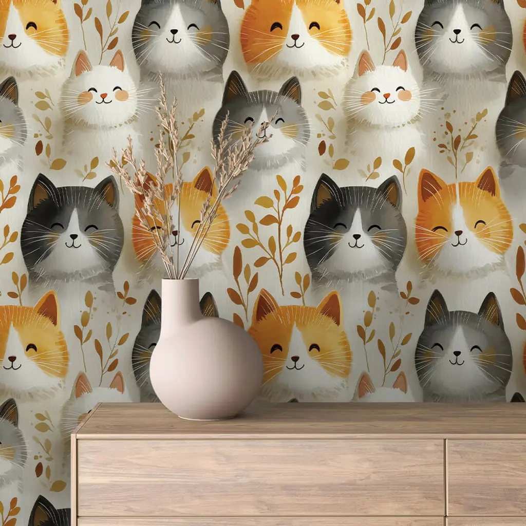 Cuddly Cats Whimsical Wallpaper Adorn your walls with the sweet faces of these charming, illustrated cats. The gentle watercolor texture and a warm palette of blush pink, teal, and orange create a heartwarming and playful ambiance ideal for a nursery, playroom, or child's bedroom. You can select from a Peel and Stick Smooth or Canvas Texture Vinyl option, or choose Light Textured Peel and Stick Fabric Wallpaper or Pre-Pasted Traditional Paper. We offer a personalized touch for each order. Please provide the dimensions (height and width) of the walls you wish to cover, and we’ll assist you in calculating the number of wallpaper sheets needed for your project. We understand that managing the details can be overwhelming, but we're here to help! Each panel measures 2 feet wide by 4 to 10 feet high, so multiple panels will be required to cover an entire wall. Wallpaper Samples: We always recommend requesting a sample to assess how our wallpaper adheres to your selected surface and how the design fits within your space. Each sample is available in two formats: A full-size sample to demonstrate the scale of the print. A mini version of a complete 24”x72” sheet to provide an overview of the design pattern. Standard Wallpaper Sheet Sizes: 24" wide x 48" high / 61 cm x 122 cm 24" wide x 72" high / 61 cm x 183 cm 24" wide x 96" high / 61 cm x 244 cm 24" wide x 108" high / 61 cm x 275 cm 24" wide x 120" high / 61 cm x 305 cm Sizes outside those listed are considered custom sizes. Wallpaper sheets can be tailored to be shorter or longer to fit your space perfectly. CUSTOM SIZES and COLORS are available upon request. Please contact us, and we’ll gladly assist you! Every order includes a detailed application manual and installation guide. Panel Overlap: Our wallpaper panels feature a 1-inch overlap, in addition to the 24-inch width. We strongly recommend not removing this overlap during the installation of peel and stick wallpaper. When determining the number of panels required, please do not count the overlap, as it will be covered by the adjacent panel.