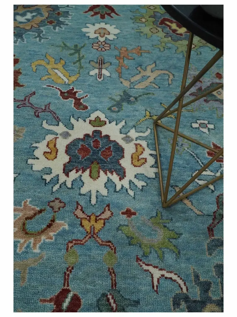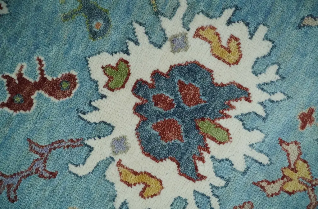 This Aqua and Ivory Wool Oushak Area Rug is a stunning traditional piece, crafted with hand-knotted construction. Vibrant colors are offset with natural ivory for a timeless look. Constructed using high-grade wool for superior quality and a luxurious feel. Hand-Knotted SIZES ARE MADE TO ORDER IN 30-45 DAYS Made with Wool Color : Aqua and Ivory Made with 28 knots per square inch Made in India USERS GUIDE Avoid prolonged moisture Vacuum regularly and/or shake to remove dust Do not pull any loose threads. Use scissors to simply cut the ends The blot spills immediately with a white cloth. Harsh chemicals may damage or fade the rug Use rug protectors under heavy furniture