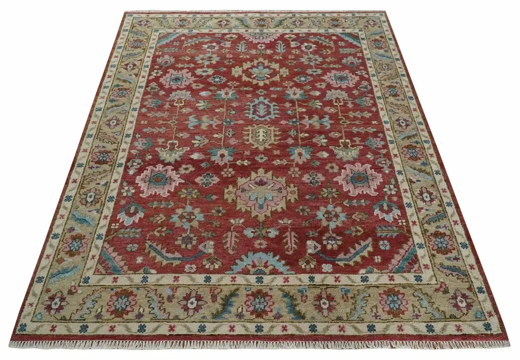 This custom-made, traditional Oushak wool area rug features a unique combination of rust, beige and teal hues in an elegant floral pattern. With expert hand-knotting, this rug is a timeless addition to any home. Hand-Knotted SIZES ARE MADE TO ORDER IN 30-60 DAYS Made with Wool Color : Rust, Beige and Teal Made with 28 knots per square inch Oushak rugs have been made for centuries and carry a tradition and art. This specific rug is made in India, in the city of Bhadohi. Bhadohi is one of the biggest rug manufacturing cities. Carpet weaving in the region dates back to the 16th century during the reign of Akbar. The skilled artisans of Bhadohi have been carrying the tradition of rug-making for centuries. USERS GUIDE Avoid prolonged moisture Vacuum regularly and/or shake to remove dust Do not pull any loose threads. Use scissors to simply cut the ends The blot spills immediately with a white cloth. Harsh chemicals may damage or fade the rug Use rug protectors under heavy furniture