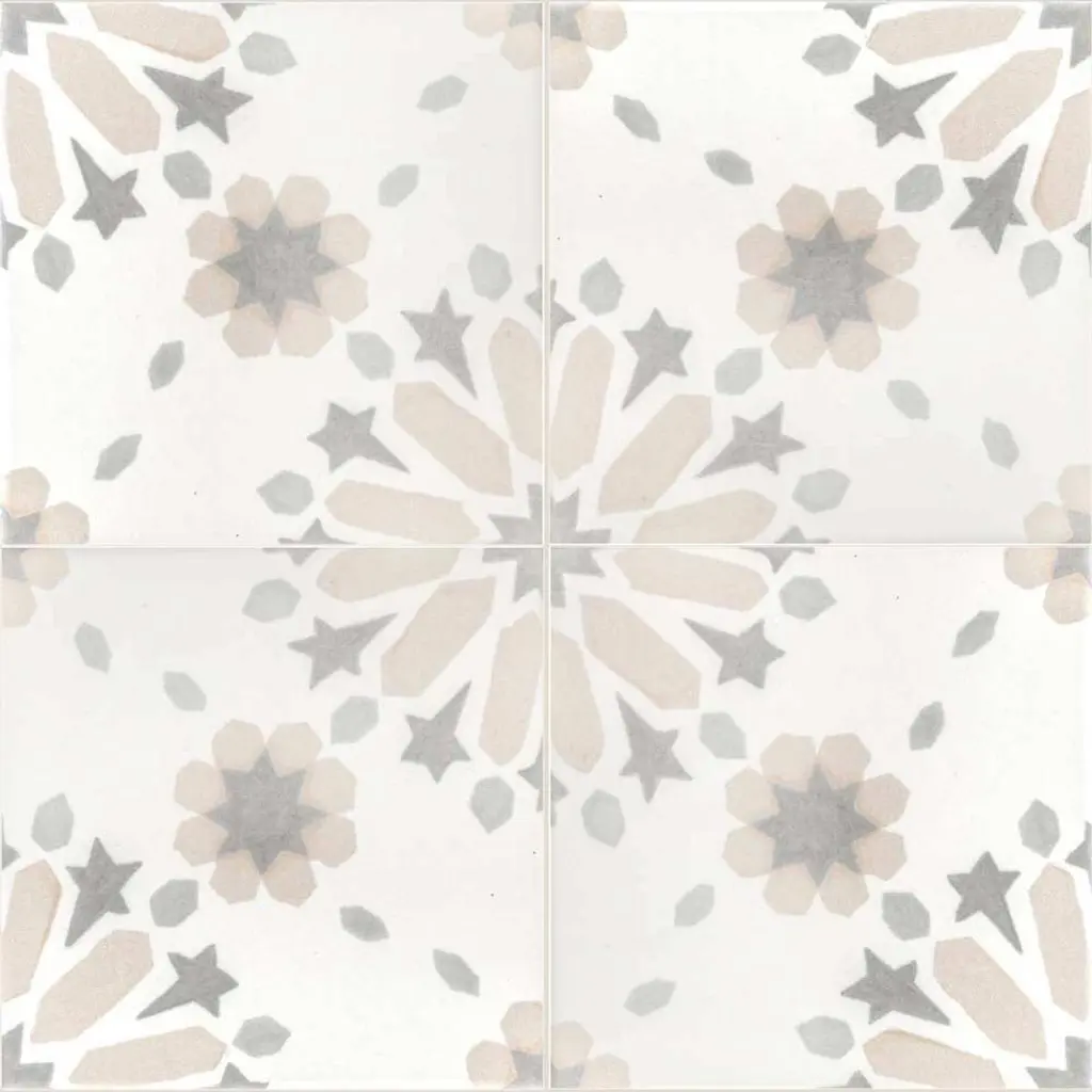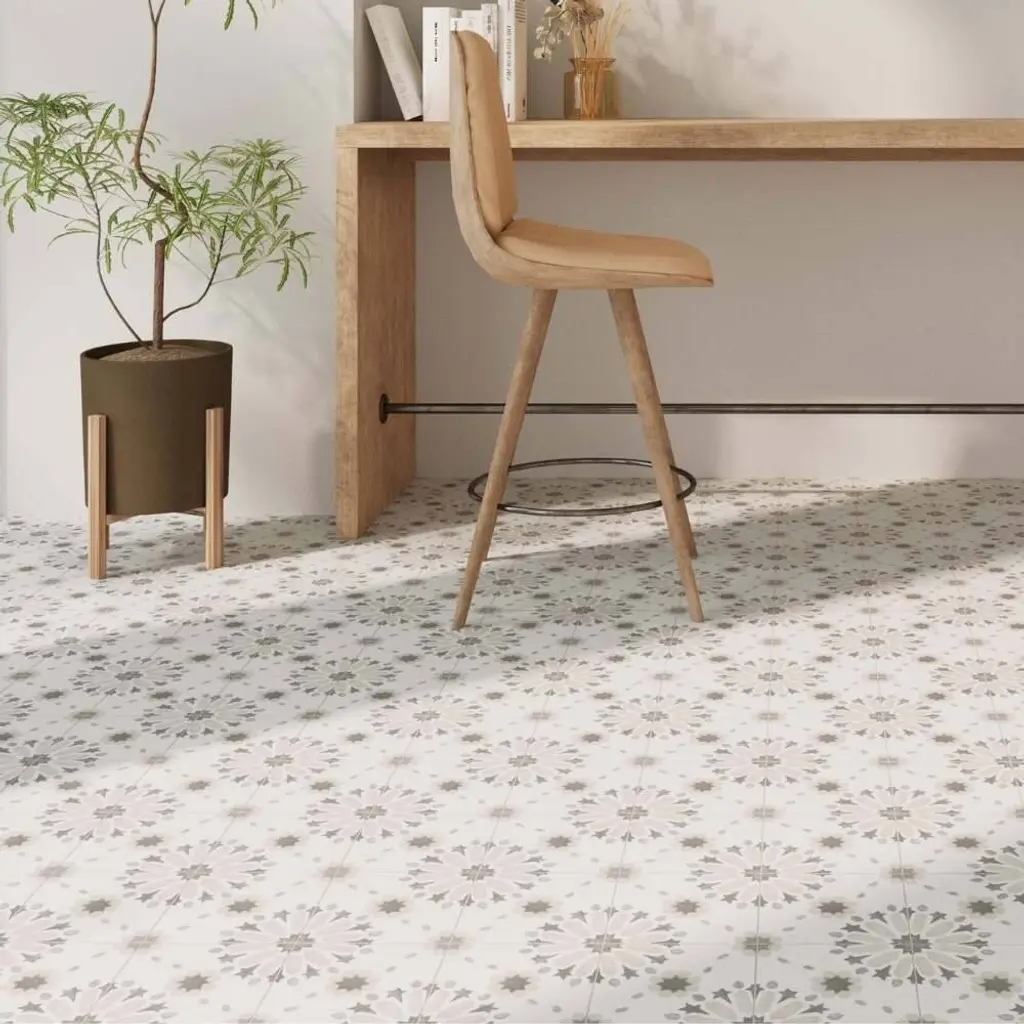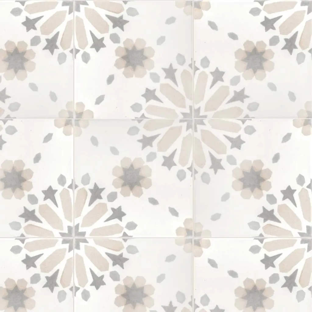 The Dhalia collection unfolds like a blooming flower, with intricate patterns that bring a sense of movement and artistry to any space. Made in Spain from durable porcelain with a sleek matte finish, these 6x6 tiles are designed for both indoor and outdoor use. The collection comes in four versatile shades—Beige, Blue, Grey, and Noir—each enhancing the delicate yet bold floral-inspired design. Whether creating a striking feature wall or adding character to a patio, Dhalia offers a balance of refinement and natural beauty in every tile. FEATURES: A case of this product includes 25 pieces and covers 6.03 square feet Porcelain, singular, geometric, encaustic, floral, patterned, matte, pressed, straight edge floor and wall tile Impervious and waterproof; Withstands sun and rain Matte finish with a shade 1 rating/ variation (V1 uniform appearance) Made in Spain Constructed from durable, long-lasting porcelain Features a sleek matte finish for a contemporary look Available in four stylish colors: Beige, Blue, Grey, and Noir Modern encaustic patterned design Convenient 6"x6" size for versatile installation options Perfect for both interior and exterior spaces This product has a PEI rating of 3 (endurance and hardness indicator) and therefore is suited for residential countertops, walls, and medium-traffic floors Ideal for backsplashes, bathrooms, showers, kitchens, outdoors, pools, floors, walls Approved for residential and commercial installations Easy to install 6 inches x 6 inches decorative geometric, floral pattern porcelain floor and wall tile DIMENSIONS: Individual tile size: 6 inches L x 6 inches W Surface area per carton: 6.03 square feet Sample tile size: Full size 6 inches L x 6 inches W
