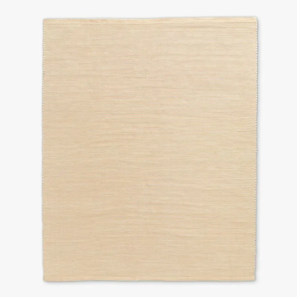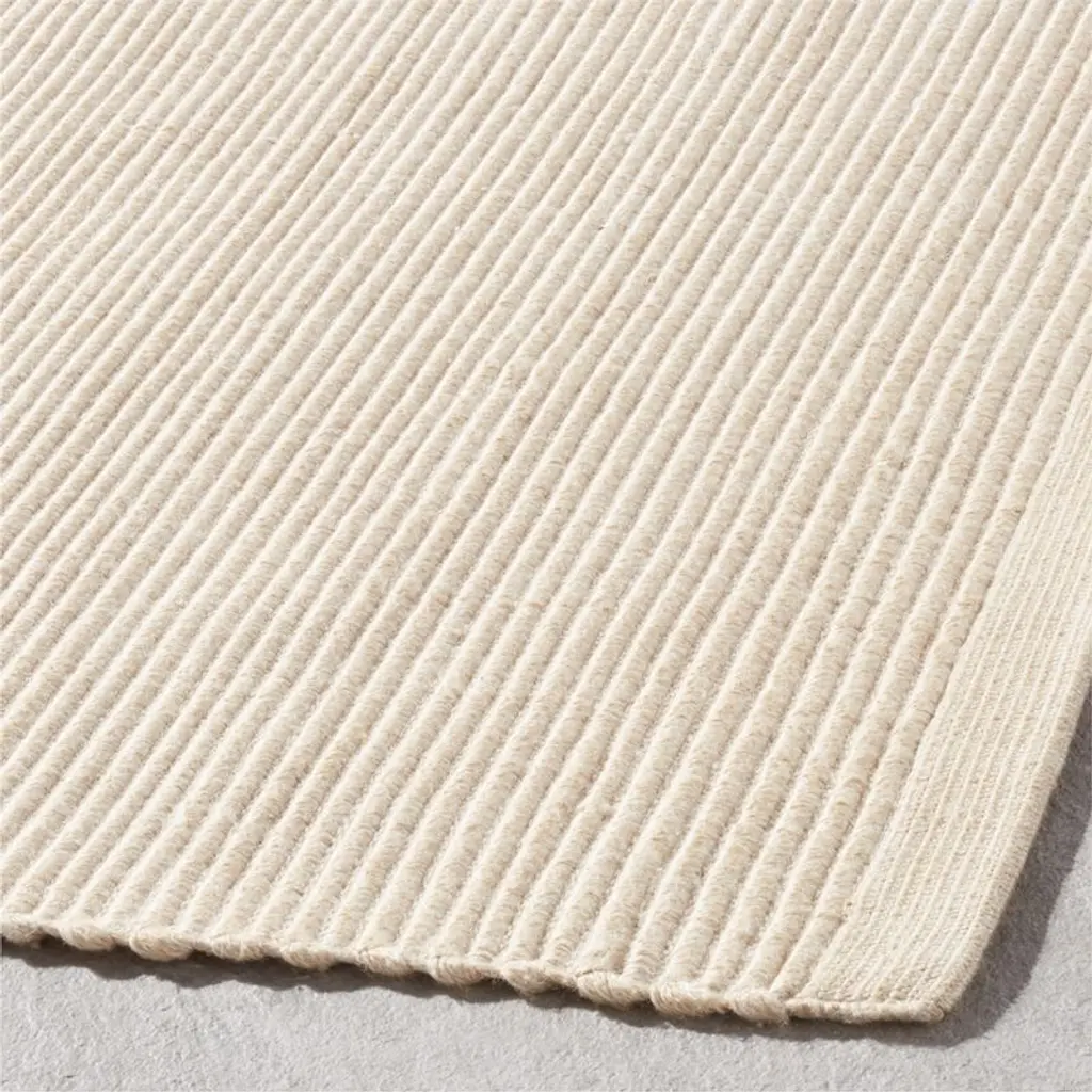 Woven by hand to create subtle texture, sleek natural flatweave rug by Ross Cassidy is a minimalist addition to the indoor or outdoor living area. Ribbed performance fabric is designed to withstand the demands of high traffic, yet retains a decidedly sophisticated aesthetic that looks especially chic when paired with teak outdoor furniture. CB2 exclusive.