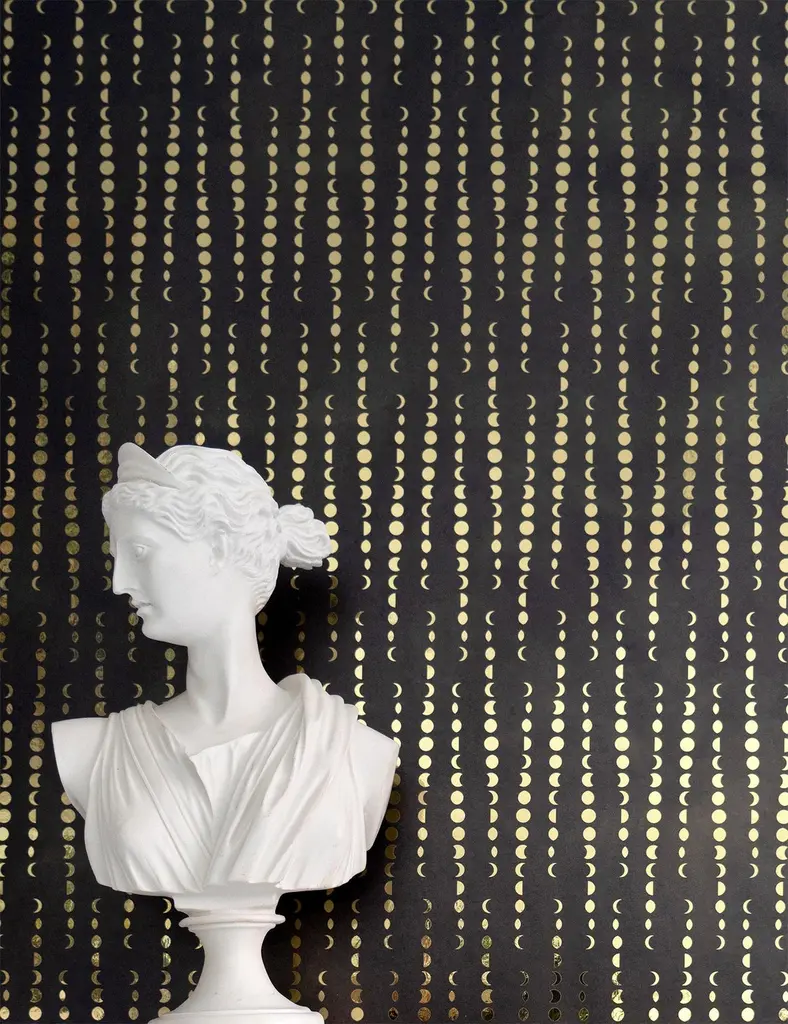This ikat-reminiscent pattern balances the moon in its fluctuating forms, reflecting the passing of time as it rises, sets and spins. Printed on metallic type II. Note: This product is sold by the square foot.Width: Print area 52 inches (132.1 cm)Length: Sold by the square foot (30.48 cm2)Design match: StraightPrint method: Digital with water-based latex inks.Lead time: Please allow for 6 – 8 week lead time.Fire rating: Class “A” Fire Rated – tested in accordance with ASTM-E84 Tunnel Test NFPA-101 (passed).NFPA Life Safety Code 101: Class ANFPA 286 Corner Burn Test: Class ABS476 Parts 6 & 7: Passed all requirements.CAN/ULC-S 102.2: Passed all requirements.EU Class Flame (EN15102) : Passed Class B, S2Environmental Details: Made with low VOC vinylTested per CA-1350 Air Quality Standards Cadmium and Lead Free Formulation.