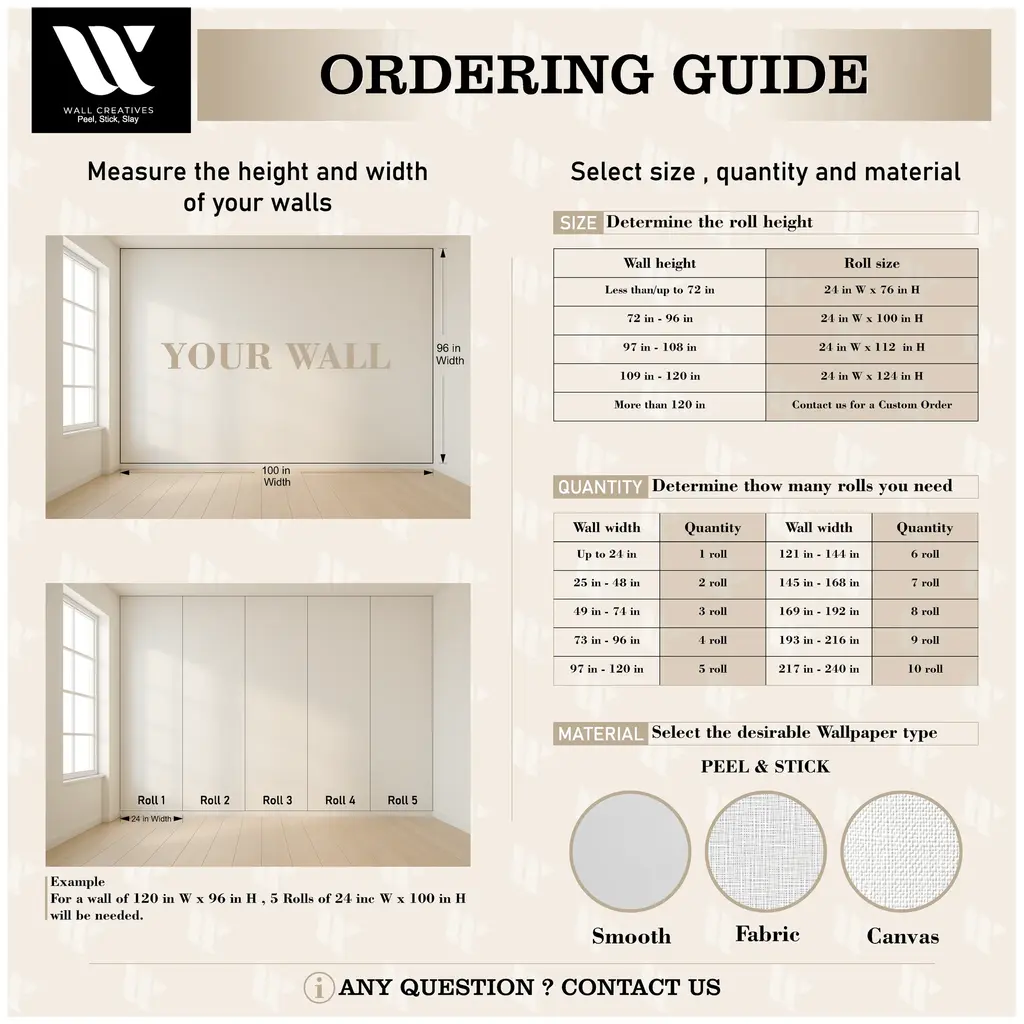 Enchanted Owl Grove Toile Invite the quiet wisdom of the woods into your home with this enchanting design, where painterly barn owls rest on delicate blossoming branches. The serene palette of sage green, soft browns, and creamy whites creates a tranquil atmosphere, making it an ideal backdrop for a peaceful bedroom, nursery, or cozy reading nook. owl, woodland, watercolor, botanical, vintage, serene, sage green, brown, cream, toile You can select from a Peel and Stick Smooth or Canvas Texture Vinyl option, or choose Light Textured Peel and Stick Fabric Wallpaper or Pre-Pasted Traditional Paper. We offer a personalized touch for each order. Please provide the dimensions (height and width) of the walls you wish to cover, and we’ll assist you in calculating the number of wallpaper sheets needed for your project. We understand that managing the details can be overwhelming, but we're here to help! Each panel measures 2 feet wide by 4 to 10 feet high, so multiple panels will be required to cover an entire wall. Wallpaper Samples: We always recommend requesting a sample to assess how our wallpaper adheres to your selected surface and how the design fits within your space. Each sample is available in two formats: A full-size sample to demonstrate the scale of the print. A mini version of a complete 24”x72” sheet to provide an overview of the design pattern. Standard Wallpaper Sheet Sizes: 24" wide x 48" high / 61 cm x 122 cm 24" wide x 72" high / 61 cm x 183 cm 24" wide x 96" high / 61 cm x 244 cm 24" wide x 108" high / 61 cm x 275 cm 24" wide x 120" high / 61 cm x 305 cm Sizes outside those listed are considered custom sizes. Wallpaper sheets can be tailored to be shorter or longer to fit your space perfectly. CUSTOM SIZES and COLORS are available upon request. Please contact us, and we’ll gladly assist you! Every order includes a detailed application manual and installation guide. Panel Overlap: Our wallpaper panels feature a 1-inch overlap, in addition to the 24-inch width. We strongly recommend not removing this overlap during the installation of peel and stick wallpaper. When determining the number of panels required, please do not count the overlap, as it will be covered by the adjacent panel.