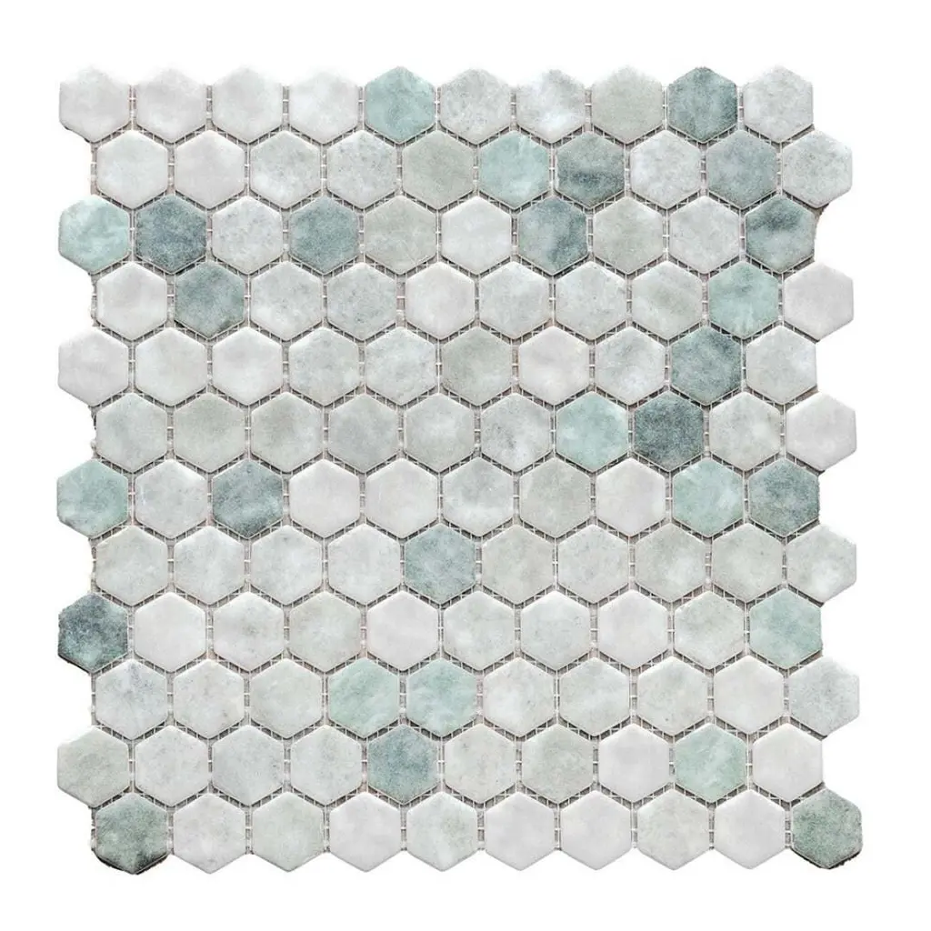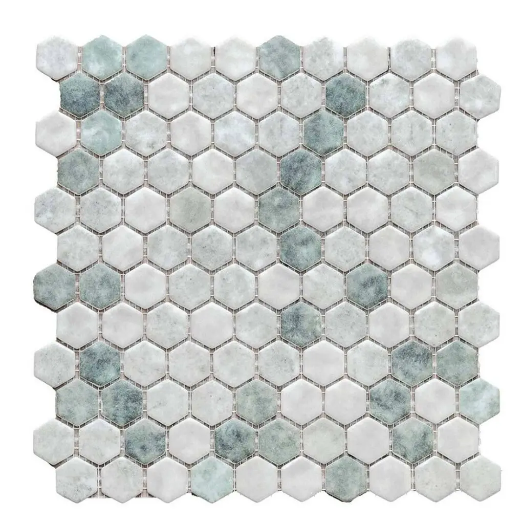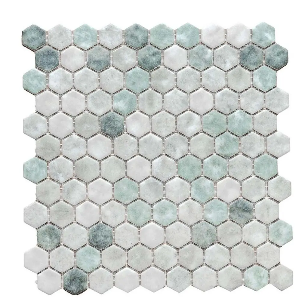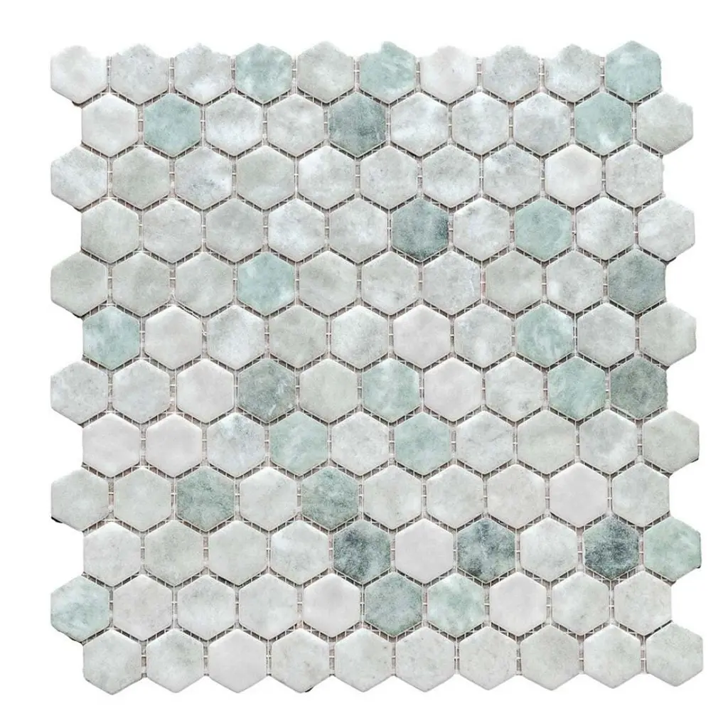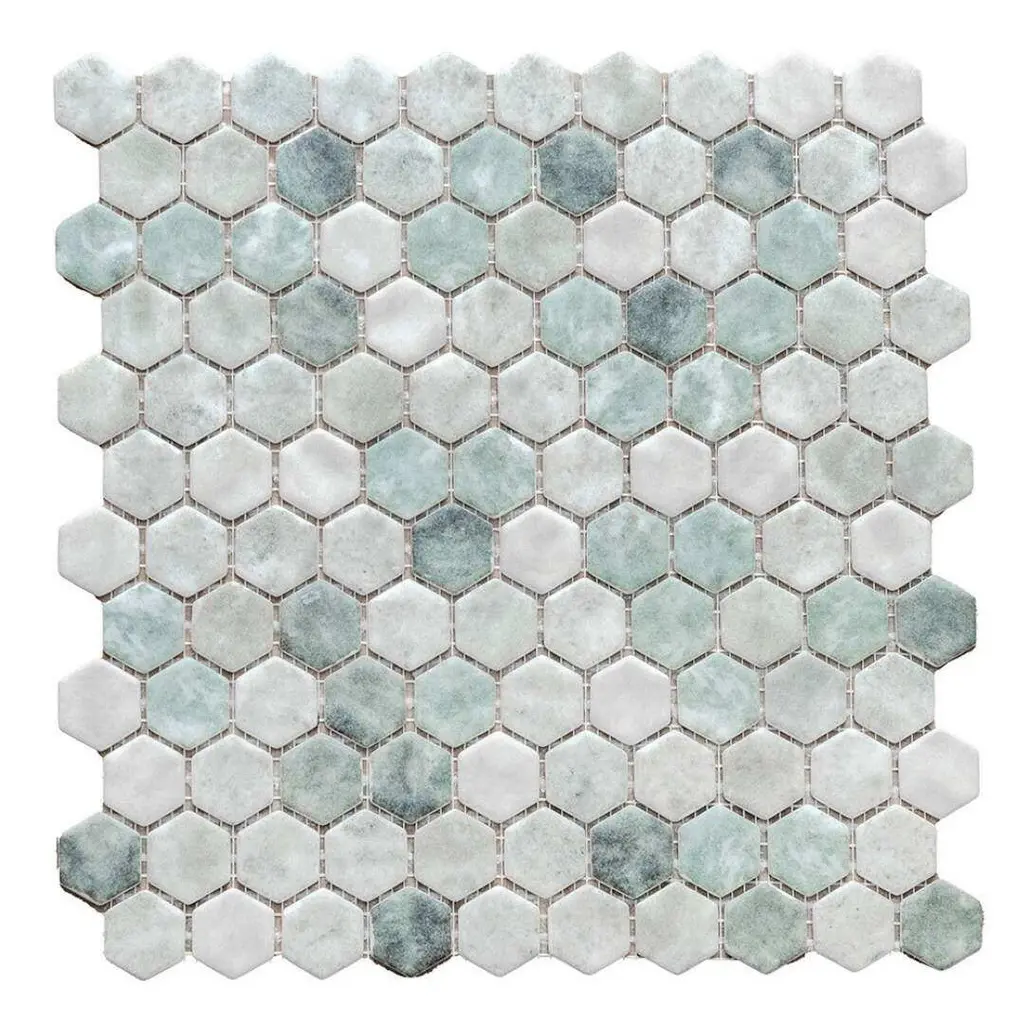 Carefully designed combinations of timeless hex in neutral tones and subtle details are designed to enhance any residential project and maintain its originality. Made and designed in Spain, this 98% recycled, sustainable mosaic is meant for both floor and wall applications while also being suitable for dry, pool, or wet areas. This collection comes in various colors, all offering their own unique style and variation. Our Eterna Hex Glass Mosaic collection stands the test of time and provides your home with long-lasting beauty. FEATURES: DIMENSIONS: