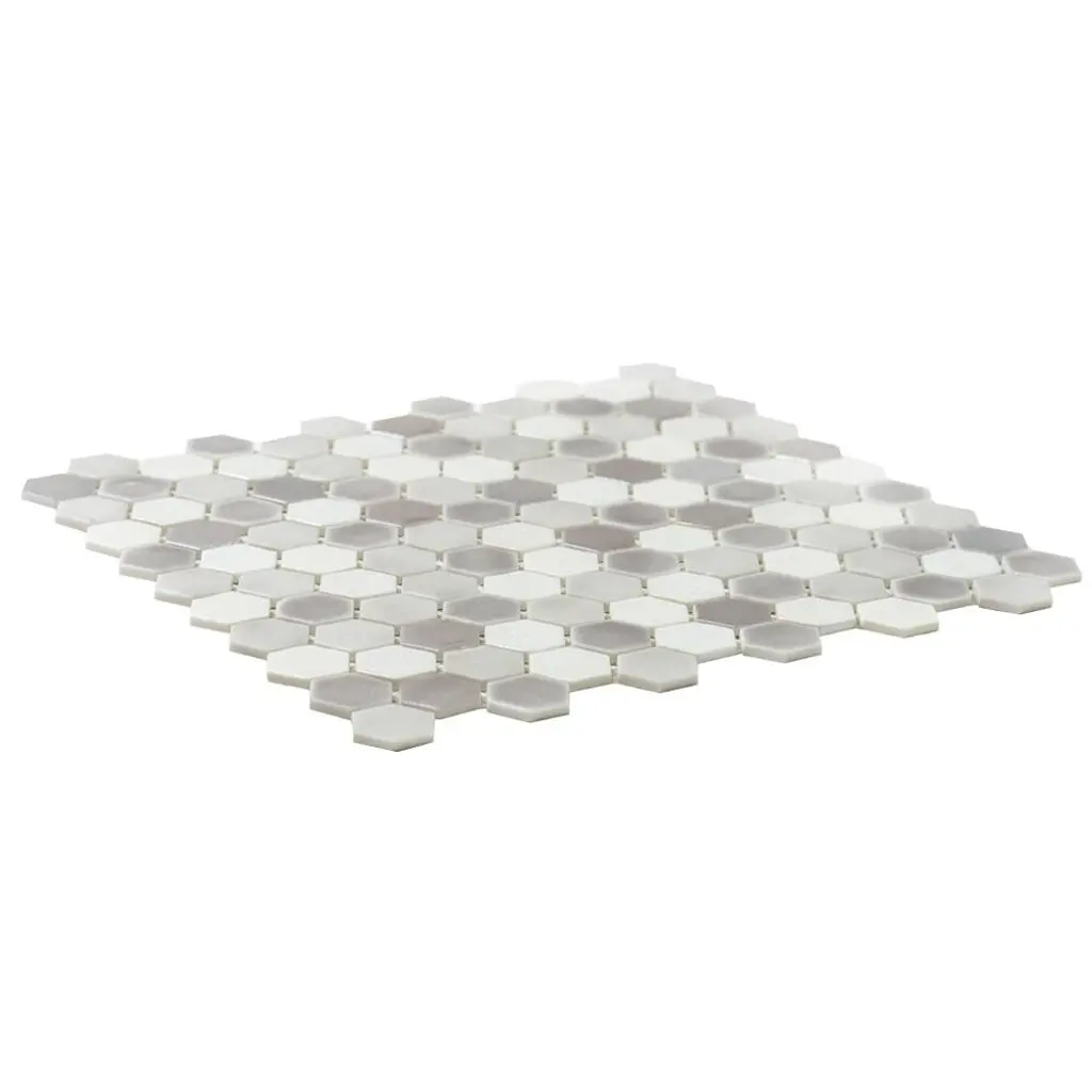 Carefully designed combinations of timeless hex in neutral tones and subtle details are designed to enhance any residential project and maintain its originality. Made and designed in Spain, this 98% recycled, sustainable mosaic is meant for both floor and wall applications while also being suitable for dry, pool, or wet areas. This collection comes in various colors, all offering their own unique style and variation. Our Eterna Hex Glass Mosaic collection stands the test of time and provides your home with long-lasting beauty. FEATURES: DIMENSIONS:
