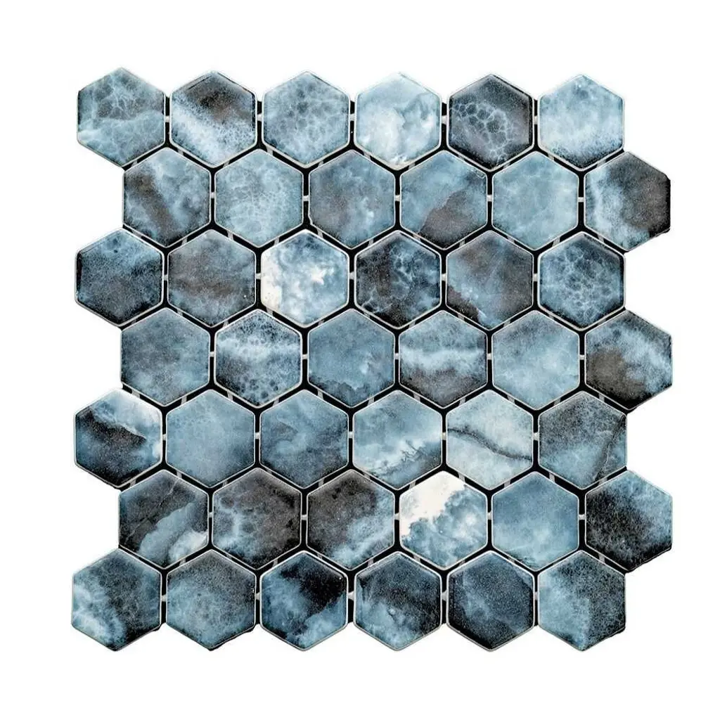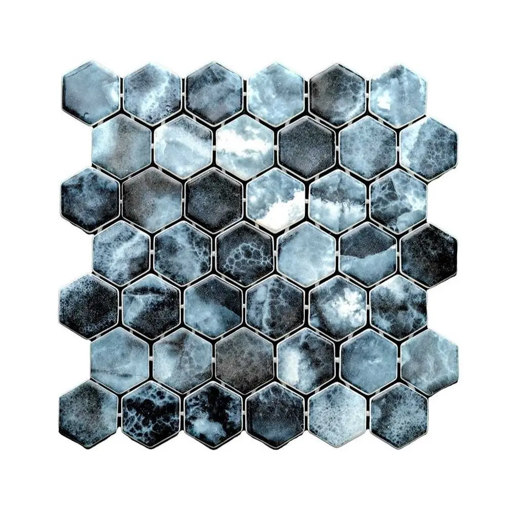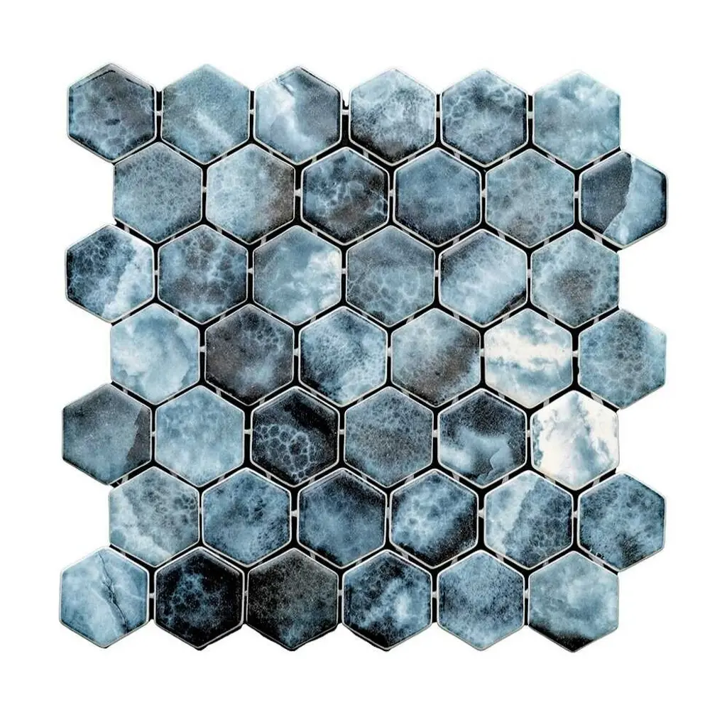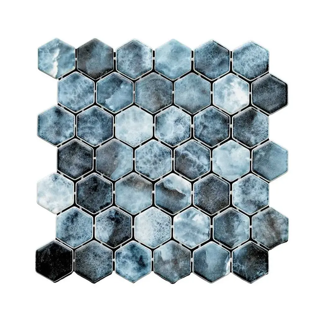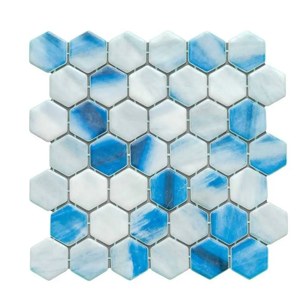 Looking for a unique multicolored checked tile? Check out The Tile Life's Eterna Hex Glass Mosaic for beautiful multicolored patterned tile.This mosaic collection features a stunning combination of elegant marble and stone textures covering each mosaic, creating endless possibilities and combinations for decorating your environment. A grain that recalls the marble finesse and realistically recreates the stones, taking us to its natural origin. Made and designed in Spain, this 98% recycled, sustainable mosaic is meant for both floor and wall applications and is suitable for pools and dry and wet areas. FEATURES: Pool rated 98% Recycled glass Green sustainable product Mesh backed Impervious and waterproof Glass mosaic tile for flooring and wall installations Glossy glass tile Glass hexagon/ honeycomb mosaic tile Pressed straight edge Easy to install 2" x 2" hexagon decorative tiles Ideal for backsplash, bathroom, shower, kitchen, pool, fireplace surround, outdoor; floor; wall DIMENSIONS: Mosaic sheet: 12-inch x 11.875-inch Individual tile: 2-inch x 2-inch Surface area per carton: 9.68 square feet