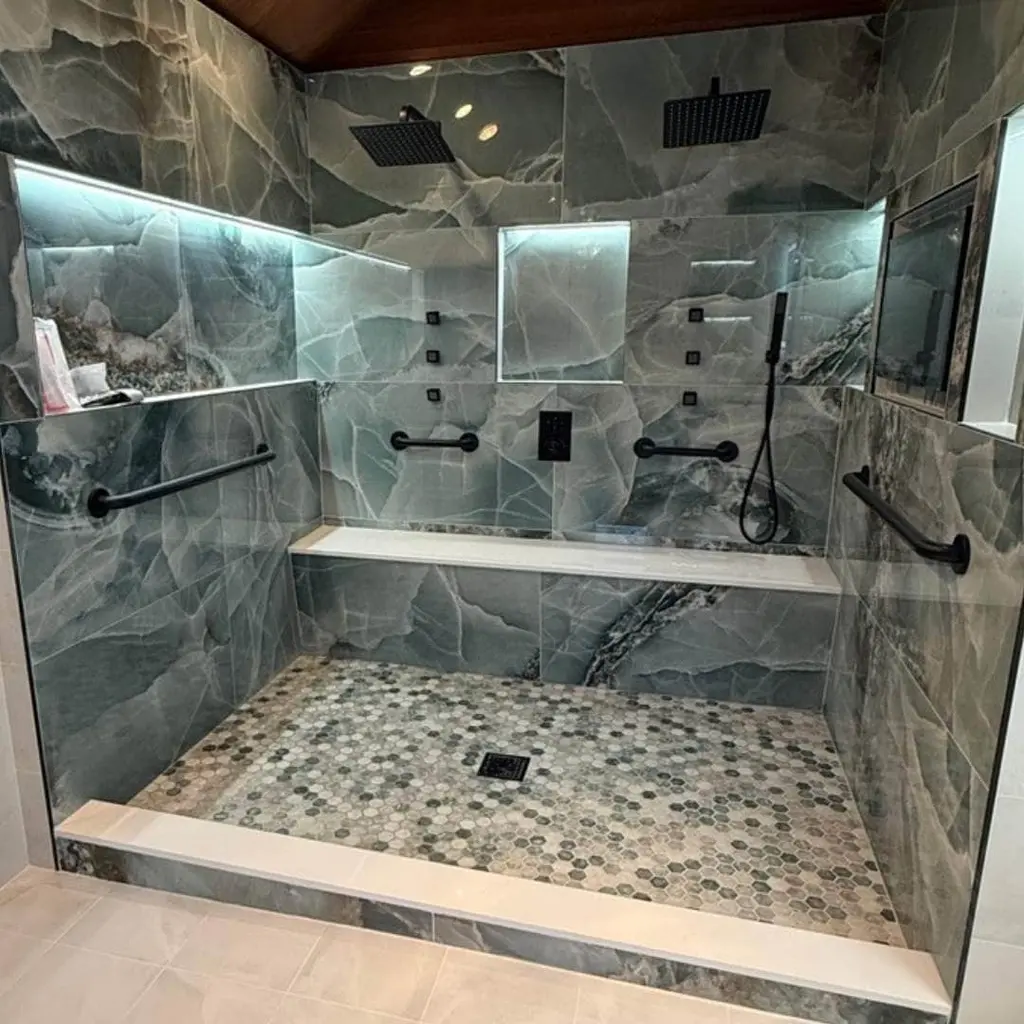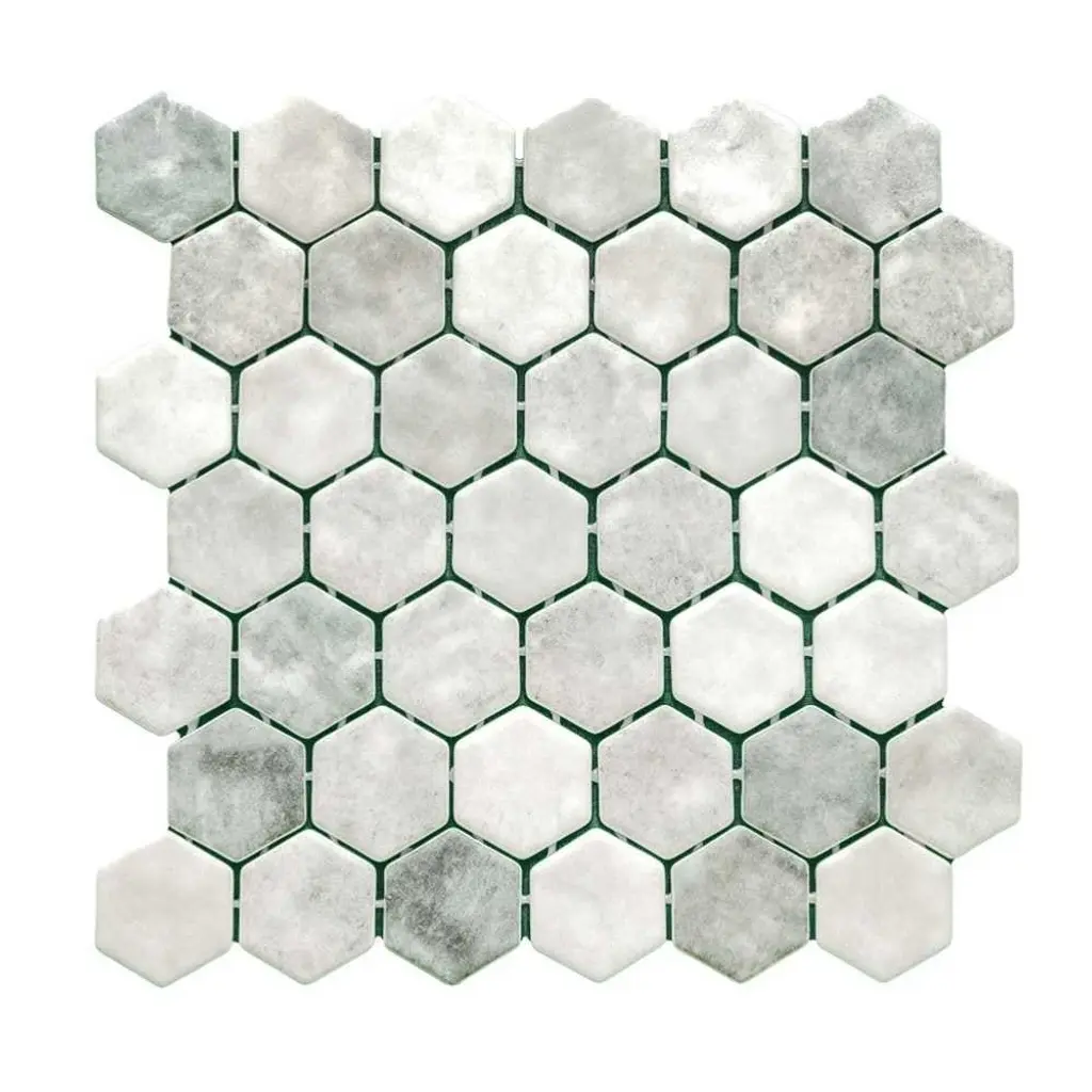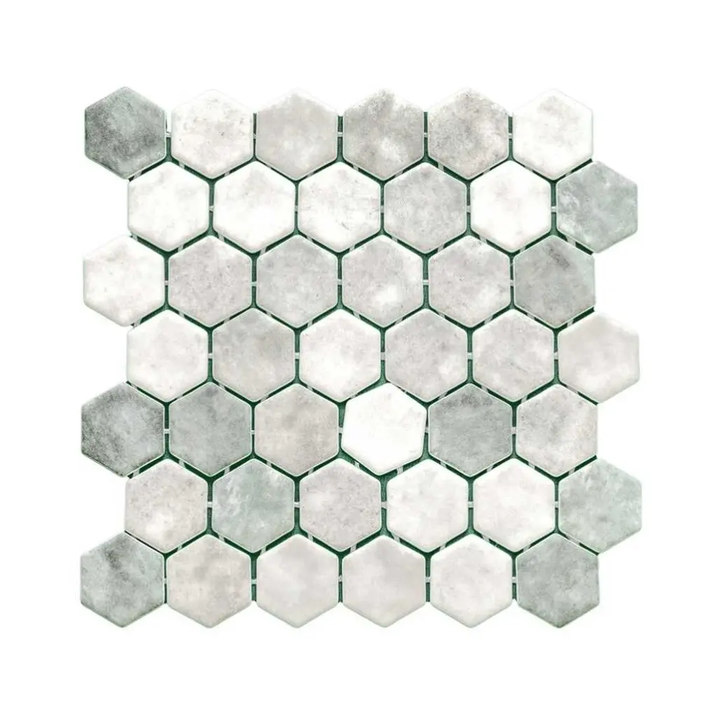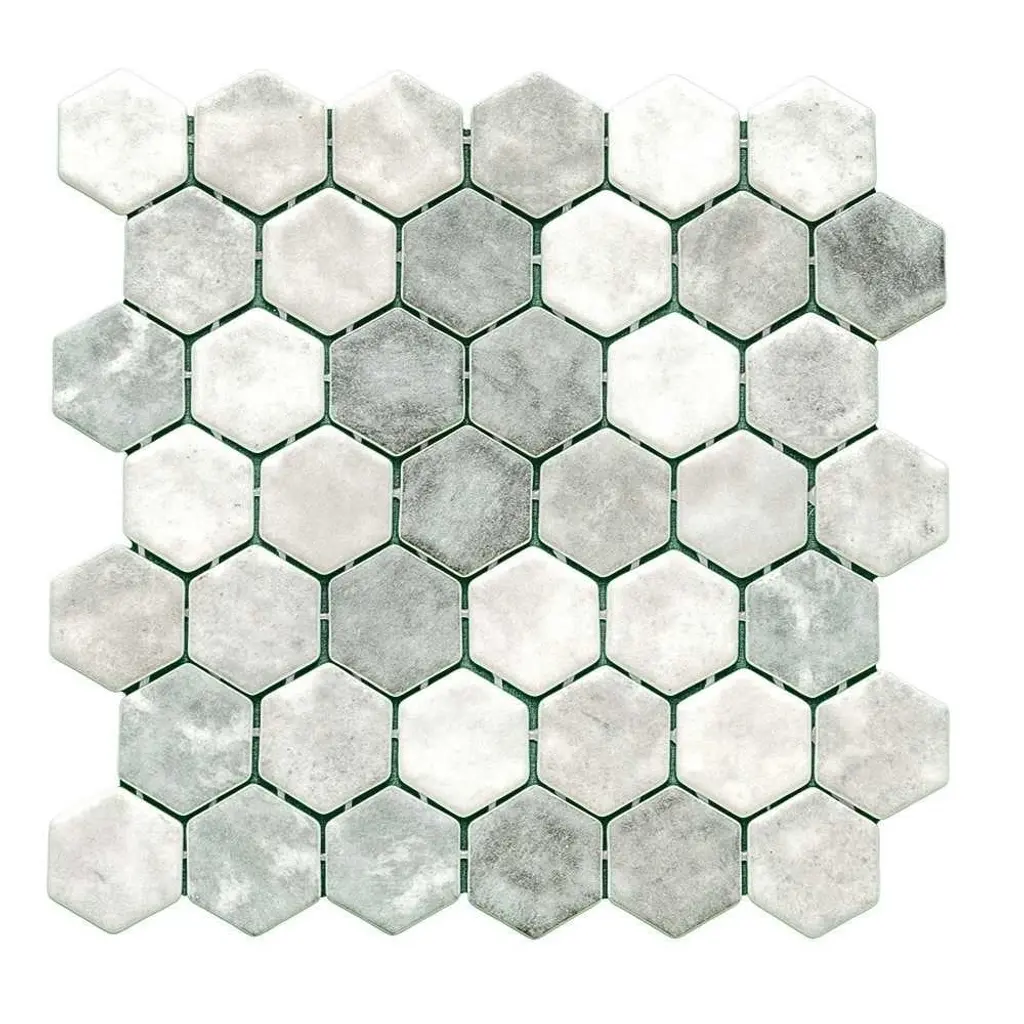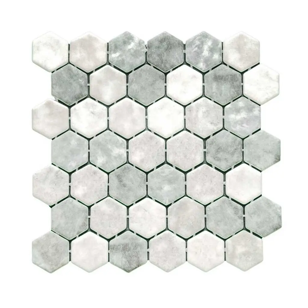 Looking for a unique multicolored checked tile? Check out The Tile Life's Eterna Hex Glass Mosaic for beautiful multicolored patterned tile. This mosaic collection features a stunning combination of elegant marble and stone textures covering each mosaic, creating endless possibilities and combinations for decorating your environment. A grain that recalls the marble finesse and realistically recreates the stones, taking us to its natural origin. Made and designed in Spain, this 98% recycled, sustainable mosaic is meant for both floor and wall applications and is suitable for pools and dry and wet areas. FEATURES: DIMENSIONS: