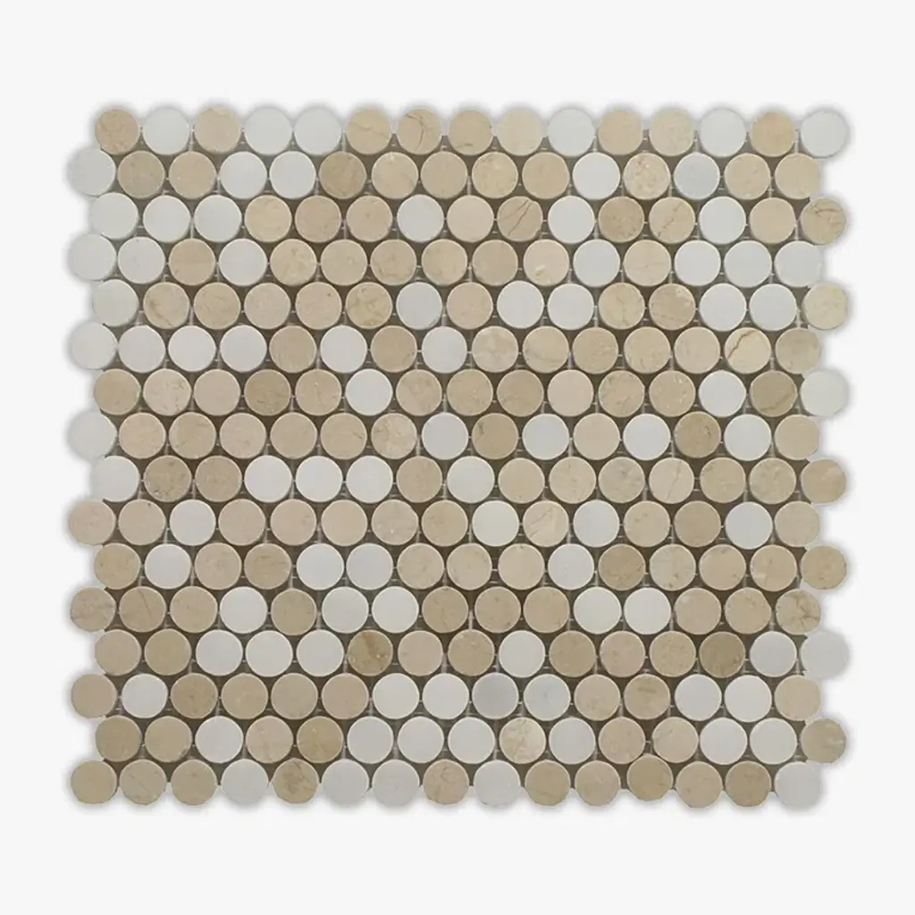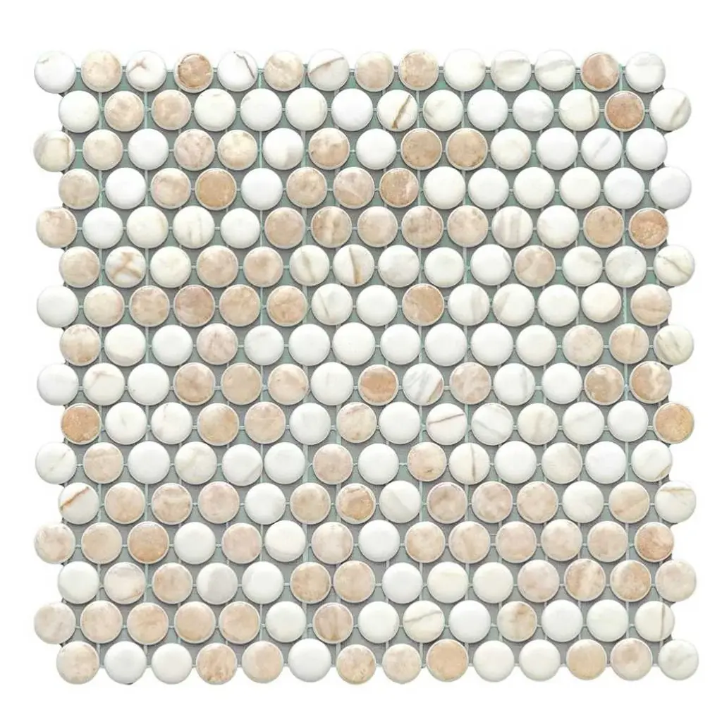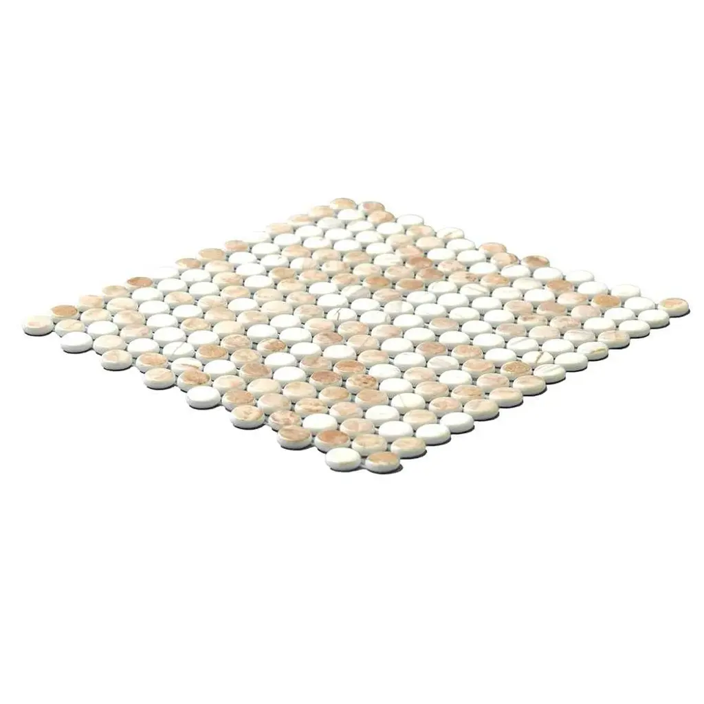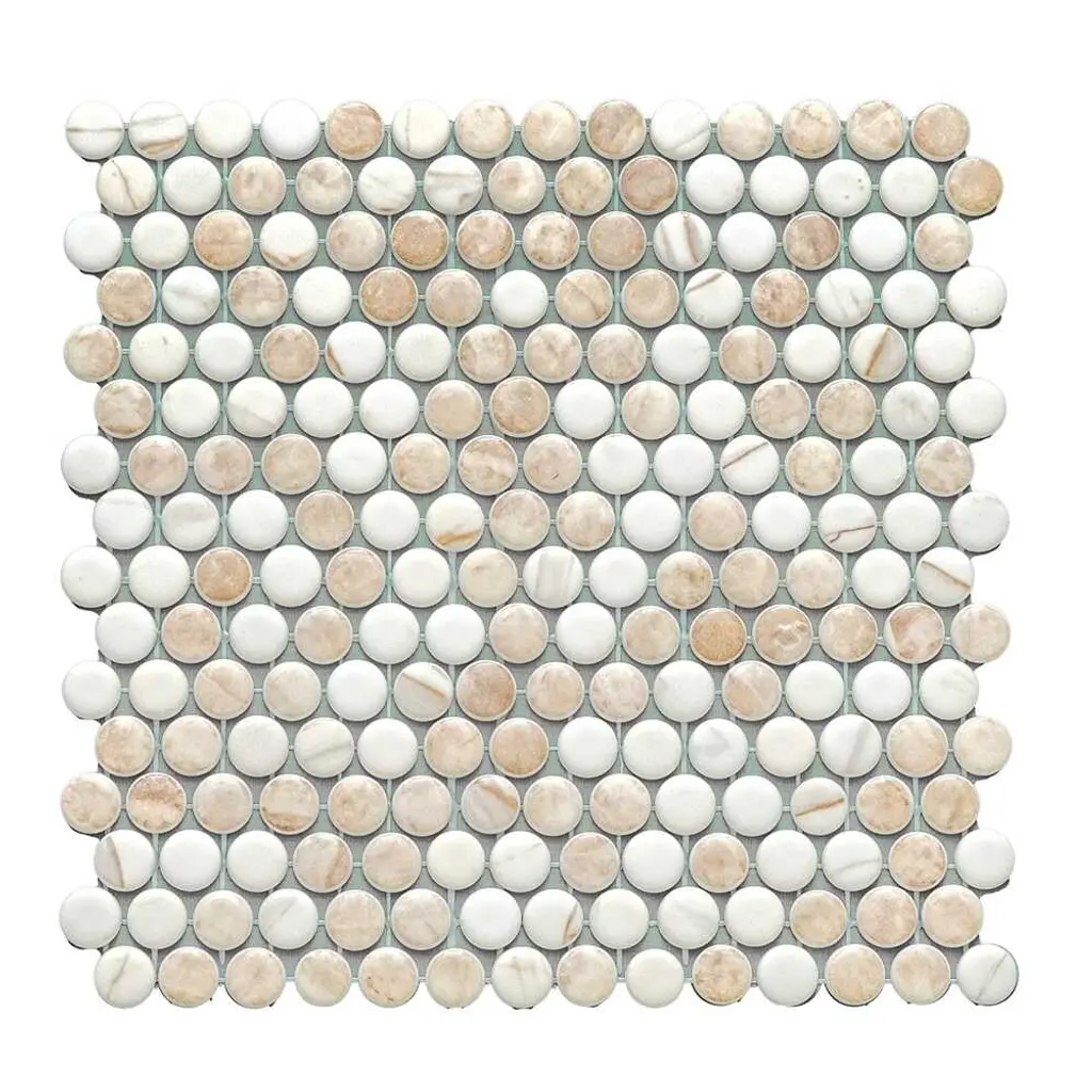 Carefully designed combinations of a timeless penny in neutral tones and subtle details designed to enhance any residential project while maintaining its originality. Our Eterna Penny Mosaic is produced from the highest quality recycled glass to create a high-end look. Made and designed in Spain, this 98% recycled sustainable mosaic is meant for both floor/ wall applications and is suitable for dry/pool/wet areas. These easy-to-install 12" x 12" decorative penny round glass mosaic tiles are perfect for a wide range of applications, they're ideal for backsplashes, bathrooms, showers, kitchens, pools, fireplace surrounds, countertops, floors, and walls—both indoors and out. Designed for use in dry or wet areas, these versatile glass mosaics are approved for residential and commercial installations, offering a stylish and durable solution for nearly any surface. FEATURES:DIMENSIONS: