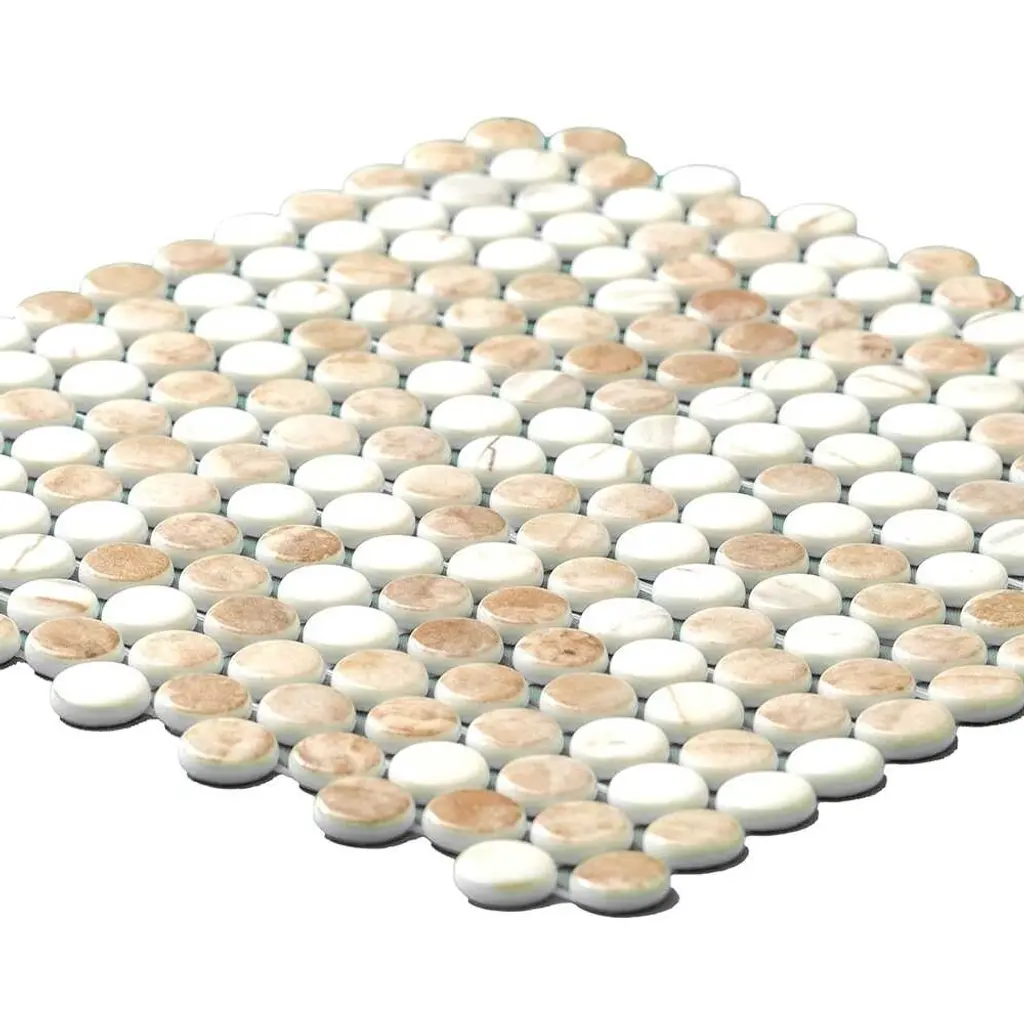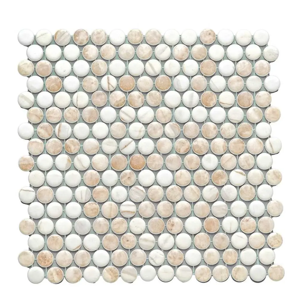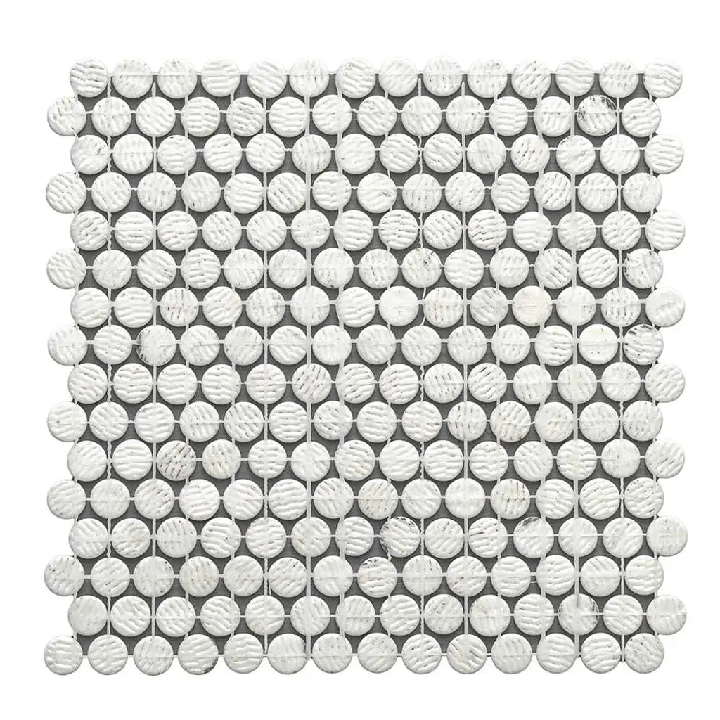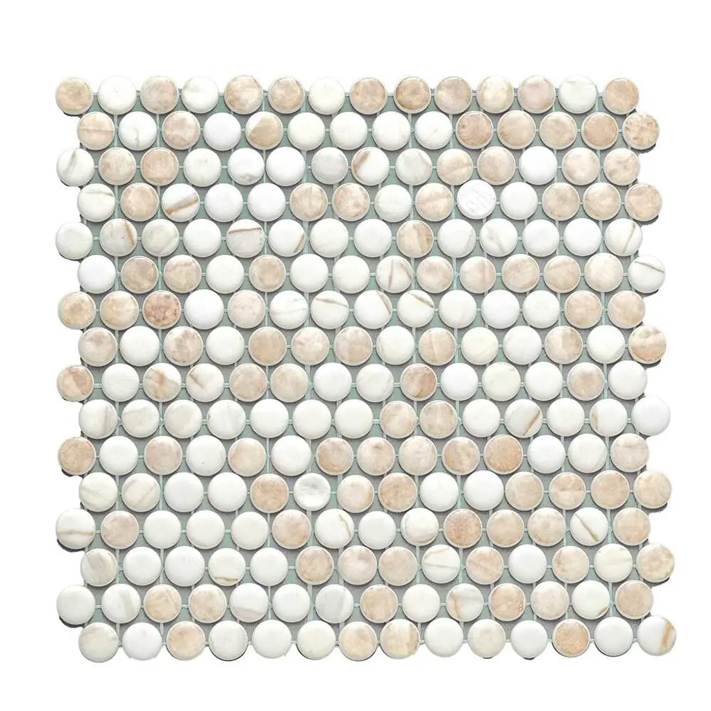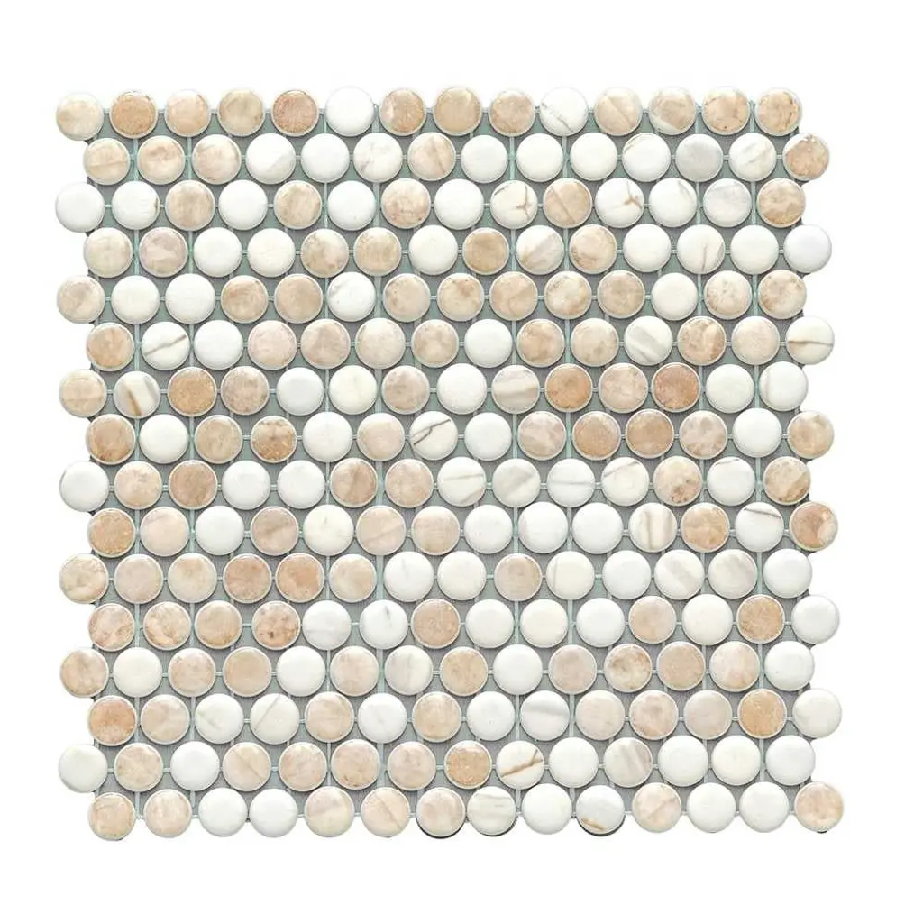 Carefully designed combinations of a timeless penny in neutral tones and subtle details designed to enhance any residential project while maintaining its originality. Our Eterna Penny Mosaic is produced from the highest quality recycled glass to create a high-end look. Made and designed in Spain, this 98% recycled sustainable mosaic is meant for both floor/ wall applications and is suitable for dry/pool/wet areas. These easy-to-install 12" x 12" decorative penny round glass mosaic tiles are perfect for a wide range of applications, they're ideal for backsplashes, bathrooms, showers, kitchens, pools, fireplace surrounds, countertops, floors, and walls—both indoors and out. Designed for use in dry or wet areas, these versatile glass mosaics are approved for residential and commercial installations, offering a stylish and durable solution for nearly any surface. FEATURES:DIMENSIONS: