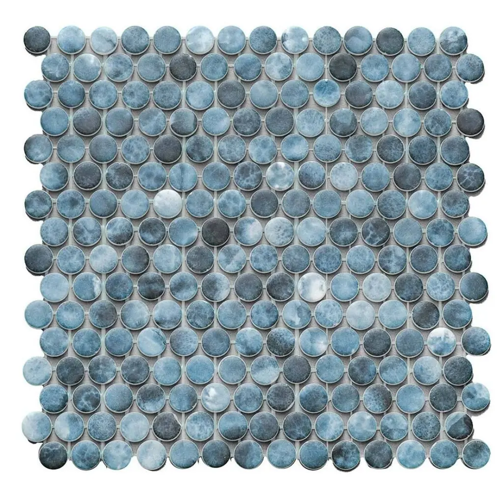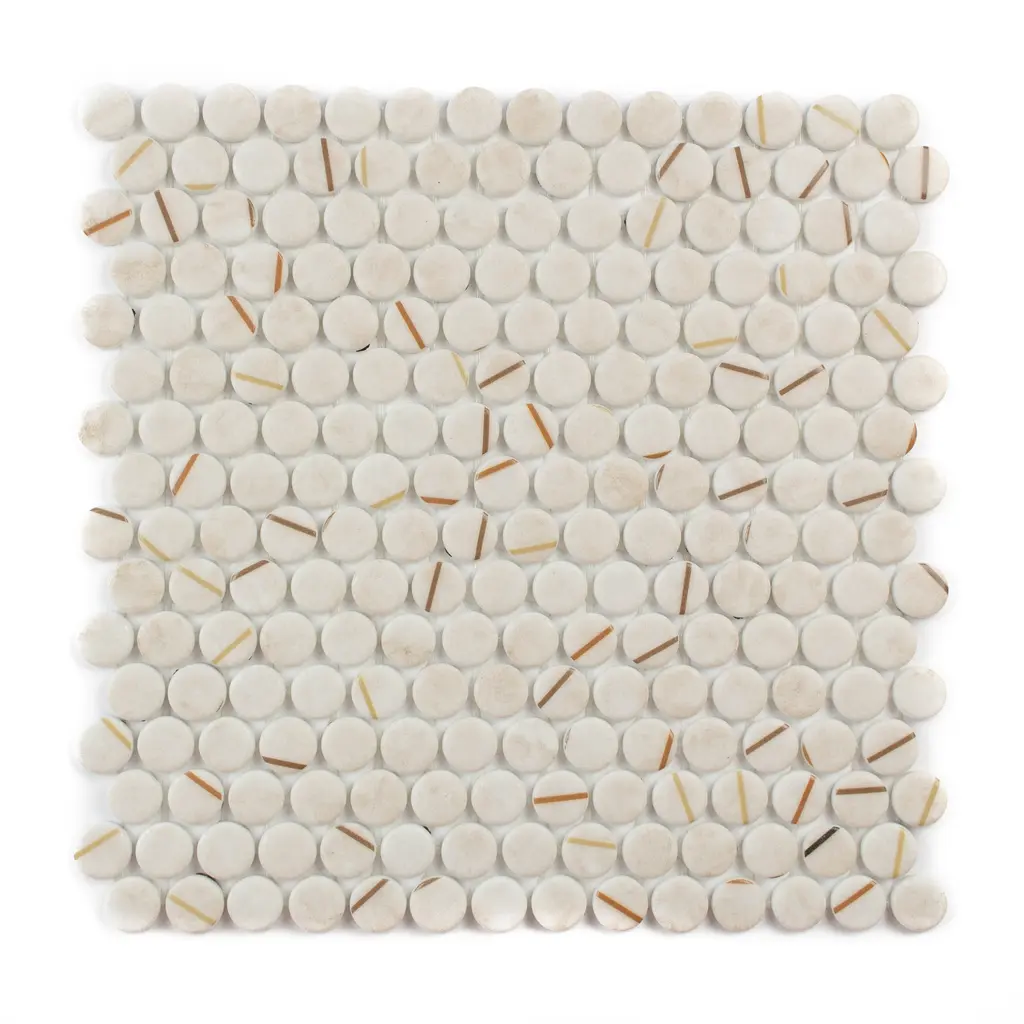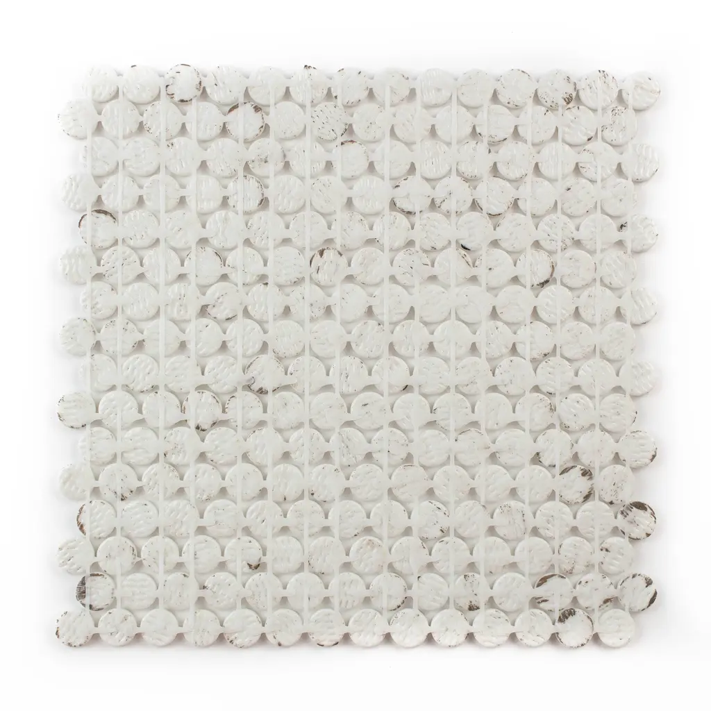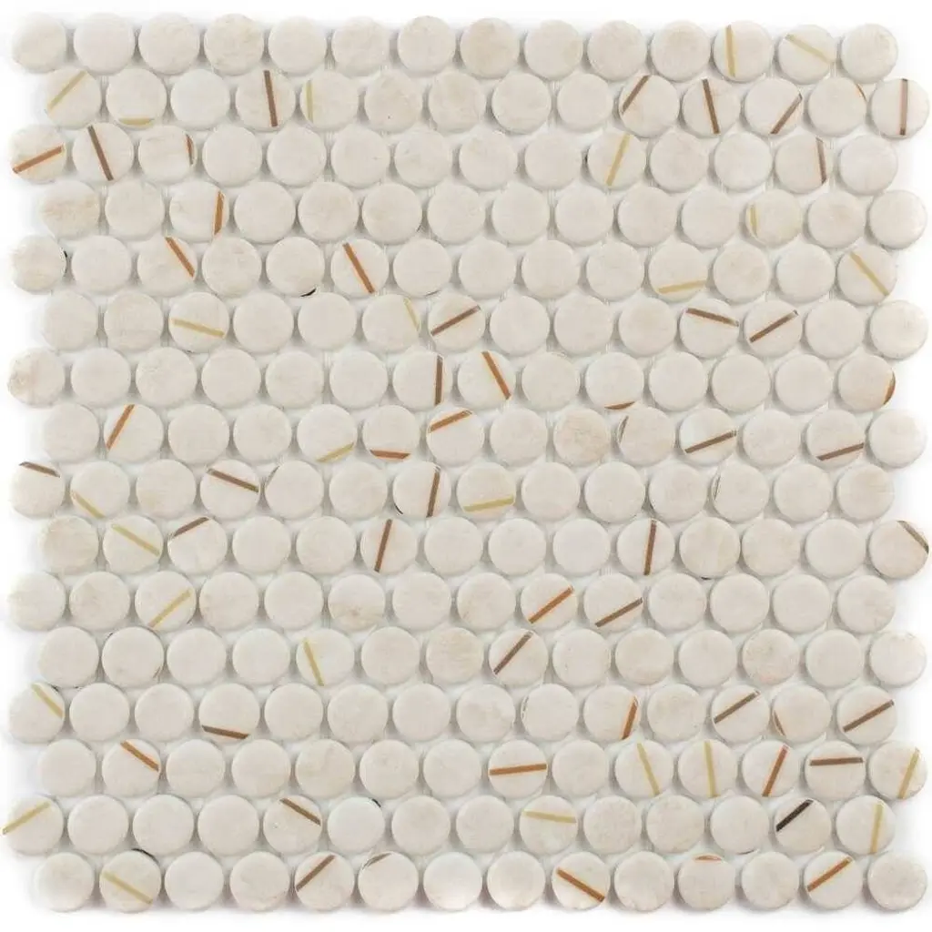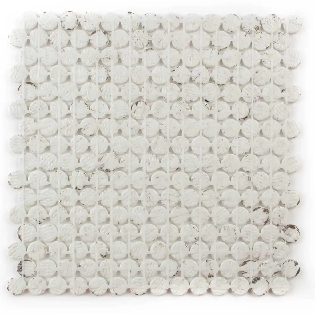 Carefully designed combinations of a timeless penny in neutral tones and subtle details designed to enhance any residential project while maintaining its originality. Our Eterna Penny Mosaic is produced from the highest quality recycled glass to create a high-end look. Made and designed in Spain, this 98% recycled sustainable mosaic is meant for both floor/ wall applications and is suitable for dry/pool/wet areas. These easy-to-install 12" x 12" decorative penny round glass mosaic tiles are perfect for a wide range of applications, they're ideal for backsplashes, bathrooms, showers, kitchens, pools, fireplace surrounds, countertops, floors, and walls—both indoors and out. Designed for use in dry or wet areas, these versatile glass mosaics are approved for residential and commercial installations, offering a stylish and durable solution for nearly any surface. FEATURES:DIMENSIONS: