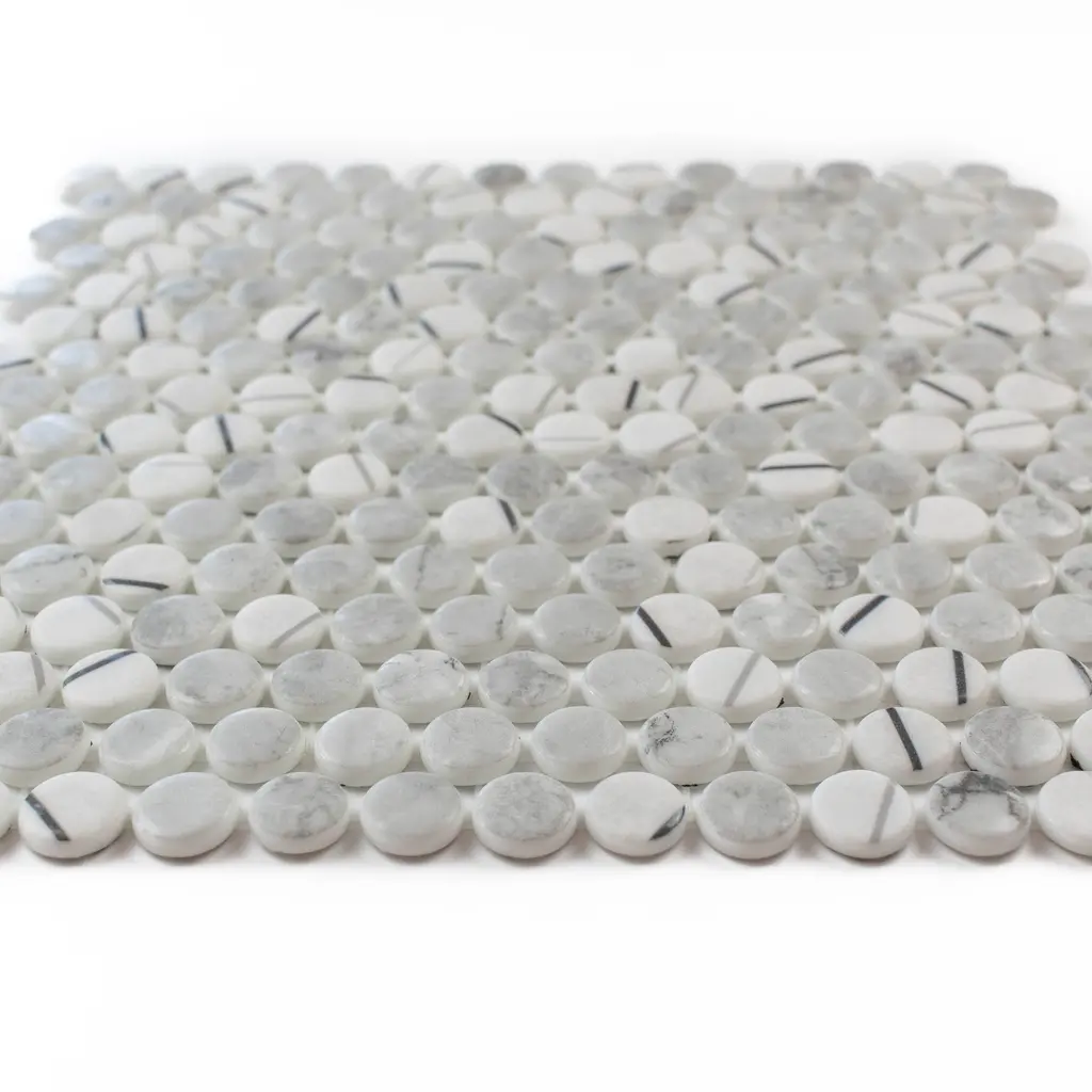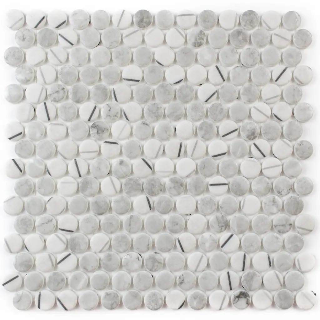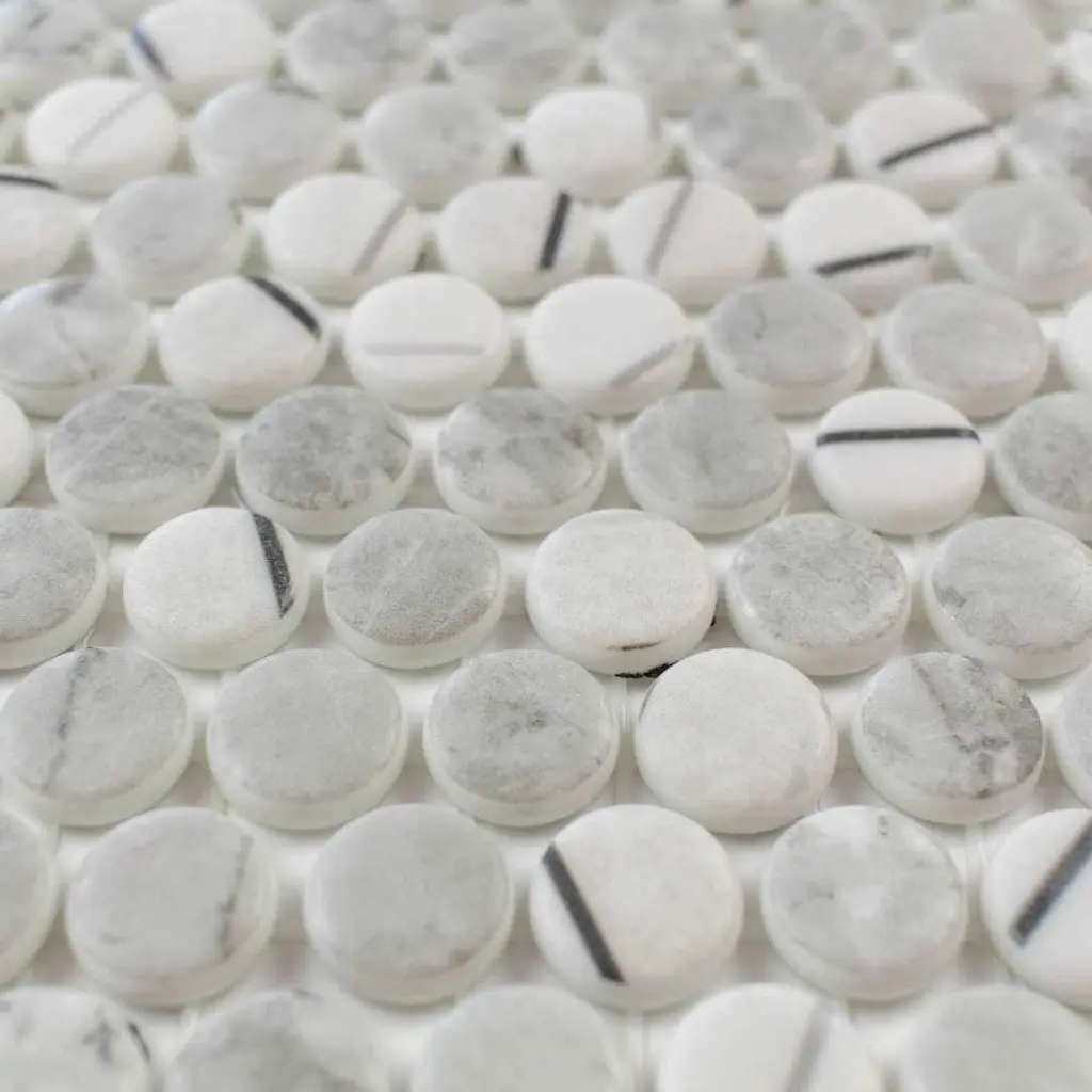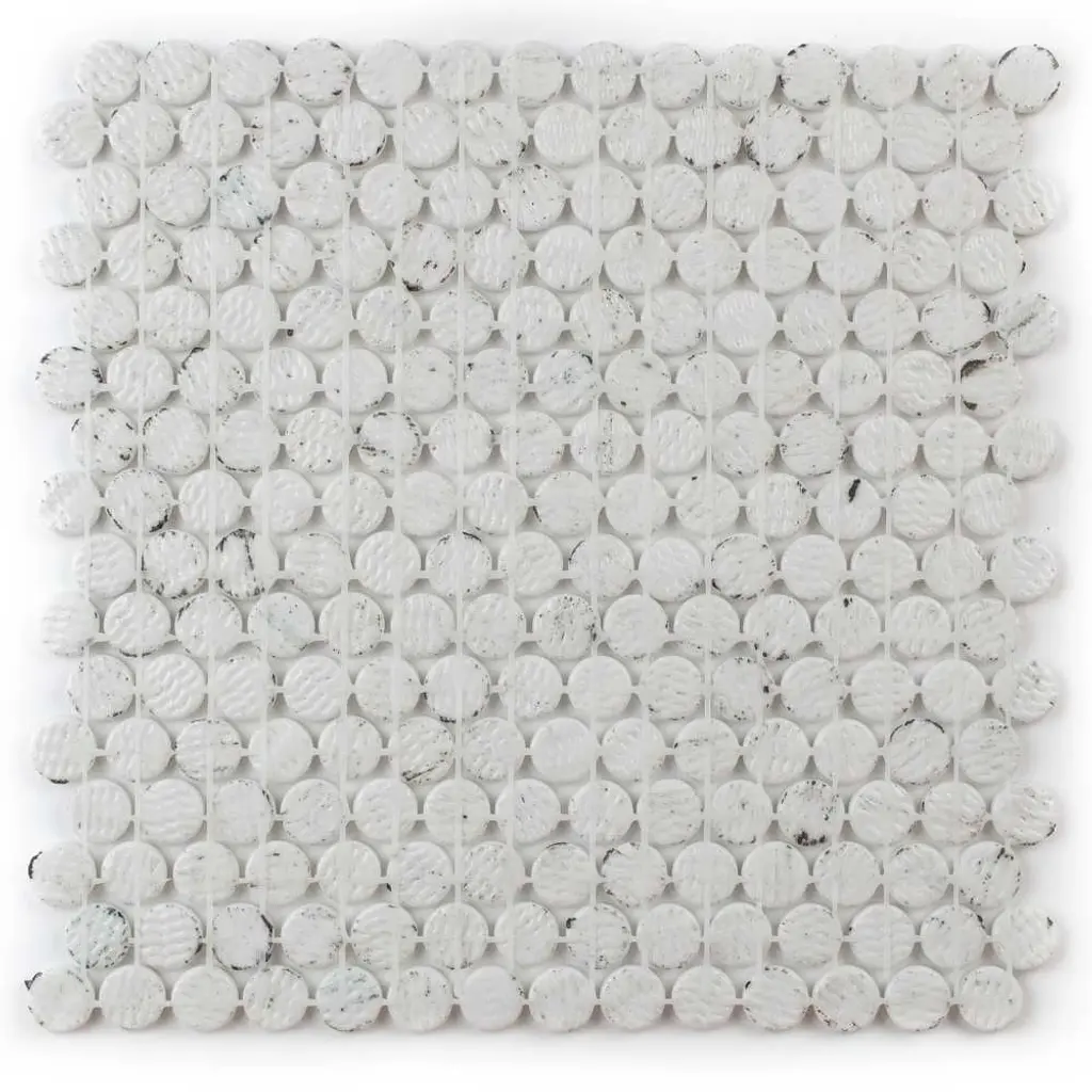 Carefully designed combinations of a timeless penny in neutral tones and subtle details designed to enhance any residential project while maintaining its originality. Our Eterna Penny Mosaic is produced from the highest quality recycled glass to create a high-end look. Made and designed in Spain, this 98% recycled sustainable mosaic is meant for both floor/ wall applications and is suitable for dry/pool/wet areas. These easy-to-install 12" x 12" decorative penny round glass mosaic tiles are perfect for a wide range of applications, they're ideal for backsplashes, bathrooms, showers, kitchens, pools, fireplace surrounds, countertops, floors, and walls—both indoors and out. Designed for use in dry or wet areas, these versatile glass mosaics are approved for residential and commercial installations, offering a stylish and durable solution for nearly any surface. FEATURES:DIMENSIONS: