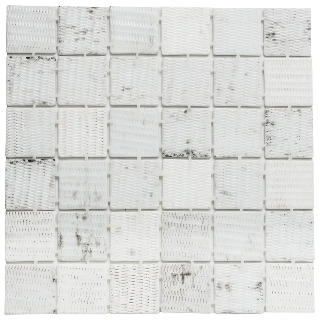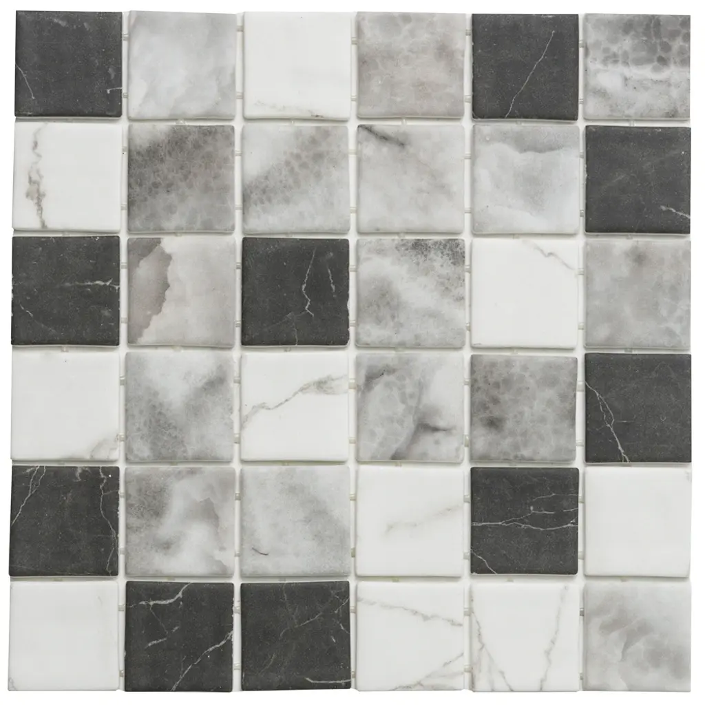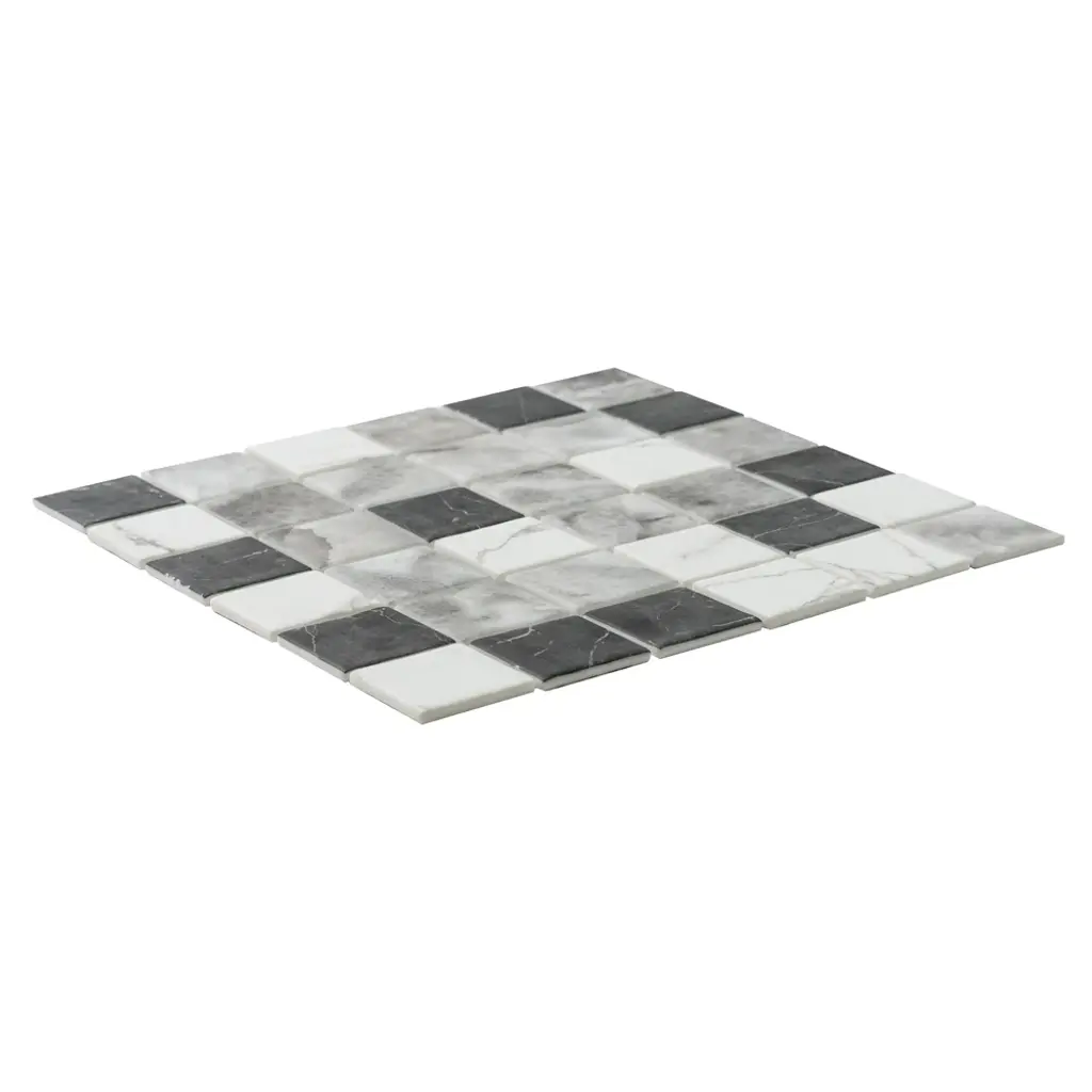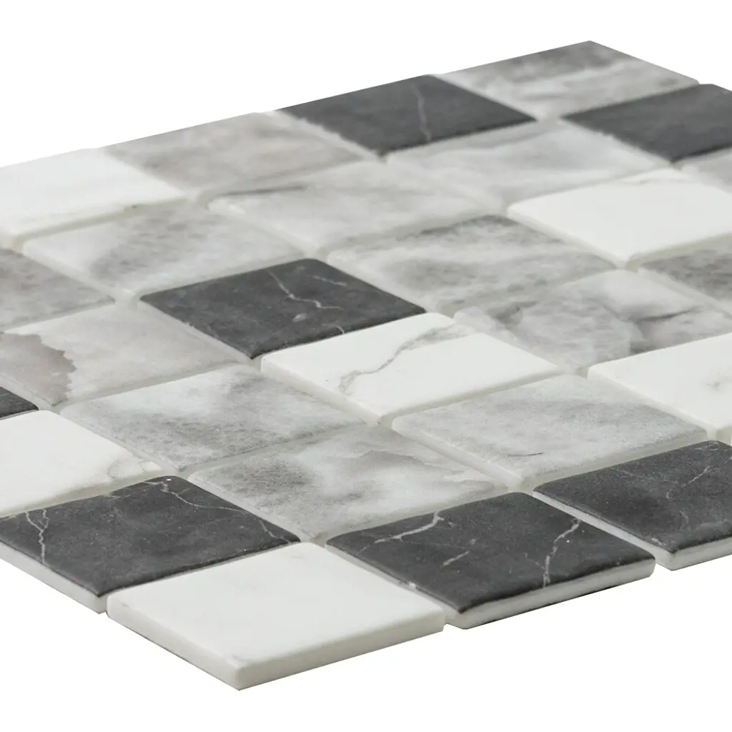 A combination of elegant marble and stone textures cover each mosaic. Endless possibilities of combination for decorating environments. A grain that recalls the marble finesse and realistically recreates the stones, taking us to its natural origin. Made and designed in Spain, this 98% recycled sustainable mosaic is meant for both floor/ wall application and suitable for dry/ pool/wet areas. PEI 3 is 750, 900, 1200, 1500 revolutions Light to moderate traffic. Average domestic homes. Countertops, walls, and floors for normal foot traffic. Waterproof, impervious and submersible tile. The box contains 1 piece per case, which equals to 1 square feet. FEATURES: DIMENSIONS: