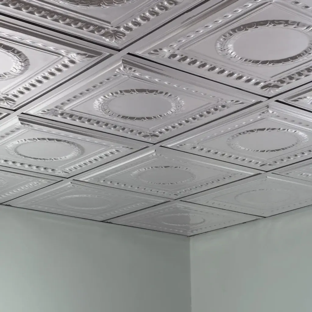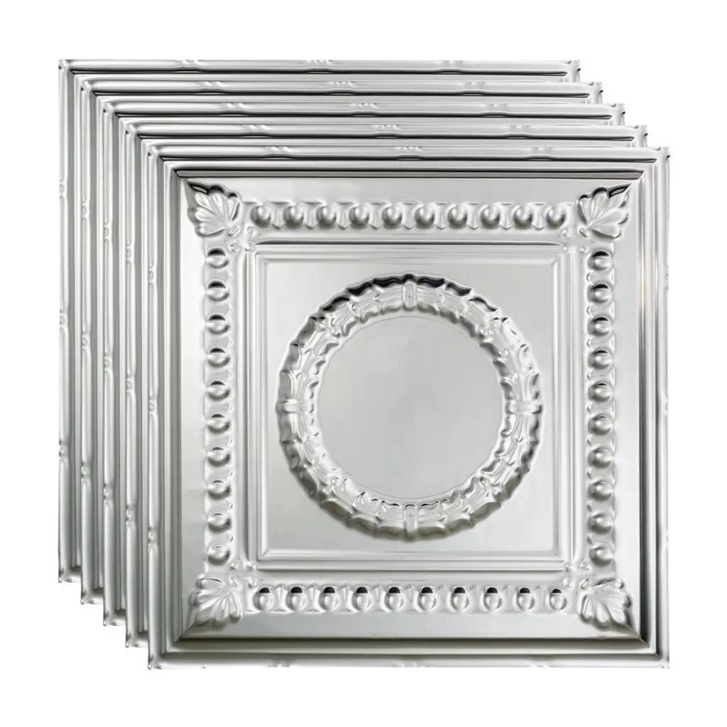 Fasäde Rosette Decorative Vinyl 2Ft X 2Ft Lay In Ceiling Panel In Brushed Aluminum (5 Pack) - 12in X 12in Sample - Brushed Aluminum