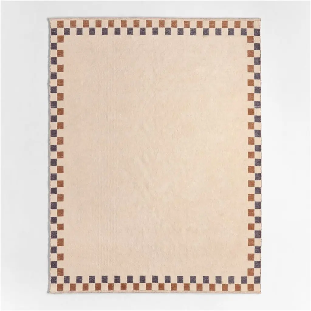 Try it on first. Because color representation may vary by screen, using a swatch is an easy way to see exactly how your favorite rugs will look in your home. Our rug swatches ship free and can be returned online or at a store near you for a full refund. It's fast, easy and free.Inspired by classic racing flags, this rug's two-tone checkered border brings a modern, graphic touch to bedrooms, playrooms and nurseries alike. Handwoven in a chenille-cotton blend, the flatweave construction creates a silky texture with a subtle sheen and ultra-soft cushioning underfoot. It's a fresh foundation that's built for comfort and everyday adventures.