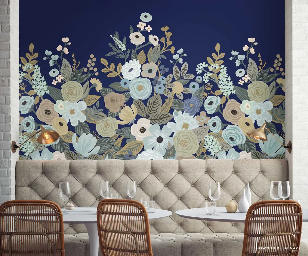 8 × 10" sample of our Garden Party Mural. Create a statement wall with the colorful blooms of our Garden Party mural. Our classic floral is lush and full at the bottom, and delicately tapers off as it grows up the wall. Please note that wallpaper samples are cut at random, and pattern placement of the sample you receive will not match the photo featured here.