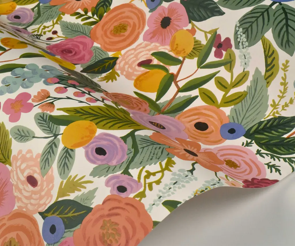 8 × 10" sample of our Garden Party wallpaper. Our classic floral, Garden Party, is an array of bold bouquets and fruit. The scale makes a statement in both bright and neutral colorway options. Please note that wallpaper samples are cut at random, and pattern placement of the sample you receive will not match the photo featured here.