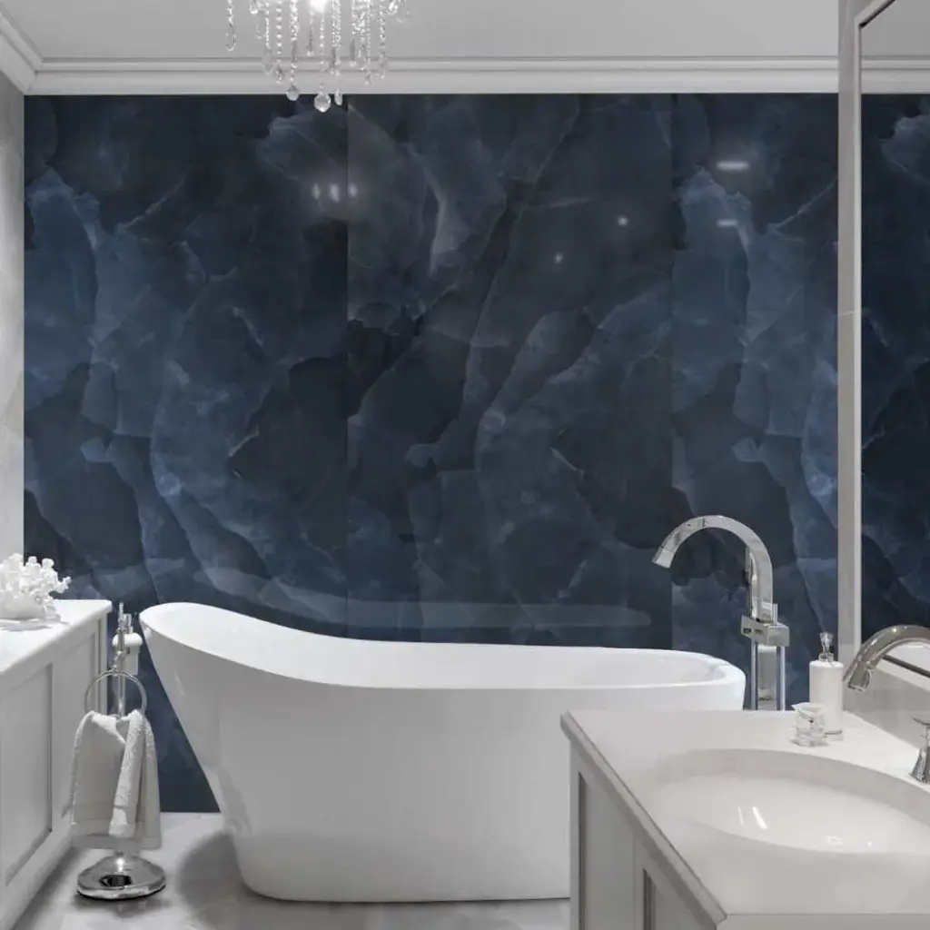 The Tile Life Geo Lust collection is a high-visual, glamorous set of neutral and jewel-toned tiles. Each tile has its striking veining that creates a watercolored contrast towards the rest of the tile. When put together, these large-format tiles perfectly recreate the look of natural onyx. This collection's matte and highly polished finishes embolden the potential for a rich and alluring home style. FEATURES: Porcelain tile for flooring and wall use Glossy porcelain Porcelain marble look tile Impervious and waterproof V3 Moderate variation Rectified, straight edge PEI 2 Easy to install 24" x 48" large format rectangle porcelain tile Grade 1, first quality product Great for bathroom, shower, kitchen, fireplace surround, floor, wall DIMENSIONS: Individual tile size: 24-inch x 48-inch Surface area per carton: 15.5 square feet