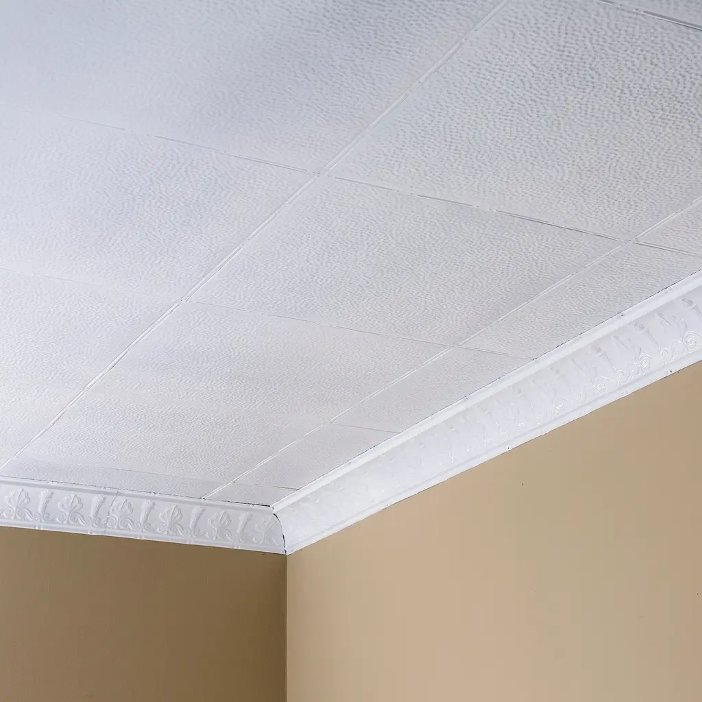 Great Lakes Tin Ceilings provide the classic look of yesteryear with authentic recreations that make a lasting impression in any space. The ceiling tiles are available in both nail-up and lay-in options in numerous styles and finishes. The nail-up tiles are easily applied with nails, screws, or glue. Finish options range from antique or gloss white to bronze burst and copper offerings. Two crown molding styles are also available and provide a finished look to your project. Panels can be cut with tin snips and allow homeowners to achieve a professional look at an affordable price. • Safer than standard tiles; Great Lakes Tin uses only premium-grade 29-gauge tin-plated steel, tested and awarded the Class A 1-Hour Fire Rating • Cut to fit any space; These tiles can be easily cut with tin snips, trimmed to any shape or size to fit your targeted area • Not just for ceilings; Great Lakes Tin tiles can be used to create an antiqued backsplash or rustic accent wall in your home; choose the finish that complements your decor and get to DIY-ing • Easy to install; Lightweight and durable, these tin tiles come in packs of five 2ft x 2ft panels, preventing the trouble and danger of dealing with bulky sheets of metal; simply drop in the tiles to create a beautiful new ceiling in no time; matching crown molding is also available • High quality materials; Tiles are made from genuine tin-plated steel, not plastic or foam board; achieve the rustic authenticity you envision with our one-of-a-kind tin ceiling panels; The Matte White tile has a soft, satin white finish with a matte topcoat