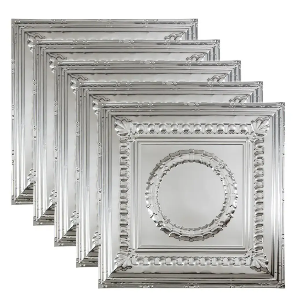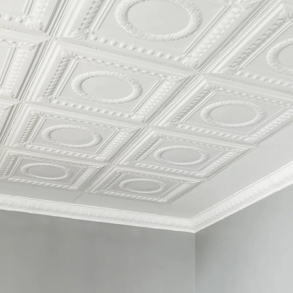 Great Lakes Tin Ceilings provide the classic look of yesteryear with authentic recreations that make a lasting impression in any space. The ceiling tiles are available in both nail-up and lay-in options in numerous styles and finishes. The nail-up tiles are easily applied with nails, screws, or glue. Finish options range from antique or gloss white to bronze burst and copper offerings. Two crown molding styles are also available and provide a finished look to your project. Panels can be cut with tin snips and allow homeowners to achieve a professional look at an affordable price. • Safer than standard tiles; Great Lakes Tin uses only premium-grade 29-gauge tin-plated steel, tested and awarded the Class A 1-Hour Fire Rating • Cut to fit any space; These tiles can be easily cut with tin snips, trimmed to any shape or size to fit your targeted area • Not just for ceilings; Great Lakes Tin tiles can be used to create an antiqued backsplash or rustic accent wall in your home; choose the finish that complements your decor and get to DIY-ing • Easy to install; Lightweight and durable, these tin tiles come in packs of five 2ft x 2ft panels, preventing the trouble and danger of dealing with bulky sheets of metal; simply drop in the tiles to create a beautiful new ceiling in no time; matching crown molding is also available • High quality materials; Tiles are made from genuine tin-plated steel, not plastic or foam board; achieve the rustic authenticity you envision with our one-of-a-kind tin ceiling panels; The Matte White tile has a soft, satin white finish with a matte topcoat