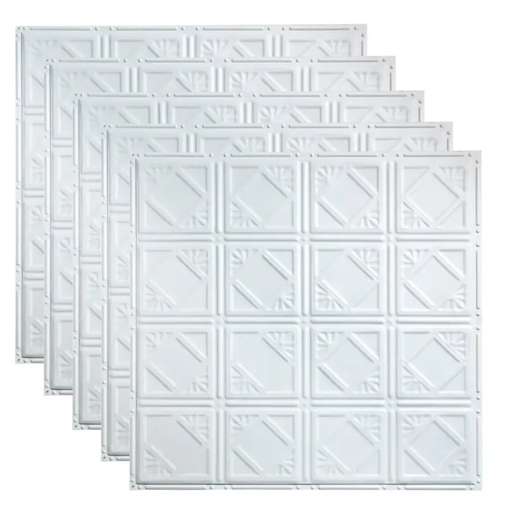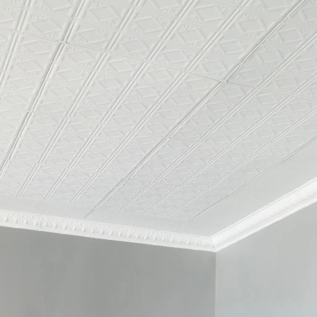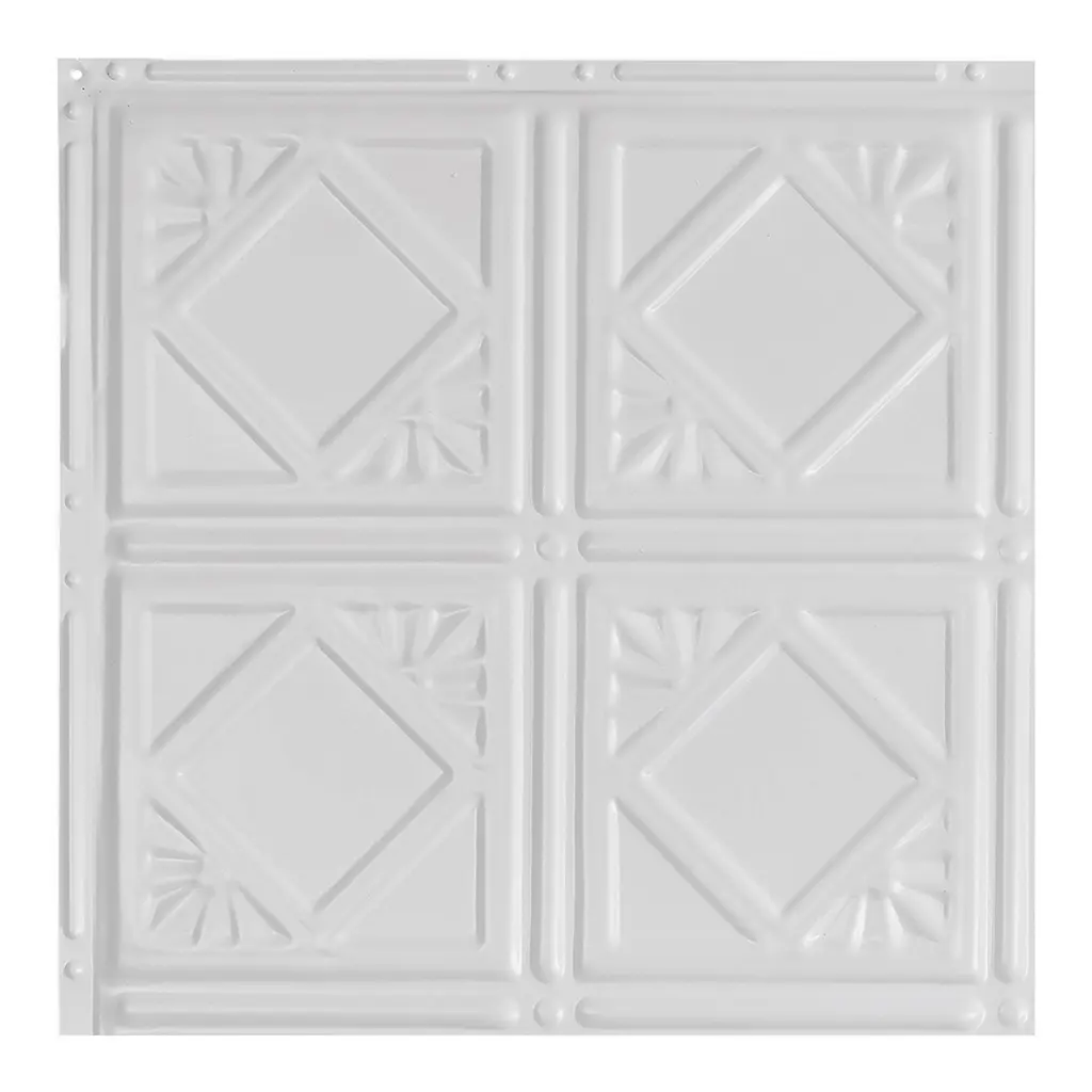 Great Lakes Tin Ceilings provide the classic look of yesteryear with authentic recreations that make a lasting impression in any space. The ceiling tiles are available in both nail-up and lay-in options in numerous styles and finishes. The nail-up tiles are easily applied with nails, screws, or glue. Finish options range from antique or gloss white to bronze burst and copper offerings. Two crown molding styles are also available and provide a finished look to your project. Panels can be cut with tin snips and allow homeowners to achieve a professional look at an affordable price. • Safer than standard tiles; Great Lakes Tin uses only premium-grade 29-gauge tin-plated steel, tested and awarded the Class A 1-Hour Fire Rating • Cut to fit any space; These tiles can be easily cut with tin snips, trimmed to any shape or size to fit your targeted area • Not just for ceilings; Great Lakes Tin tiles can be used to create an antiqued backsplash or rustic accent wall in your home; choose the finish that complements your decor and get to DIY-ing • Easy to install; Lightweight and durable, these tin tiles come in packs of five 2ft x 2ft panels, preventing the trouble and danger of dealing with bulky sheets of metal; simply drop in the tiles to create a beautiful new ceiling in no time; matching crown molding is also available • High quality materials; Tiles are made from genuine tin-plated steel, not plastic or foam board; achieve the rustic authenticity you envision with our one-of-a-kind tin ceiling panels; The Matte White tile has a soft, satin white finish with a matte topcoat