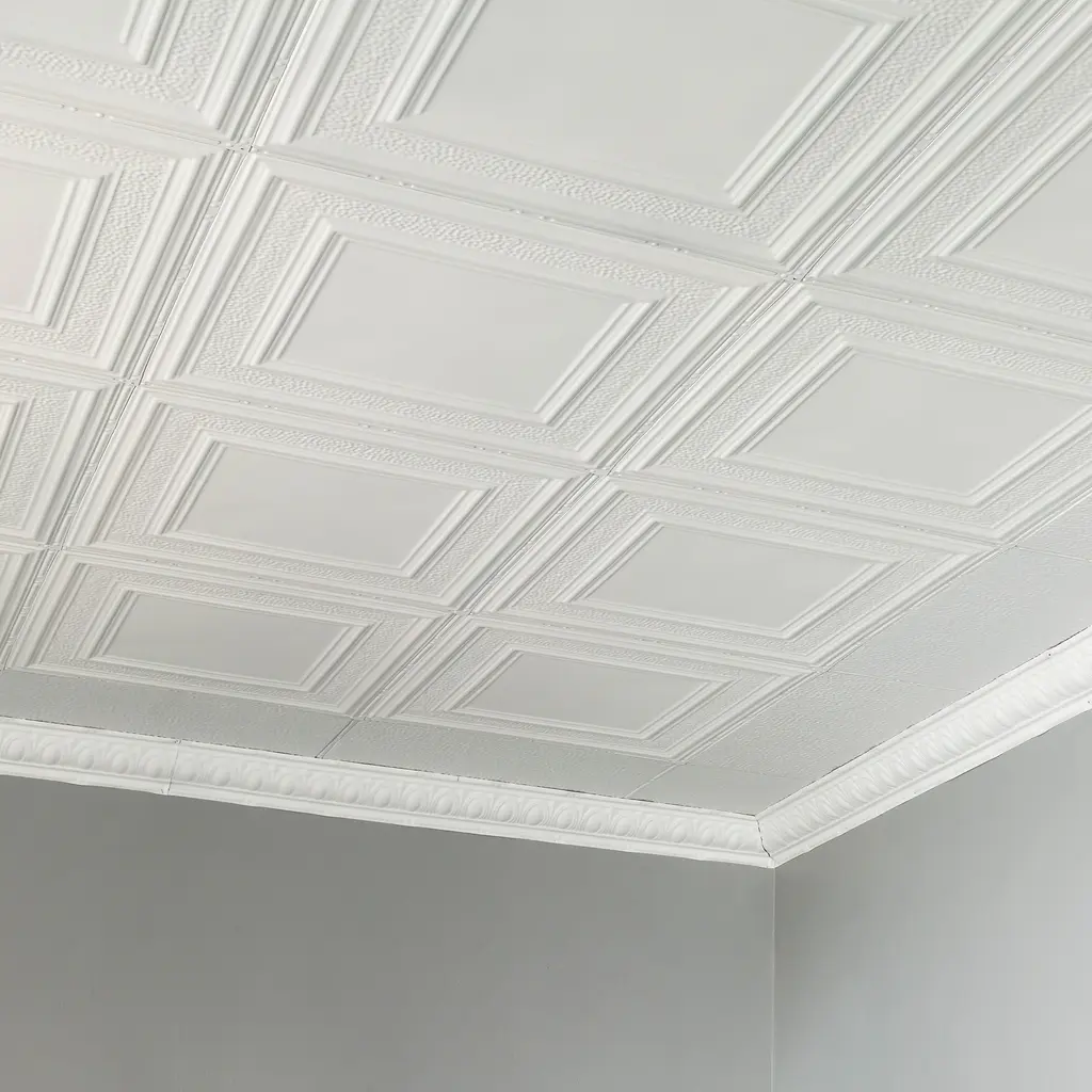 Great Lakes Tin Ceilings provide the classic look of yesteryear with authentic recreations that make a lasting impression in any space. The ceiling tiles are available in both nail-up and lay-in options in numerous styles and finishes. The nail-up tiles are easily applied with nails, screws, or glue. Finish options range from antique or gloss white to bronze burst and copper offerings. Two crown molding styles are also available and provide a finished look to your project. Panels can be cut with tin snips and allow homeowners to achieve a professional look at an affordable price. • Safer than standard tiles; Great Lakes Tin uses only premium-grade 29-gauge tin-plated steel, tested and awarded the Class A 1-Hour Fire Rating • Cut to fit any space; These tiles can be easily cut with tin snips, trimmed to any shape or size to fit your targeted area • Not just for ceilings; Great Lakes Tin tiles can be used to create an antiqued backsplash or rustic accent wall in your home; choose the finish that complements your decor and get to DIY-ing • Easy to install; Lightweight and durable, these tin tiles come in packs of five 2ft x 2ft panels, preventing the trouble and danger of dealing with bulky sheets of metal; simply drop in the tiles to create a beautiful new ceiling in no time; matching crown molding is also available • High quality materials; Tiles are made from genuine tin-plated steel, not plastic or foam board; achieve the rustic authenticity you envision with our one-of-a-kind tin ceiling panels; The Matte White tile has a soft, satin white finish with a matte topcoat