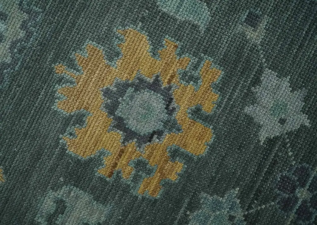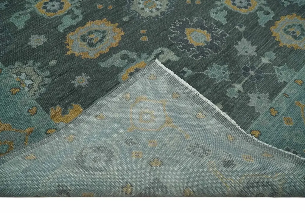 This hand-knotted Oushak Wool Area Rug is crafted with traditional styling in a charcoal and aqua colorway. Its multi-size design makes it perfect for use in multiple rooms, complementing any décor. Its wool construction ensures long-lasting quality. Hand-Knotted SIZES ARE MADE TO ORDER IN 30-45 DAYS Made with Wool Color : Charcoal and Aqua Made with 28 knots per square inch This specific rug is made in India, in the city of Bhadohi. Bhadohi is one of the biggest rug manufacturing cities. Carpet weaving in the region dates back to the 16th century during the reign of Akbar. The skilled artisans of Bhadohi have been carrying the tradition of rug-making for centuries. USERS GUIDE Avoid prolonged moisture Vacuum regularly and/or shake to remove dust Do not pull any loose threads. Use scissors to simply cut the ends The blot spills immediately with a white cloth. Harsh chemicals may damage or fade the rug Use rug protectors under heavy furniture
