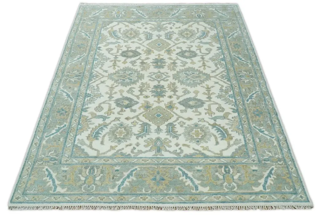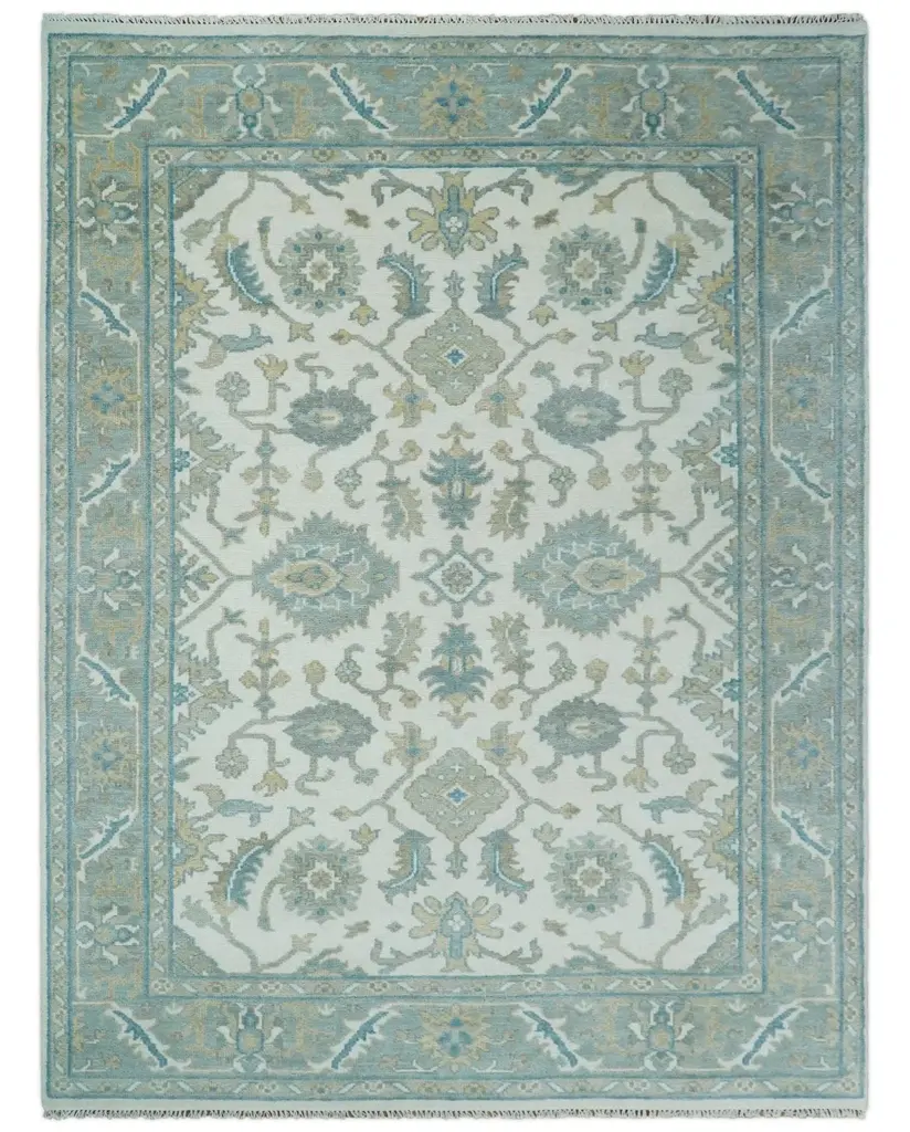Expertly crafted and hand knotted, this Oriental Oushak rug is a beautiful addition to any space. The intricate teal, ivory, and beige design adds a touch of elegance, while the high-quality wool construction ensures durability and softness underfoot. Each rug is custom made for a one-of-a-kind piece. Hand-knotted Rug Made with fine Hand-spun Wool Color: Teal, Ivory and Beige Made to order in 30-60 Days Contact us for custom sizes Oushak or Ushak rugs are Turkish rugs that use a particular family of designs. Oushak rug's origin can be traced back to the Ottoman empire. Oushak rugs are evergreen Persian rugs. A lot of Oushak rugs are machine-made now, but we have carried this legacy forward in India. Our Oushak rugs are handmade with fine imported wool in Bhadohi, which is one of the biggest rug manufacturing cities. Carpet weaving in the region dates back to the 16th century during the reign of Akbar. The skilled artisans of Bhadohi have been carrying the tradition of rug-making for centuries.USERS GUIDE Avoid prolonged moisture Vacuum regularly and/or shake to remove dust Do not pull any loose threads. Use scissors to simply cut the ends Blot spills immediately with a white cloth. Harsh chemicals may damage or fade the rug Use rug protectors under heavy furniture