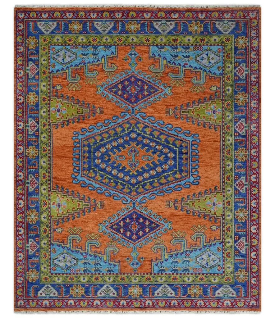 This luxurious rug features a vibrant fusion of orange, blue, and green hues, creating a rich tapestry of color. At its heart lies an intricate geometric medallion, bordered by a series of ornate, symmetrical motifs that suggest cultural influences. The texture is plush and inviting, indicative of high-quality craftsmanship. The blue and green borders are adorned with floral designs, adding elegance and sophistication. This piece expertly blends traditional aesthetics with contemporary allure, making it a striking centerpiece for any opulent interior. Product Details Color: Rust, Blue, and Olive Design: Antique Material: Wool Construction: Hand-Knotted Knots Per Inch (KPI): 25 Availability: Made to order in 30 days Size Options: Custom sizing Care Guide Vacuum regularly and shake to remove dust Avoid prolonged moisture exposure Blot spills immediately with a white cloth Use scissors to trim loose threads instead of pulling Avoid harsh chemicals to maintain color vibrancy Use rug protectors under heavy furniture