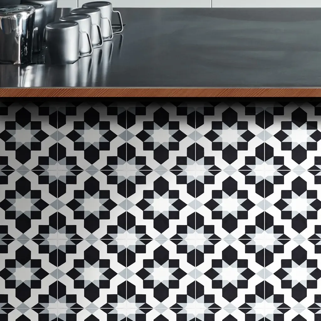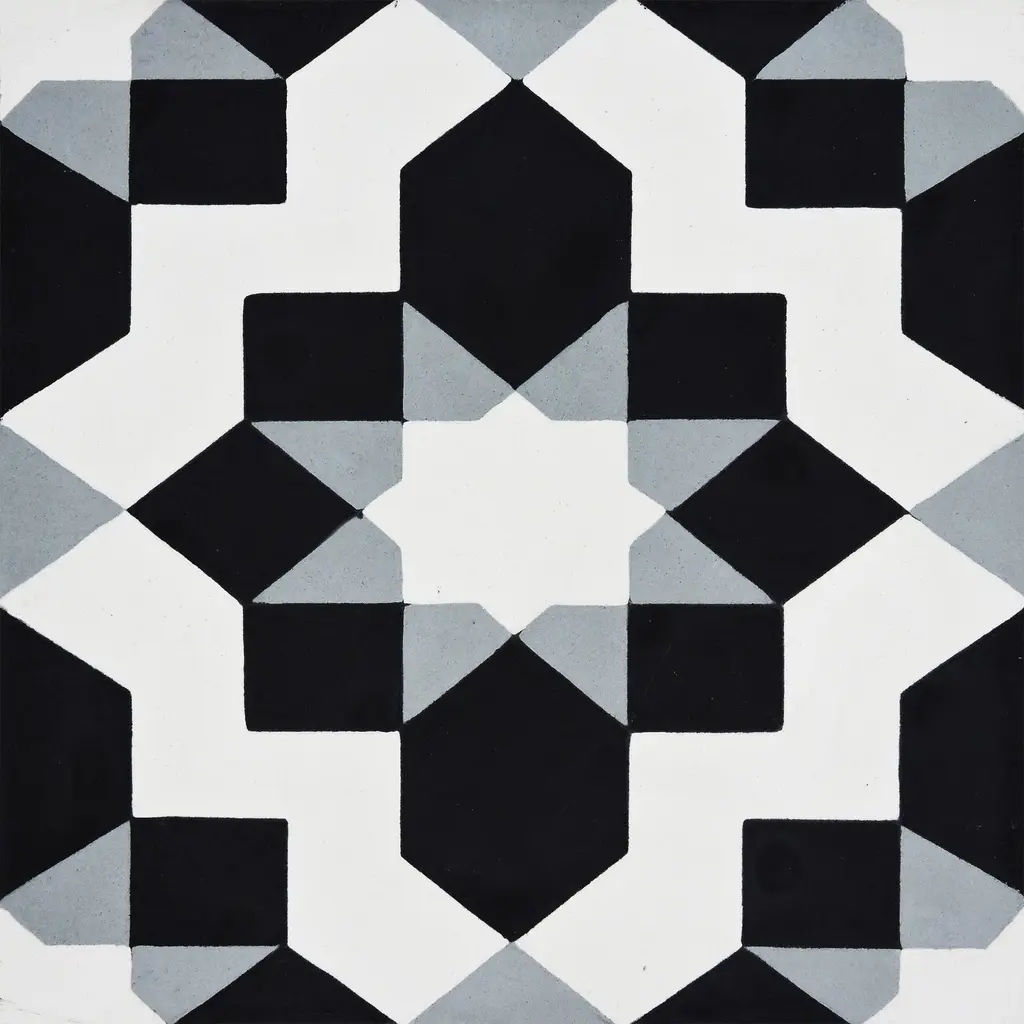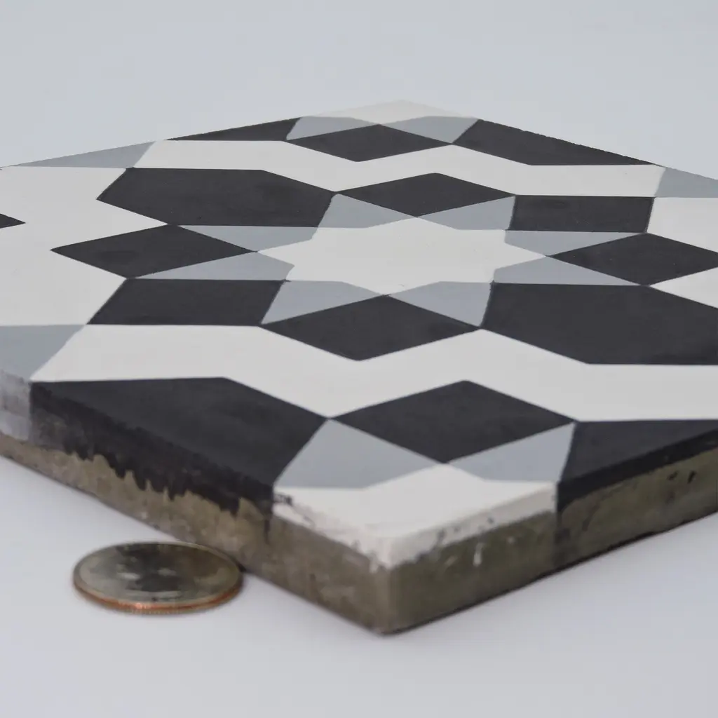 Design a dazzling backsplash, floor, or wall with these stunning tiles. Handmade by skilled Moroccan artisans for superior craftsmanship and traditional authenticity. These decorative tiles made from cement are durable indoors and outdoors. Weather-resistant and waterproof, the eco-friendly Moroccan tiles support your commitment to a greener home. Features:Other Sections:Story Behind the Art: "It's more than tile, it's art." That simple statement is what sets the craftsmanship of Moroccan Mosaic apart from the rest. Based in the small city of Sale, Moroccan Mosaic is a family business going back 4 generations. When Simo, the current head of the business graduated from university in New York, he had little interest in the family business. But on a return trip home, he saw that the business was not doing well and set about reviving it. One important change he made was introducing black, grey, and white designs to appeal to American and European customers. It worked. When he started, they employed 2 workers and now they have nearly 80 on staff. The workshop itself is fairly simple, and the techniques used to create the tiles are steeped in tradition. Some modern equipment is available, though the workers prefer to use the more rustic tools. The creative process is time intensive and done by hand, as Simo insists on no corners be cut or production be rushed. Environmentally responsible and resource efficient, no chemicals are used at any step. For example, colors used come from nature literally. Green comes from mint leaves, orange from orange peel, and black from charcoal. The tiles themselves are a simple mixture of cement, sand, and granite powder. Moroccan Mosaic hires only local workers, teaching them a valued skill as well as paying them fair wages. Simo's goals for his business are to share the tradition of gorgeous Moroccan tile, grow the business, and employ more and more workers . Please be aware that if you order more than 151 pounds of tile or flooring, the order may need to be shipped Freight and our Oversized Item Delivery/Return policy will apply. Please click here for more information.